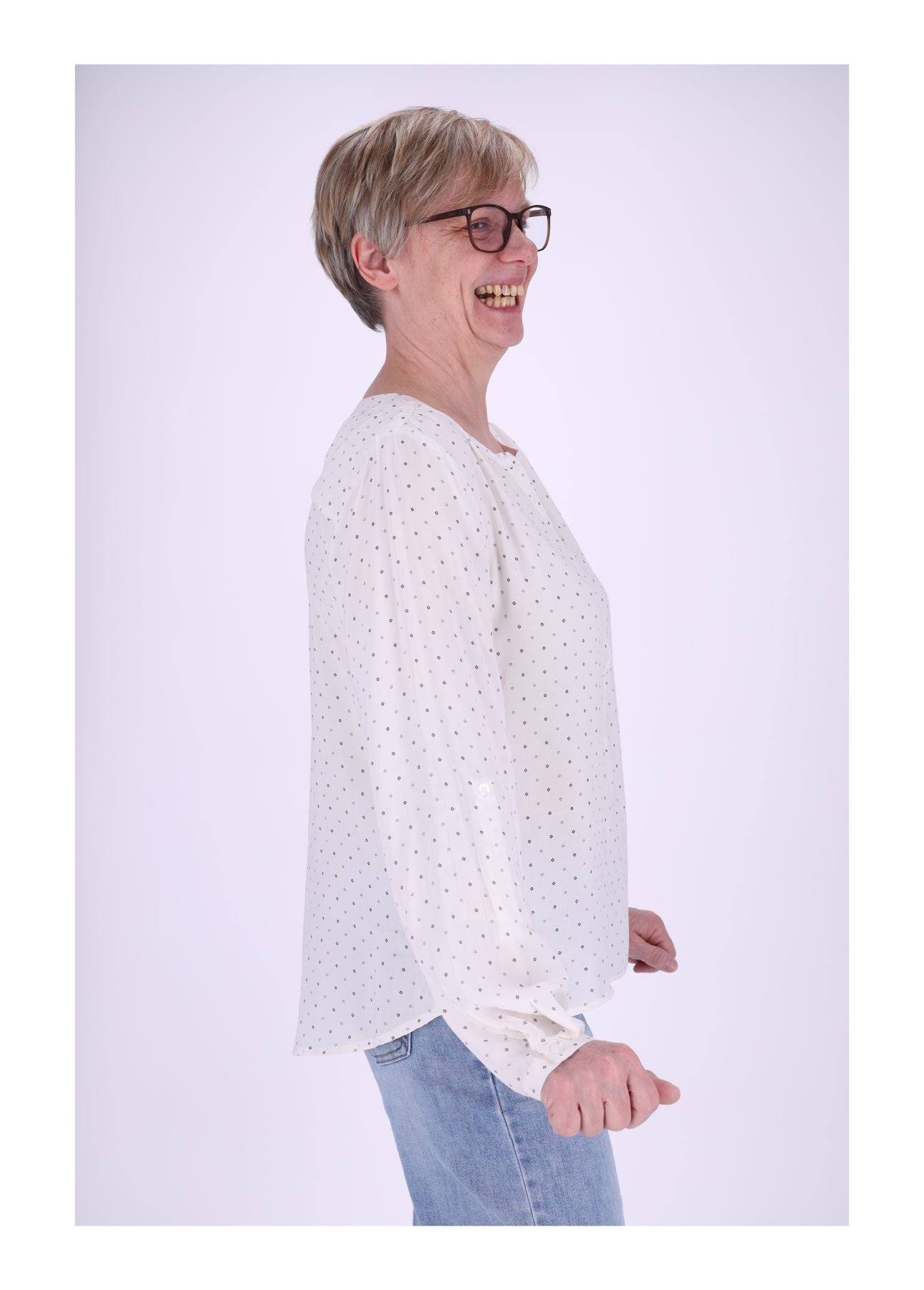Größenausfall: Dieses Blusenshirt ist bequem geschnitten und kann durchaus eine Größe kleiner getragen werden. Auf den Fotos trage ich meine reguläre Konfektionsgröße 38, die Größe 36 würde mir in dieser Bluse auch gut passen. Wer es also etwas figurbetonter mag kann die kleinere Größe wählen, dann sind die Ärmel auch etwas kürzer.