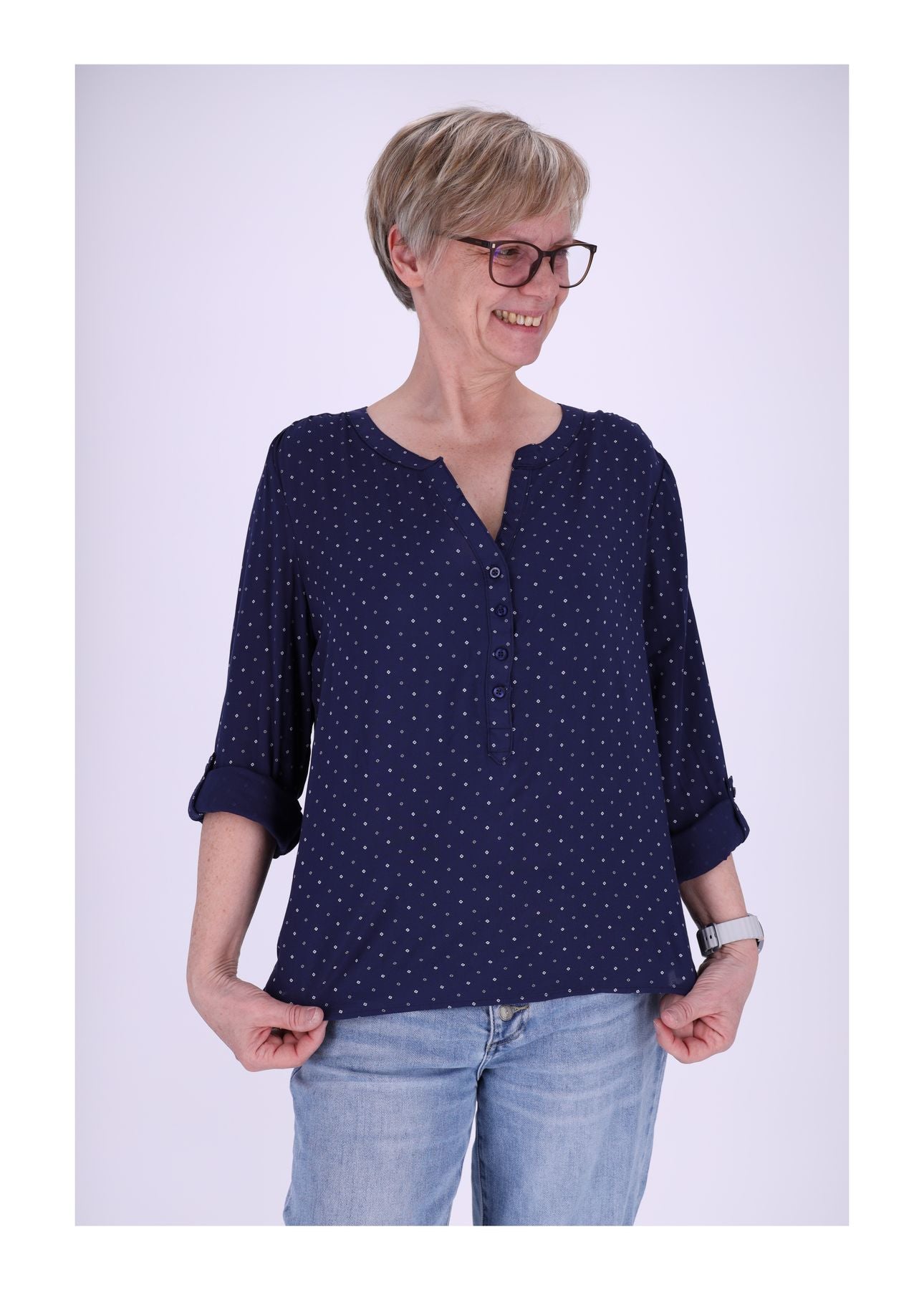 Größenausfall: Dieses Blusenshirt ist bequem geschnitten und kann durchaus eine Größe kleiner getragen werden. Auf den Fotos trage ich meine reguläre Konfektionsgröße 38, die Größe 36 würde mir in dieser Bluse auch gut passen. Wer es also etwas figurbetonter mag kann die kleinere Größe wählen, dann sind die Ärmel auch etwas kürzer.