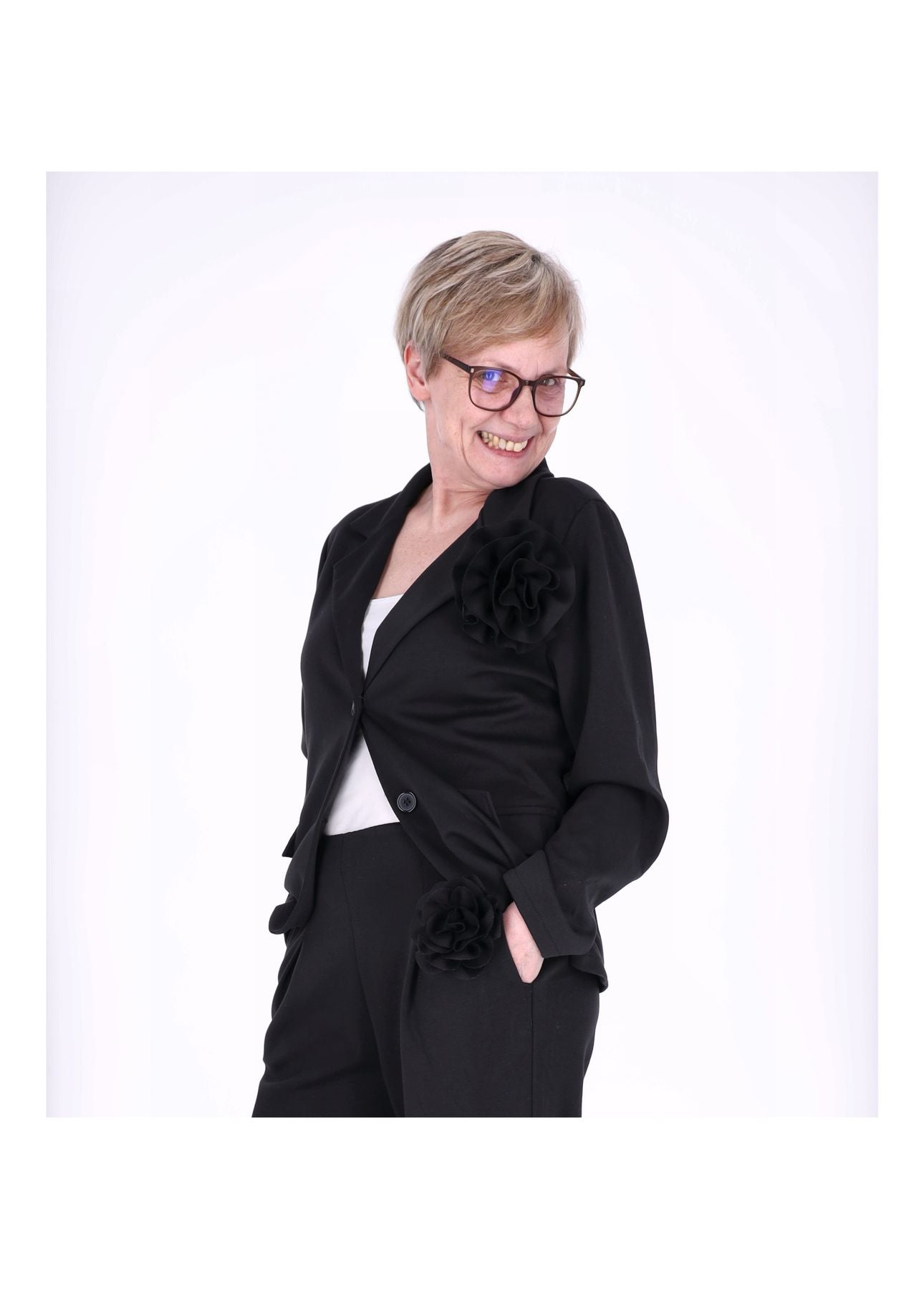 Dieser Blazer vereint zeitlose Eleganz mit modernem Komfort. Der cleane Schnitt wird durch die feminine Ansteckblüte stilvoll ergänzt und macht ihn zu einem echten Highlight – ob für besondere Anlässe, Business oder elegante Alltagslooks.