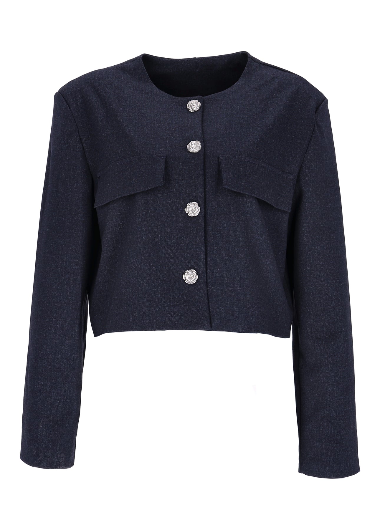 Der Kurzblazer besticht durch sein schickes und feminines Design. Besonders auffällig sind die einzigartigen Rosenknöpfe, die dem Blazer einen romantischen und dennoch professionellen Touch verleihen. Die taillierte Passform betont Ihre Figur und sorgt für eine schlanke Silhouette.