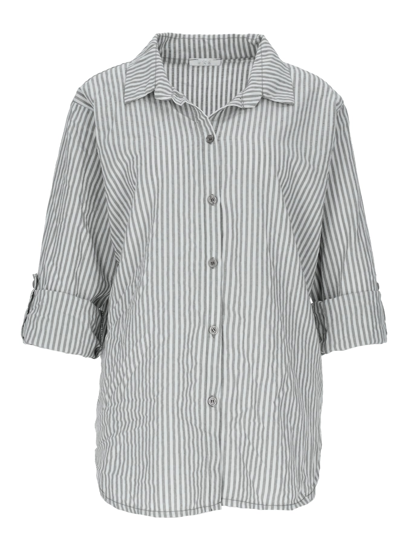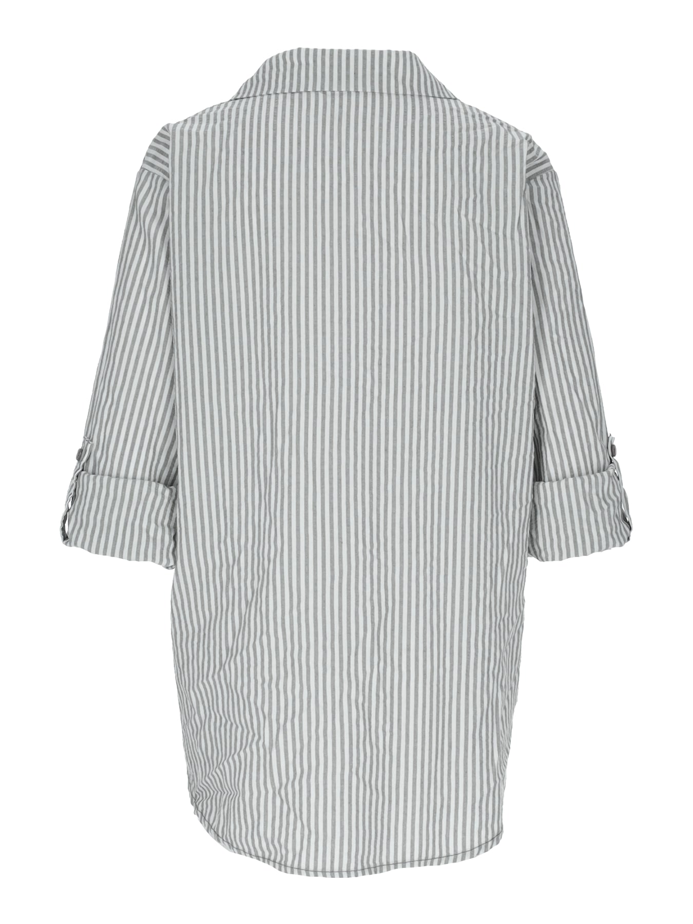 Entdecken Sie die Leichtigkeit des Sommers mit unserer Damen Krempelbluse aus luftigem Musselin, die mit einem charmanten gestreiften Muster versehen ist. Diese Bluse vereint Stil und Komfort auf harmonische Weise und ist ein unverzichtbares Kleidungsstück für sonnige Tage und warme Abende. Die leichte Beschaffenheit des Materials macht es zu einem idealen Begleiter für den Sommer und verleiht Ihnen ein Gefühl von Leichtigkeit und Freiheit. Das gestreifte Muster verleiht dieser Bluse einen Hauch von Eleganz und Raffinesse, während der Krempelärmel einen lässigen Touch hinzufügt und Ihnen die Möglichkeit bietet, Ihren Look nach Belieben anzupassen. Ob Sie die Ärmel hochkrempeln für einen entspannten Look oder sie lang tragen möchten, diese Bluse bietet Ihnen vielseitige Styling-Optionen.
