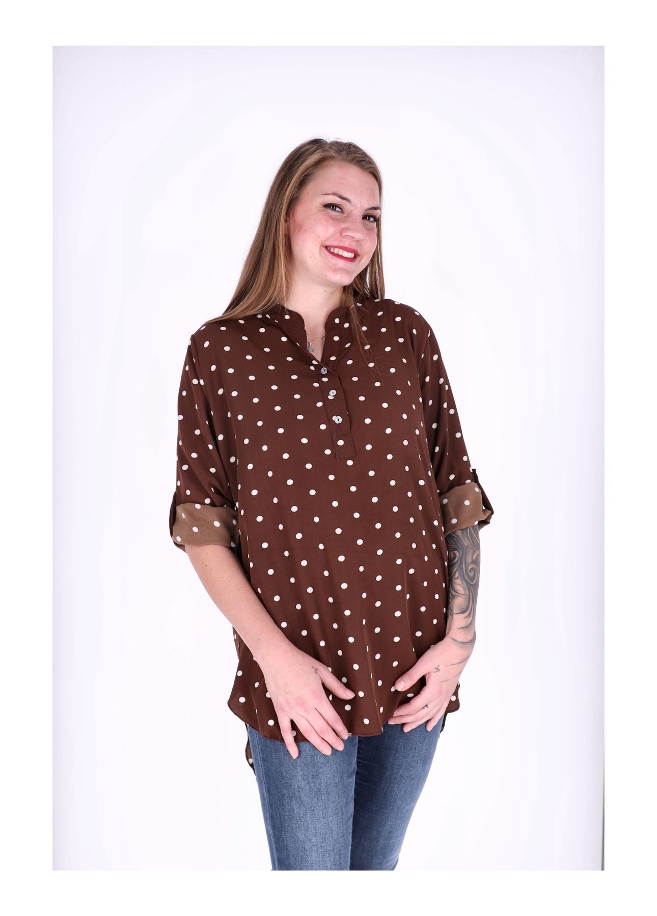 Dieses Blusenshirt vereint Komfort mit stilvollem Design. Das Allover-Punkte-Muster sorgt für einen verspielten Look, während die kleine Knopfleiste vorne dem Shirt einen femininen Akzent verleiht. Ein besonderes Detail: Die Ärmel lassen sich hochkrempeln und mit einem Knopf fixieren – praktisch und modisch zugleich.