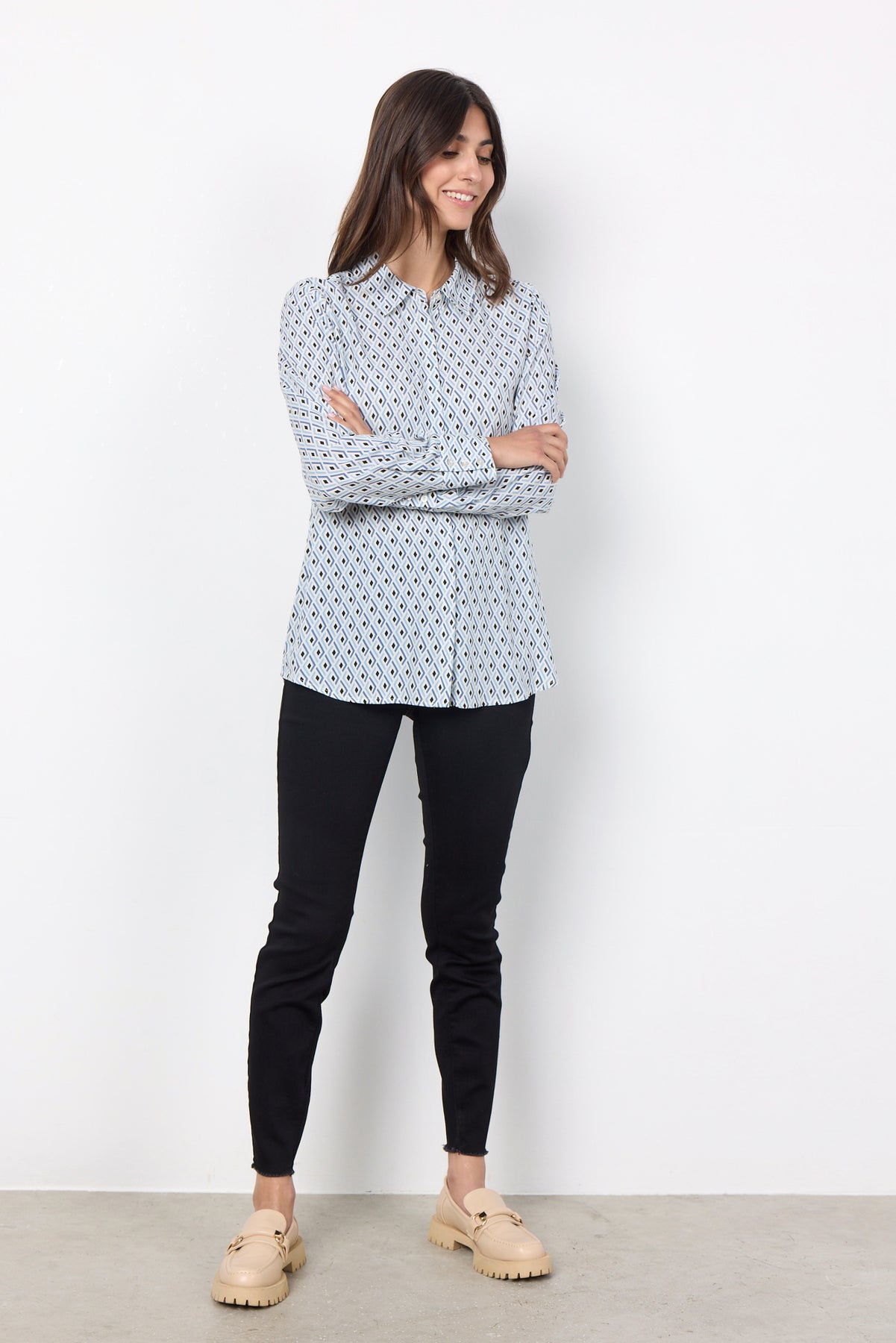 SC-Alberte 2 ist ein feminines Hemd aus 100% LENZING™ ECOVERO™ Viskose. Das Hemd hat einen klassischen Kragen, lange Ärmel, einen Knopfverschluss, eine normale Passform und einen schönen geometrischen Druck. Kombiniere dieses schöne Hemd mit Ihrer Lieblingsjeans und einem Blazer für einen schönen Alltagslook.