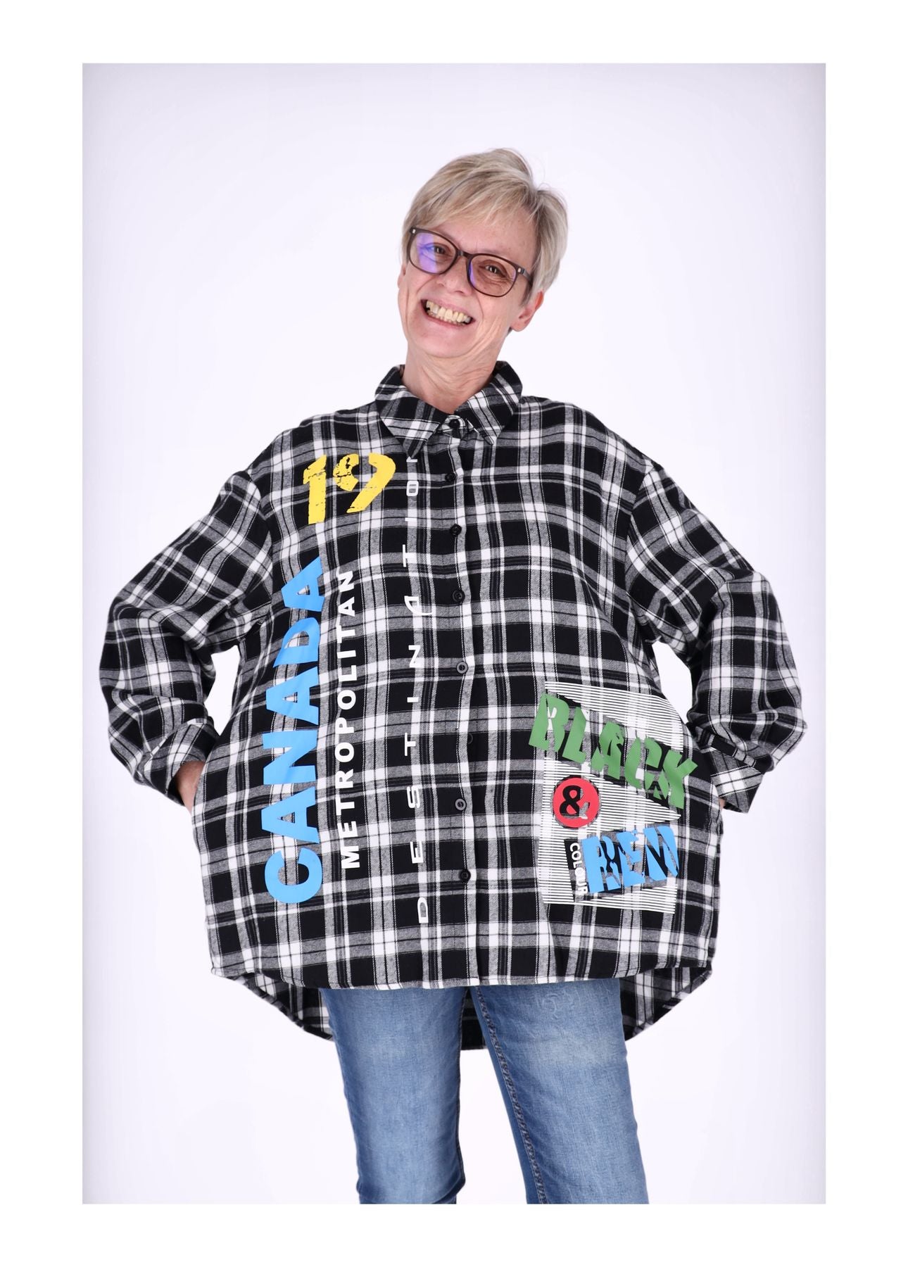Das klassische Karo-Muster wird durch verschiedene stylische Aufdrucke vorne modern interpretiert und macht die Bluse zu einem echten Hingucker. Mit der durchgehenden Knopfleiste kannst du sie offen als lässige Overshirt-Jacke tragen oder geschlossen für einen klassischen Style. Auch die Ärmel lassen sich dank Knöpfen individuell anpassen – praktisch und stylisch zugleich.