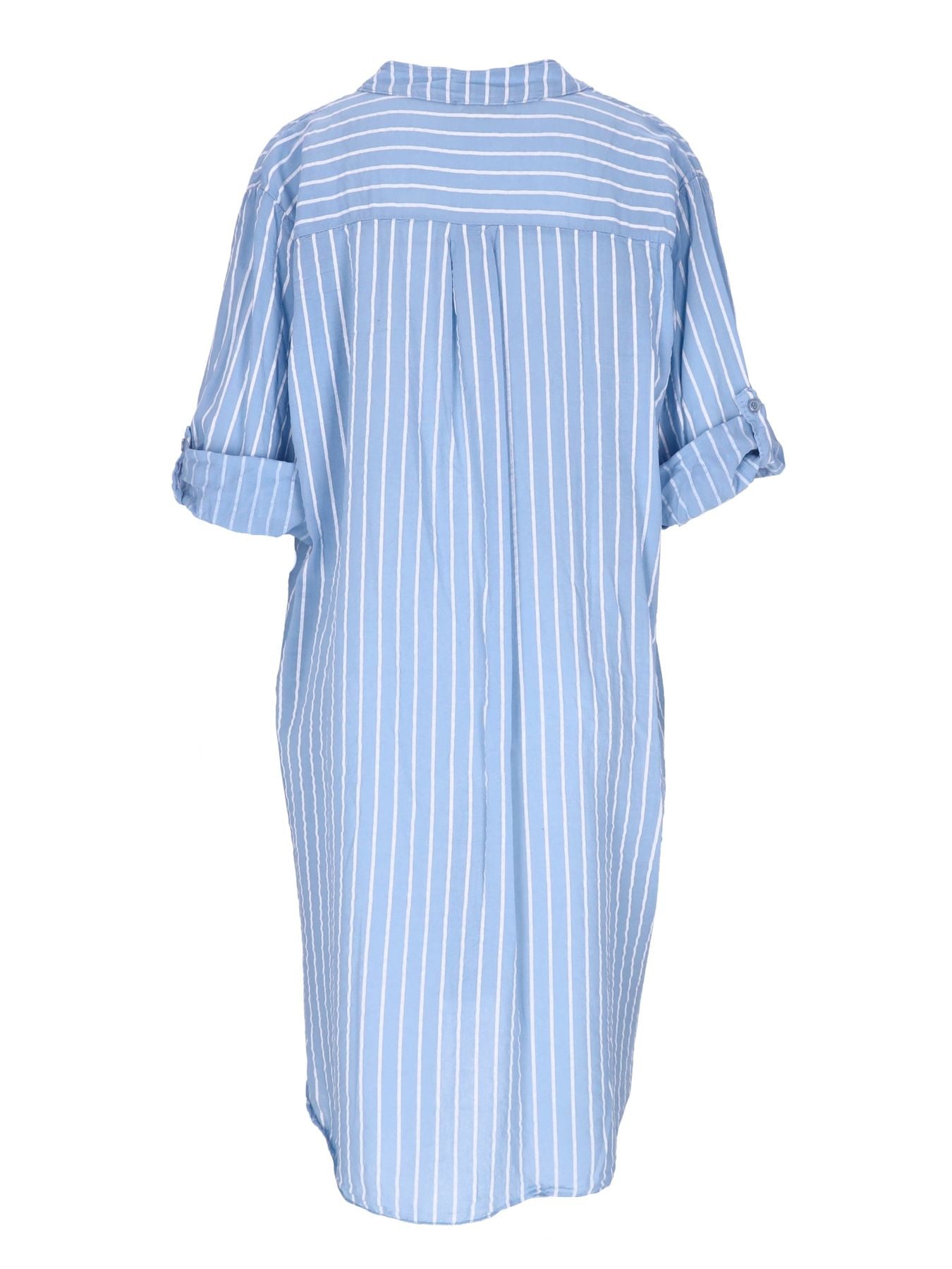 Besonders praktisch: Der 3/4-Arm lässt sich krempeln und mit einem Riegel fixieren, sodass du die Bluse je nach Temperatur und Anlass flexibel tragen kannst. Ein kleiner Stehkragen mit anschließendem V-Ausschnitt verleiht dem Look eine feminine und zugleich lässige Note. Zwei kleine Brusttaschen runden das Design funktional und stilvoll ab.