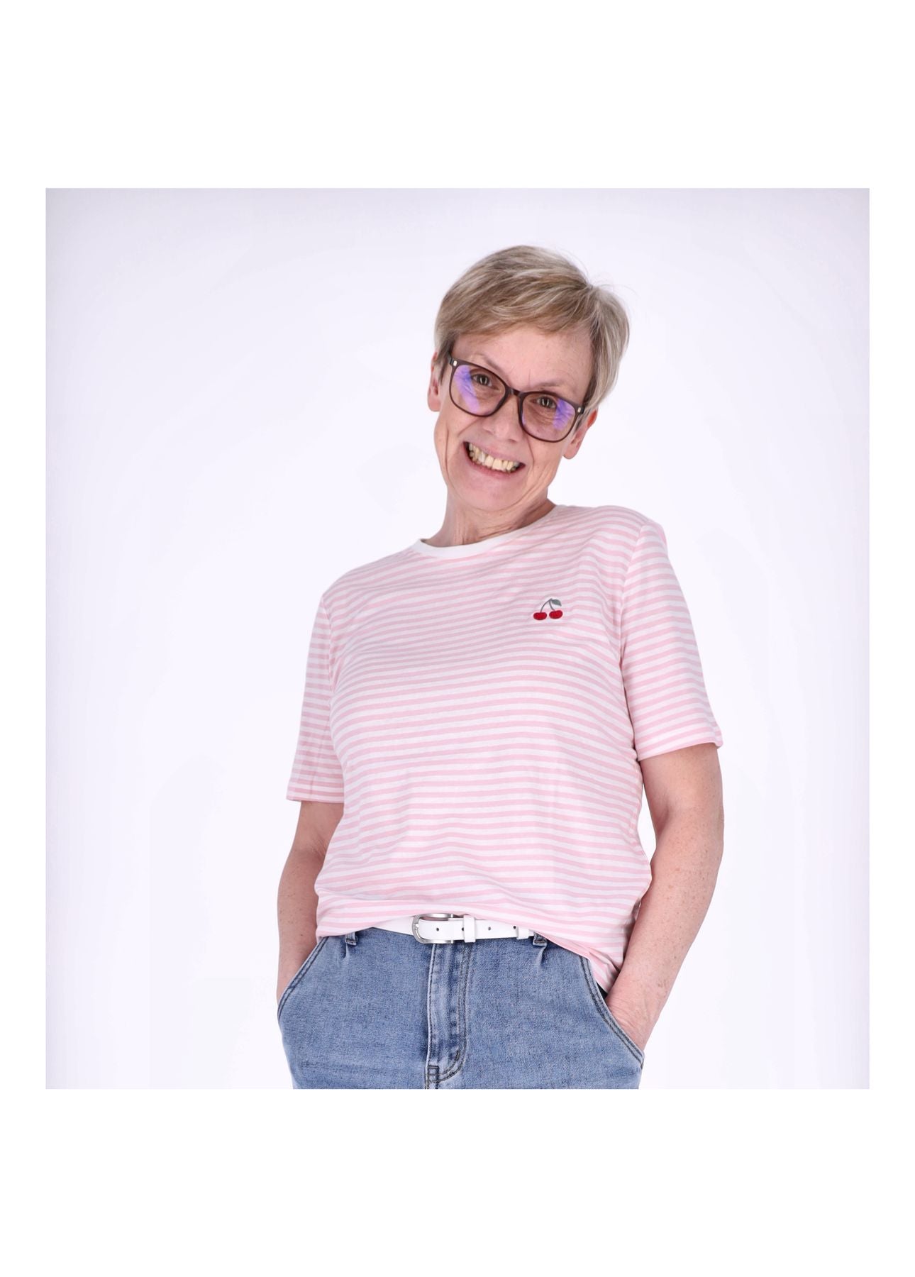 Frisches Damen T-Shirt aus Bio-Baumwolle mit sommerlichem Streifenlook und verspieltem Kirsch-Aufnäher als Eyecatcher. Der klassische Rundhalsausschnitt mit Kontrastbündchen und die kurzen Ärmel sorgen für einen zeitlosen, bequemen Stil – ideal für Alltag und Freizeit.