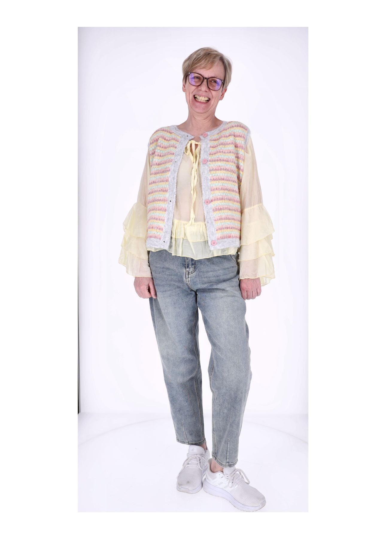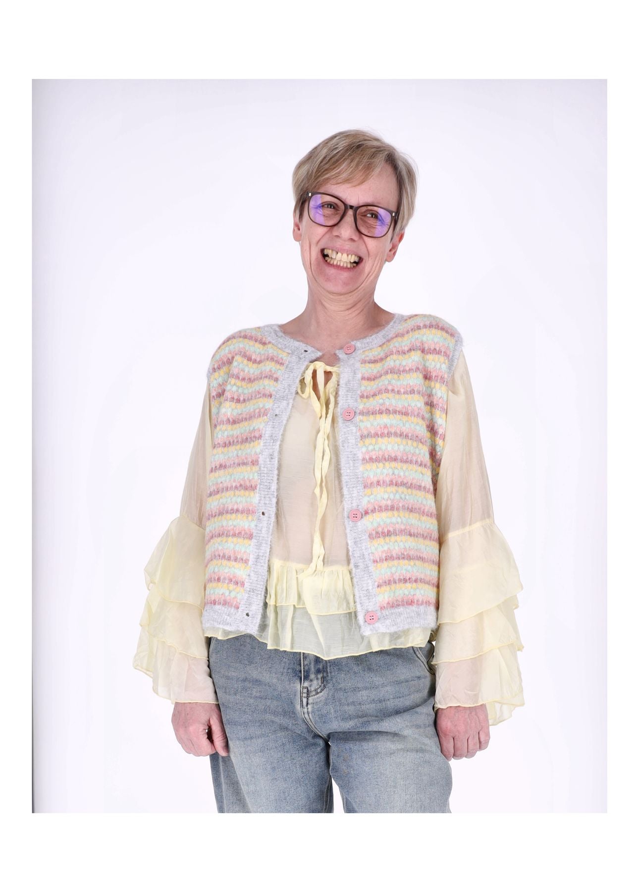 Diese Damen-Strickweste setzt mit ihrem bunten Streifenmuster frische Akzente. Die strukturierte Strick-Optik, der Rundhalsausschnitt und die Kontrastknöpfe verleihen der Weste einen modernen, verspielten Look. Der modisch verkürzte Schnitt macht sie ideal für trendige Layering-Outfits.