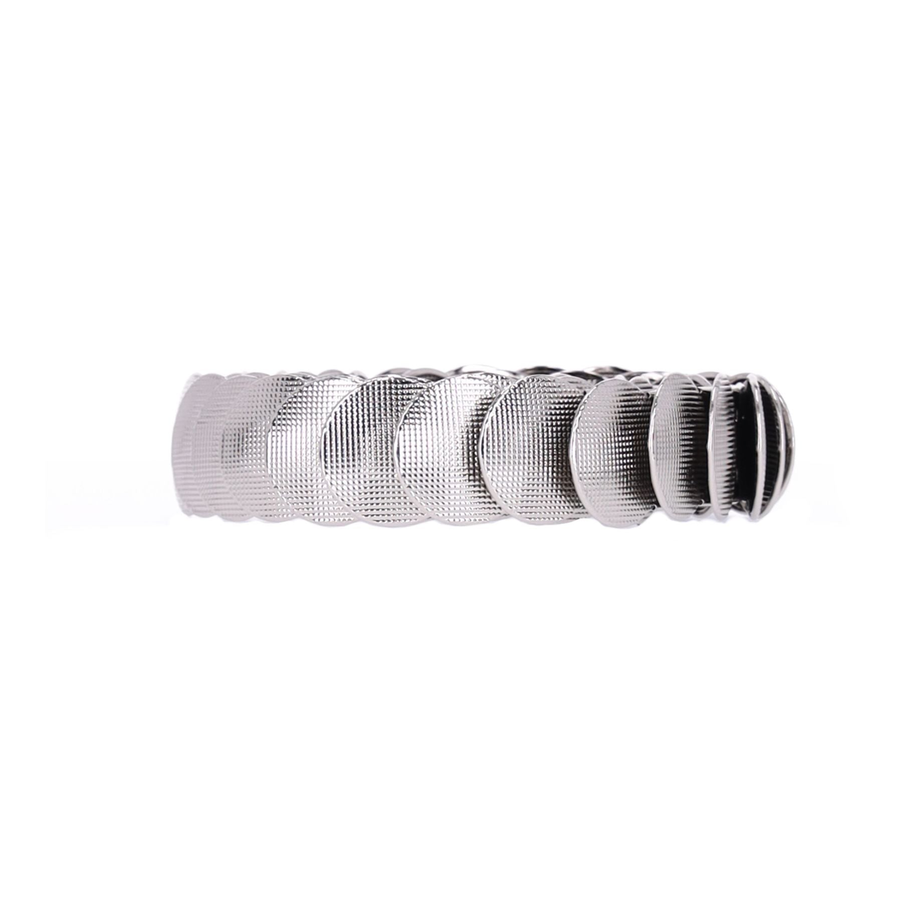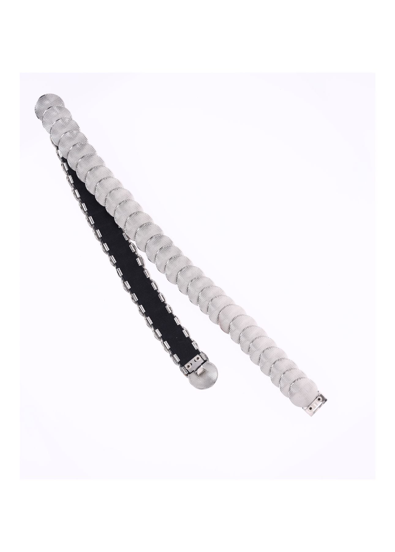 Hinten sorgt ein elastischer Gummizug für perfekten Sitz und hohen Tragekomfort, während vorne runde, glänzende Metallplatten in Kreisform ein echtes Fashion-Statement setzen. Dieser Gürtel ist nicht nur praktisch, sondern auch ein Hingucker, der selbst schlichte Outfits sofort aufwertet.