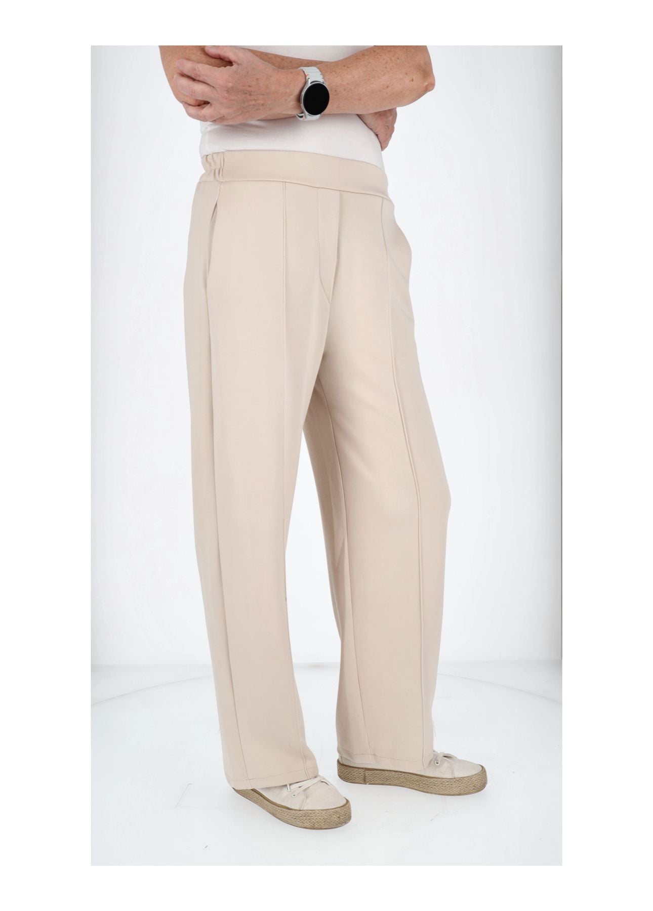 Das Beste: Der elastische Gummizug hinten sorgt für Komfort, während das breite Gummiband vorne für einen trendigen, sicheren Sitz sorgt – da sitzt einfach alles, wo es soll! Und mit den praktischen zwei Einschubtaschen links und rechts hast du deine Essentials immer griffbereit. Die schicken Ziernähte an beiden Seiten verleihen der Hose den letzten modischen Schliff.