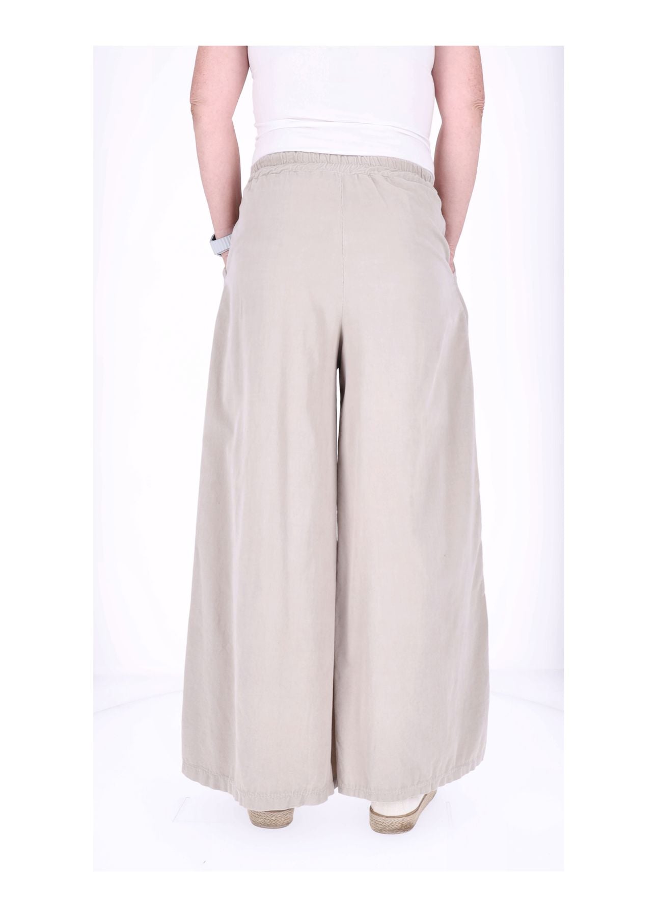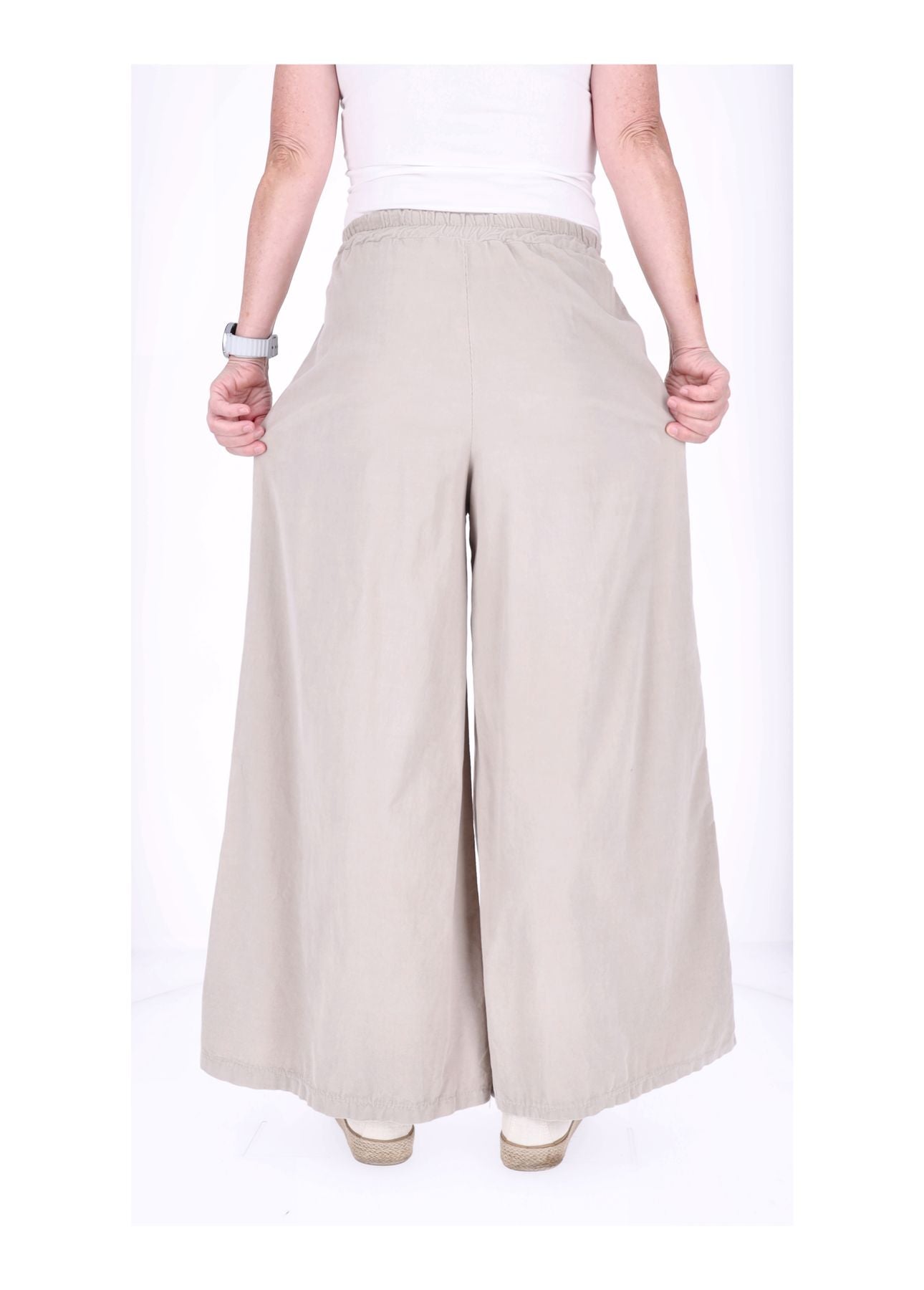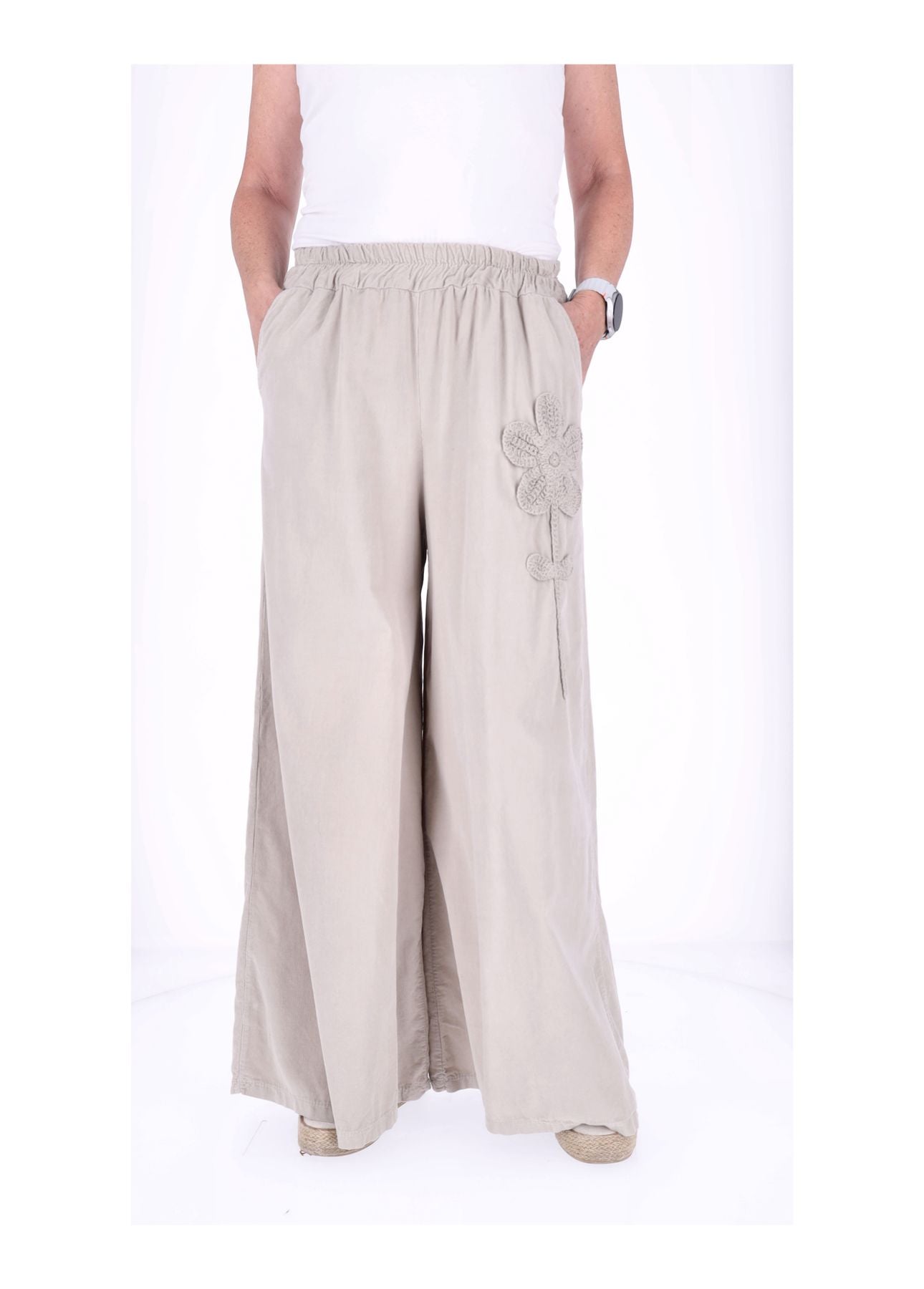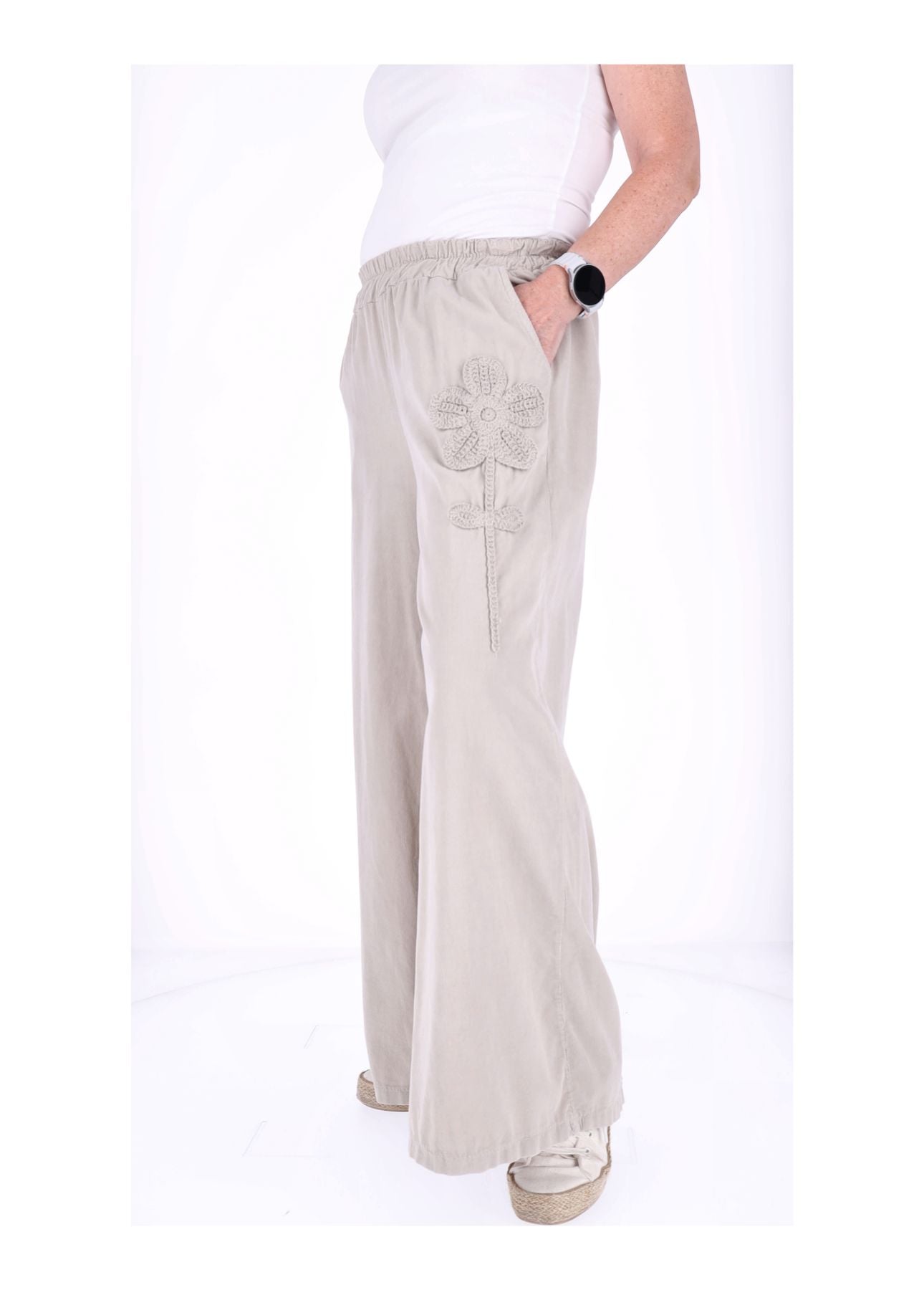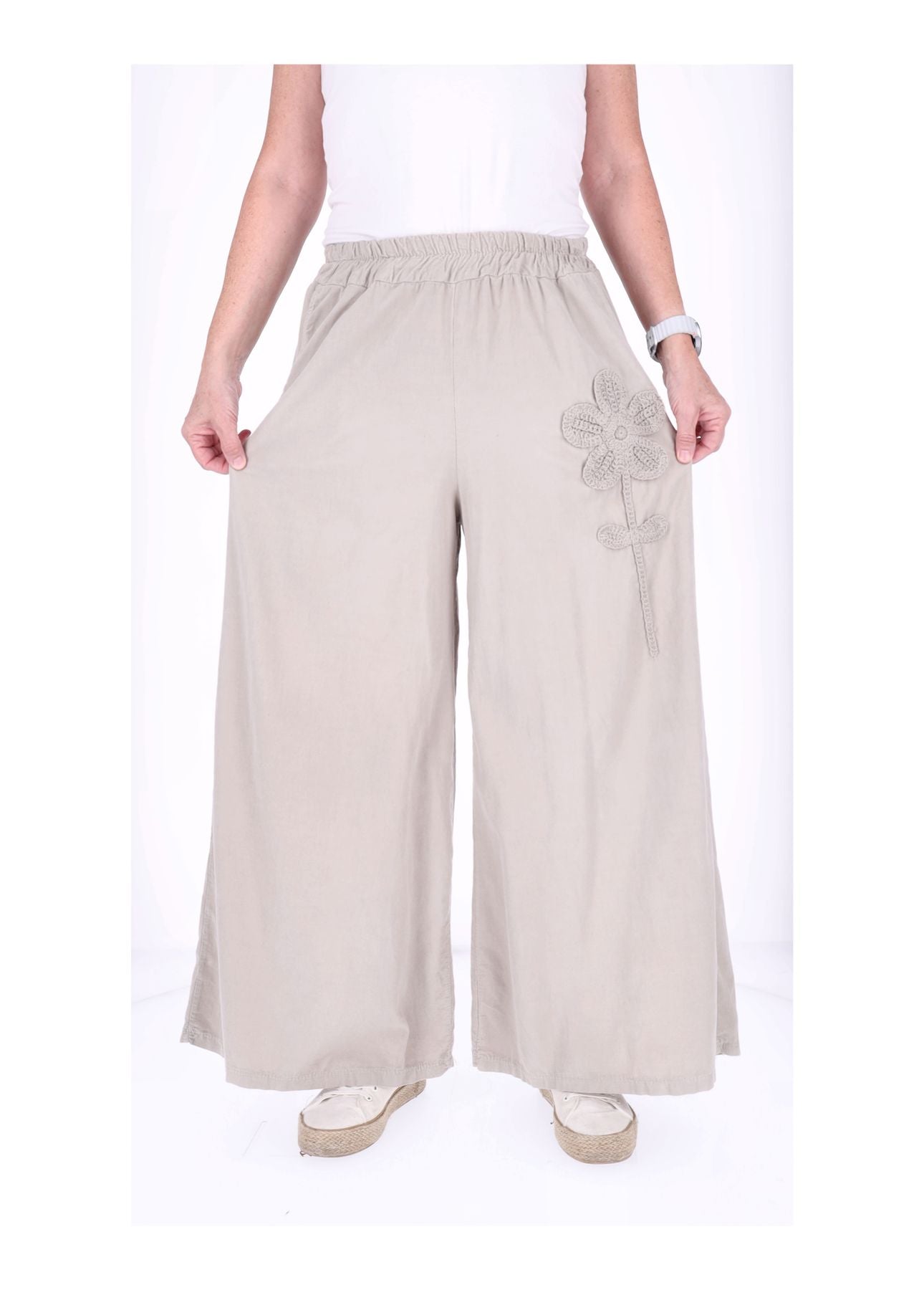 Der bequeme Gummizug in der Taille (halber Bund ungedehnt ca. 33 cm, gedehnt ca. 51 cm) sorgt dafür, dass sie sich perfekt anpasst – kein Zwicken, nur Wohlfühlen! Die weite Beinform schmeichelt jeder Figur und lässt dich mühelos größer wirken. Zwei praktische Taschen vorne links und rechts bieten Platz für Kleinigkeiten, während das liebevolle Blumen-Detail auf der rechten Seite der Hose das gewisse Etwas verleiht.