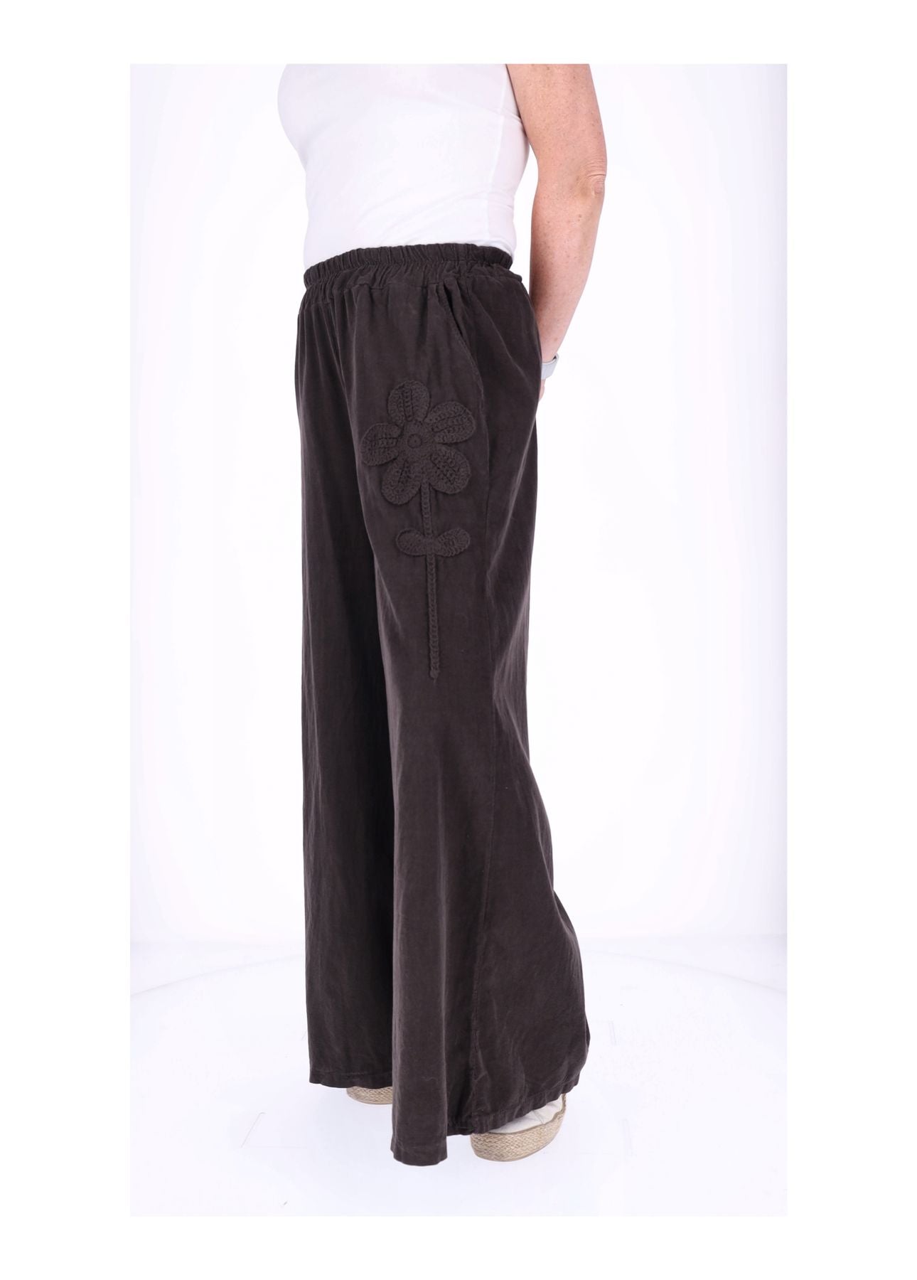 Der bequeme Gummizug in der Taille (halber Bund ungedehnt ca. 33 cm, gedehnt ca. 51 cm) sorgt dafür, dass sie sich perfekt anpasst – kein Zwicken, nur Wohlfühlen! Die weite Beinform schmeichelt jeder Figur und lässt dich mühelos größer wirken. Zwei praktische Taschen vorne links und rechts bieten Platz für Kleinigkeiten, während das liebevolle Blumen-Detail auf der rechten Seite der Hose das gewisse Etwas verleiht.