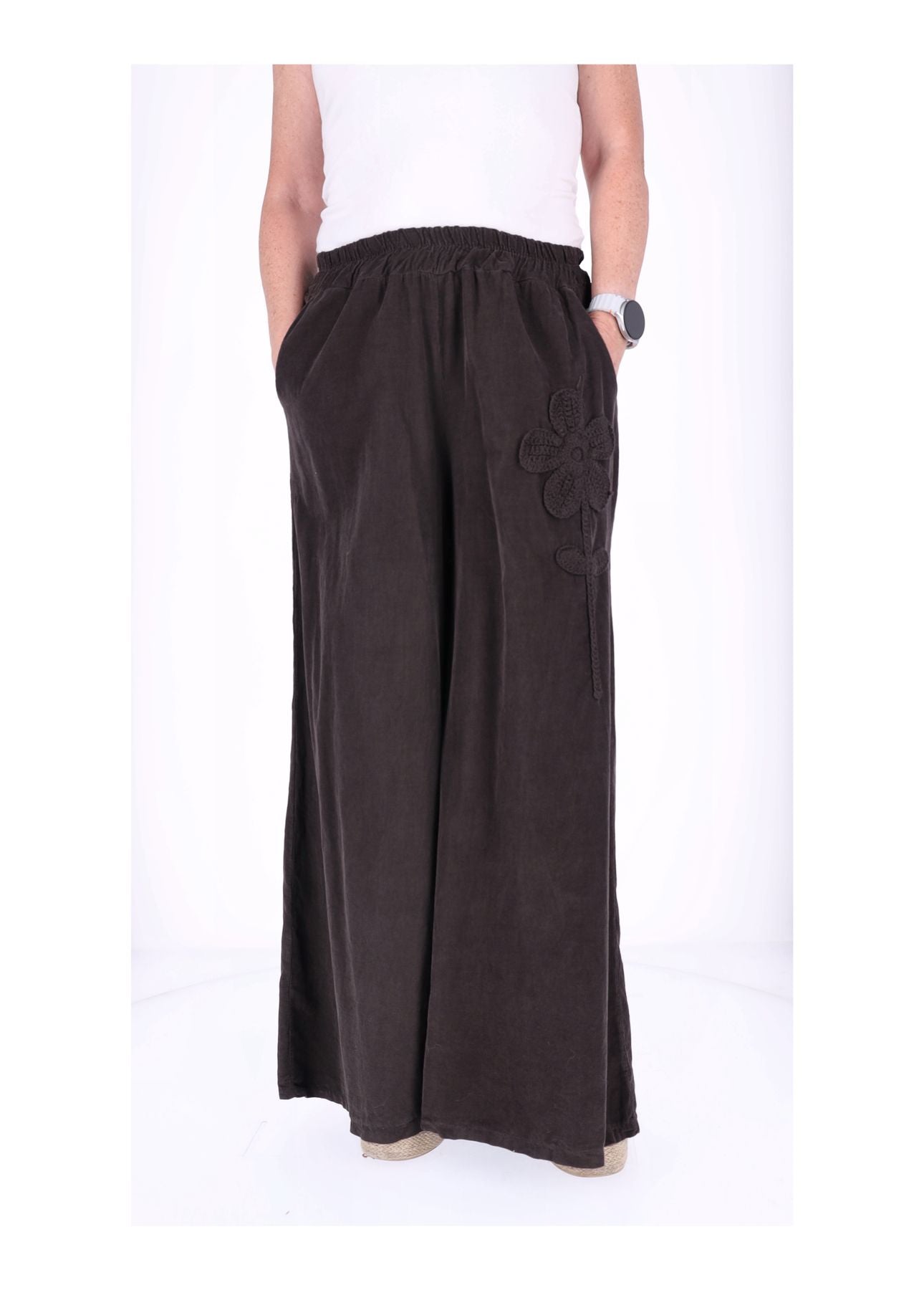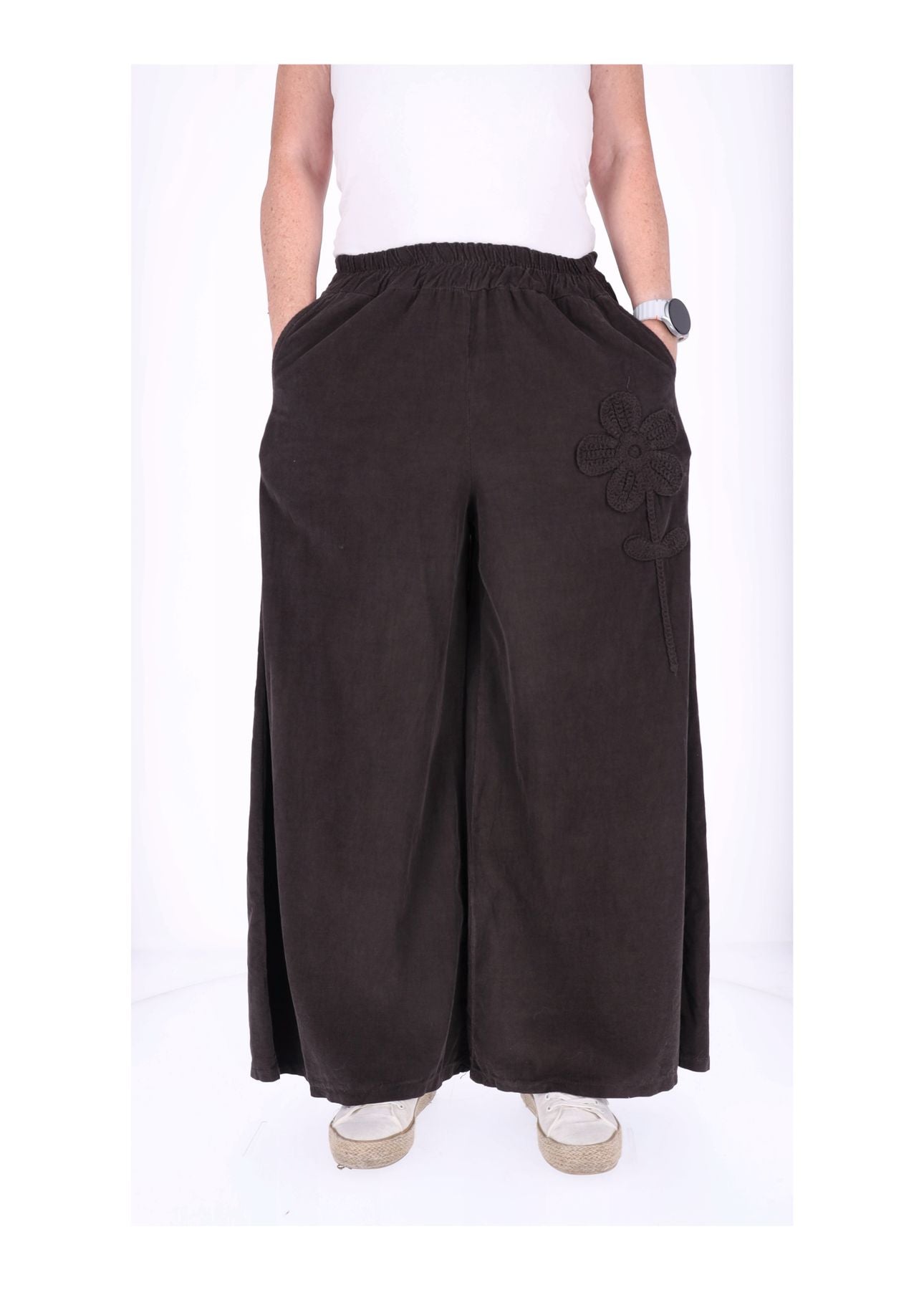 Hose Damen – Weites Bein aus Babycord mit Blumen-Detail