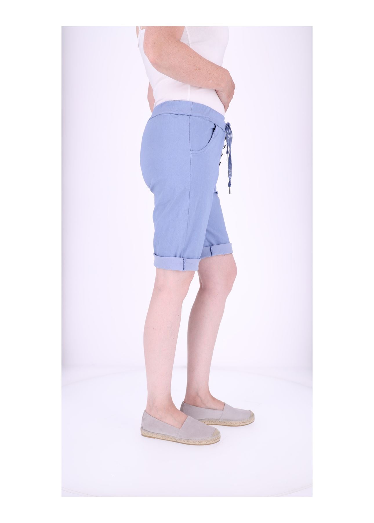 Die angedeutete Knopfleiste verleiht den Shorts eine charmante Optik, während zwei seitliche Einschubtaschen praktische Akzente setzen. Der elastische Bund passt sich durch Gummizug bequem an und sorgt für einen sicheren Sitz, ohne einzuengen.