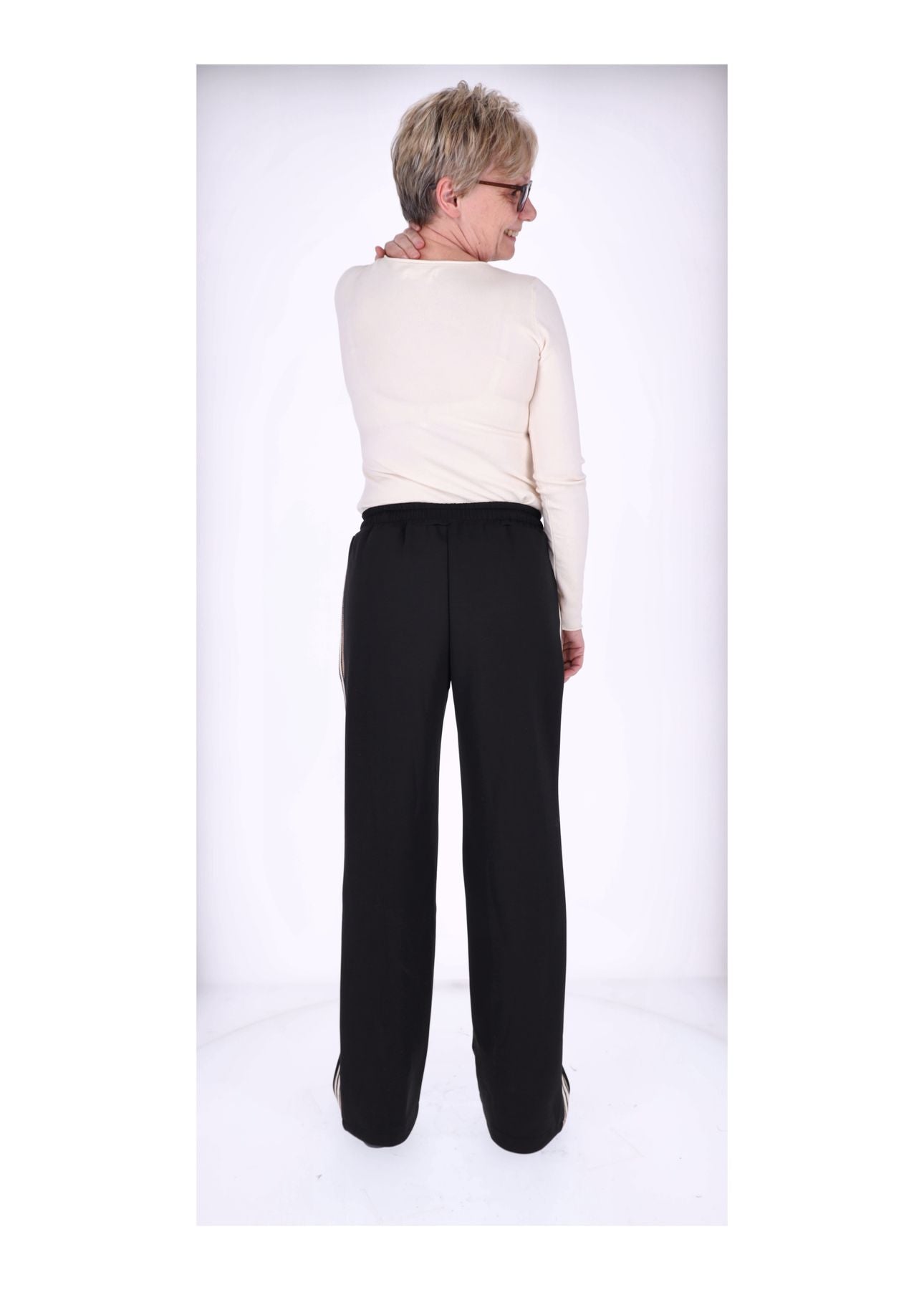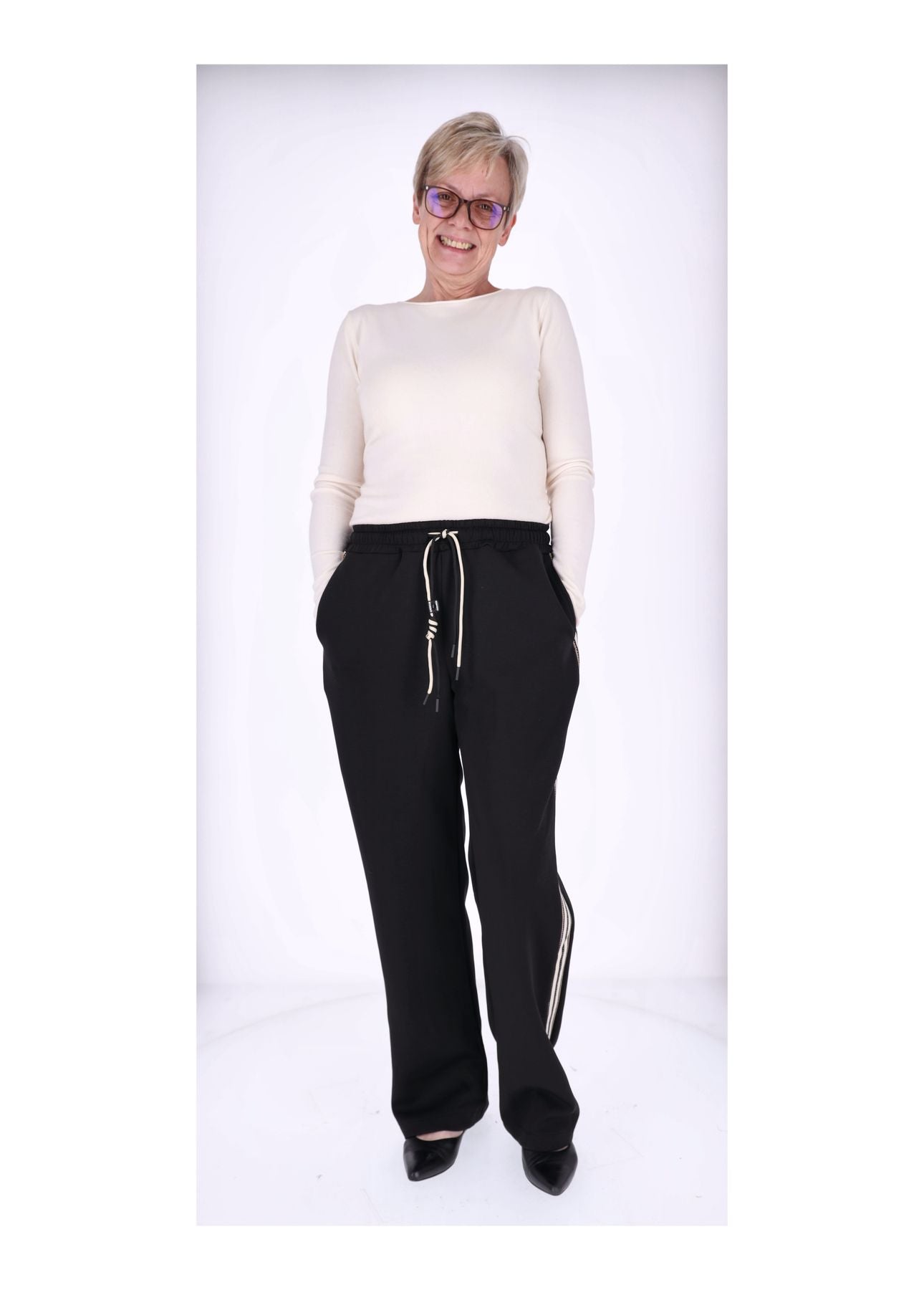 Der elastische Bund mit Zugband sorgt für einen komfortablen Sitz, während die zwei Einschubtaschen links und rechts praktische Funktionalität bieten. Besonders stylisch: die gestrickten Streifen an den Seiten, die einen sportlich-eleganten Akzent setzen.