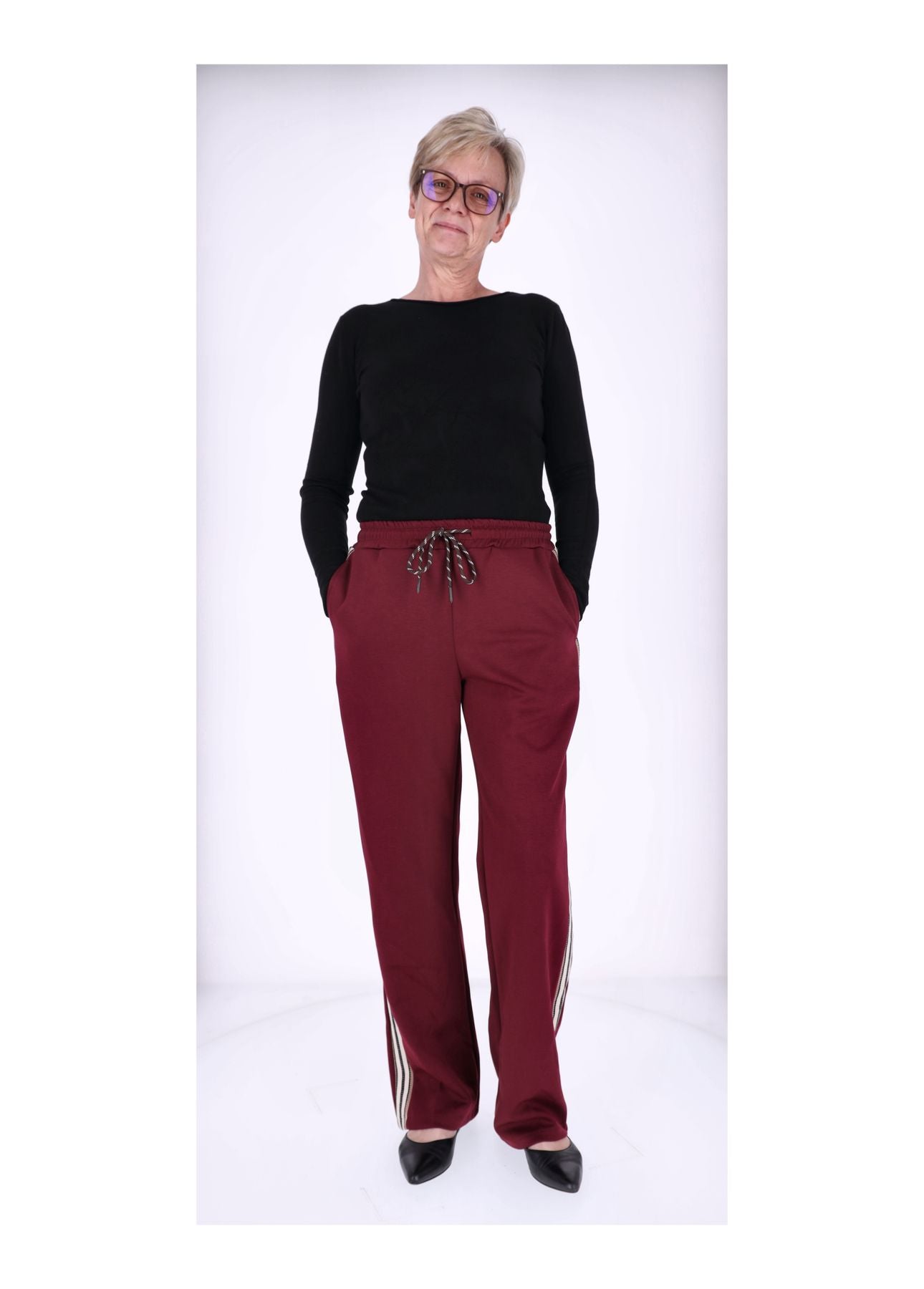 Der elastische Bund mit Zugband sorgt für einen komfortablen Sitz, während die zwei Einschubtaschen links und rechts praktische Funktionalität bieten. Besonders stylisch: die gestrickten Streifen an den Seiten, die einen sportlich-eleganten Akzent setzen.