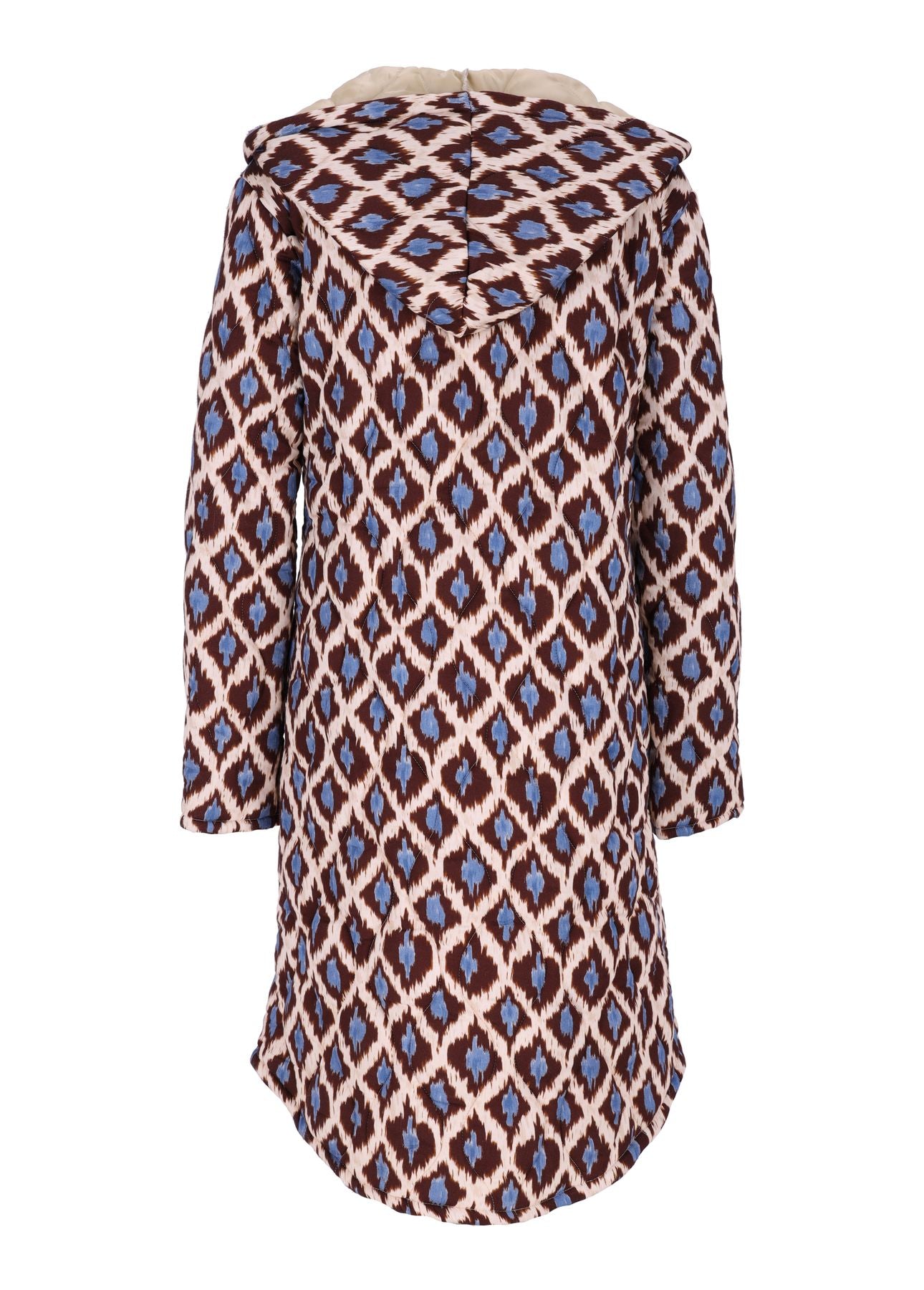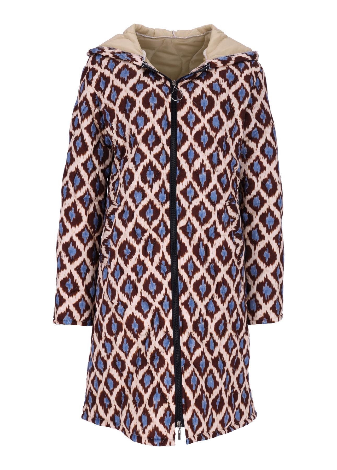 Dieser Damen Steppmantel kombiniert modisches Design mit Funktionalität und Komfort. Der aufregende Print macht den Mantel zu einem echten Hingucker, während der lange, lockere Schnitt für ein angenehmes Tragegefühl sorgt. Die Kapuze bietet zusätzlichen Schutz vor Wind und Wetter und rundet den lässigen Look perfekt ab.