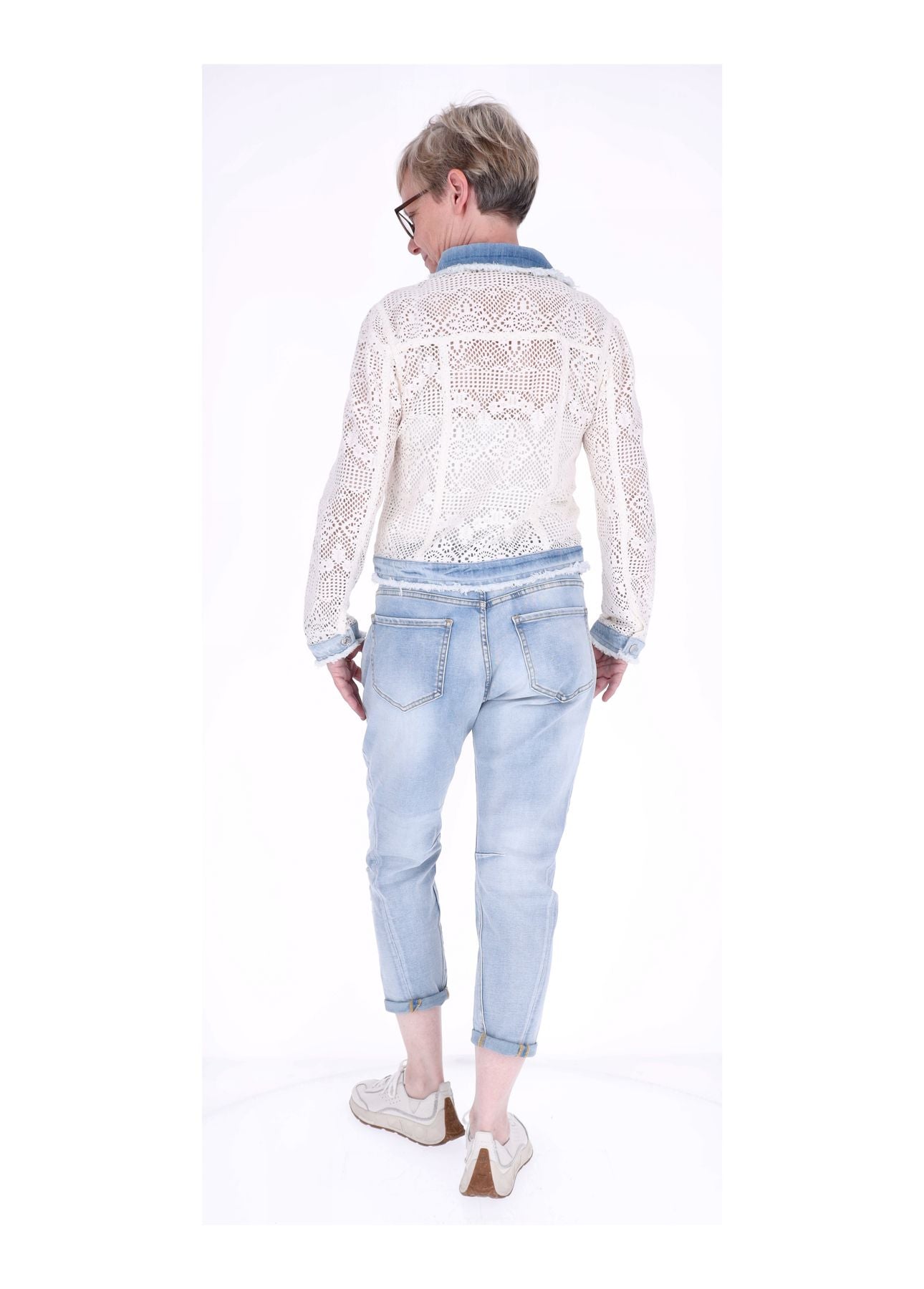 Der 5-Pocket-Schnitt und die schmale Passform zaubern eine moderne Silhouette. Durch die Abnäher am Knie sowie die nach hinten verlaufende Seitennaht an der Wade wirkt das Bein optisch länger und schlanker. Die 7/8-Länge fällt bei einer Körpergröße unter 160 cm als reguläre Länge aus. Liebevolle Applikationen aus zwei gehäkelten Blüten und der Schriftzug LOVE auf der Vorderseite setzen einen verspielten Akzent und machen die Jeans zu einem echten Hingucker.