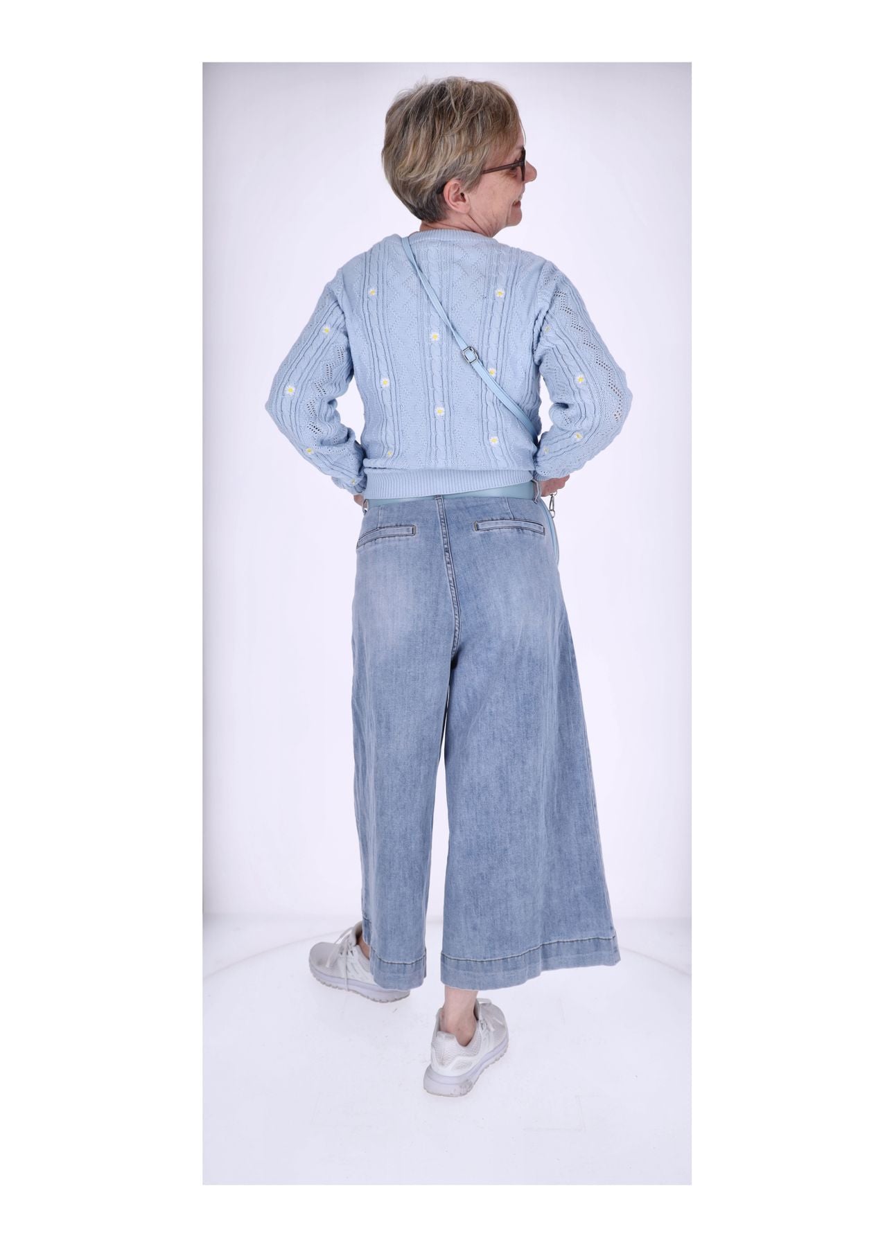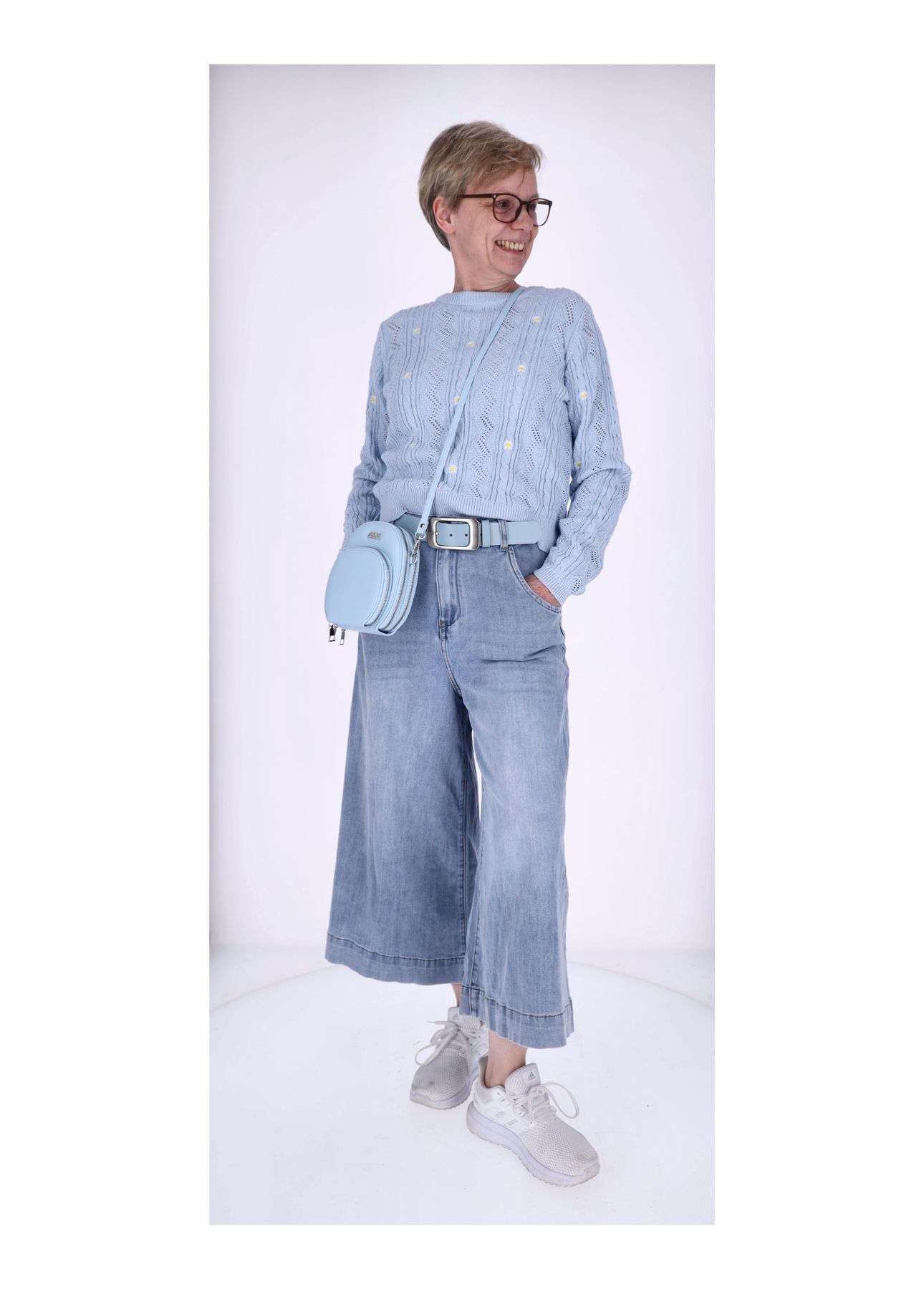 Diese modische Damen-Jeans Culotte überzeugt mit weitem Bein, hoher Taille und trendiger Blue-Wash-Optik. Der High-Waist-Schnitt formt eine schöne Silhouette, während der klassische 5-Pocket-Style und die markante Beinnaht am Saum moderne Akzente setzen. Dank Stretch-Anteil sitzt die Culotte bequem und bleibt den ganzen Tag in Form – perfekt für Alltag, Büro oder Freizeit.