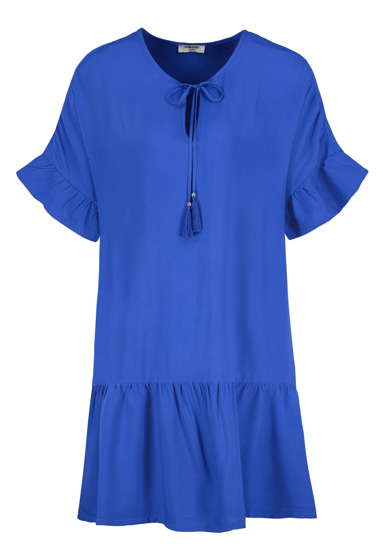Kleid mit Volant, Kurzarm mit Volants, Bänder mit Quasten an V-Ausschnitt
