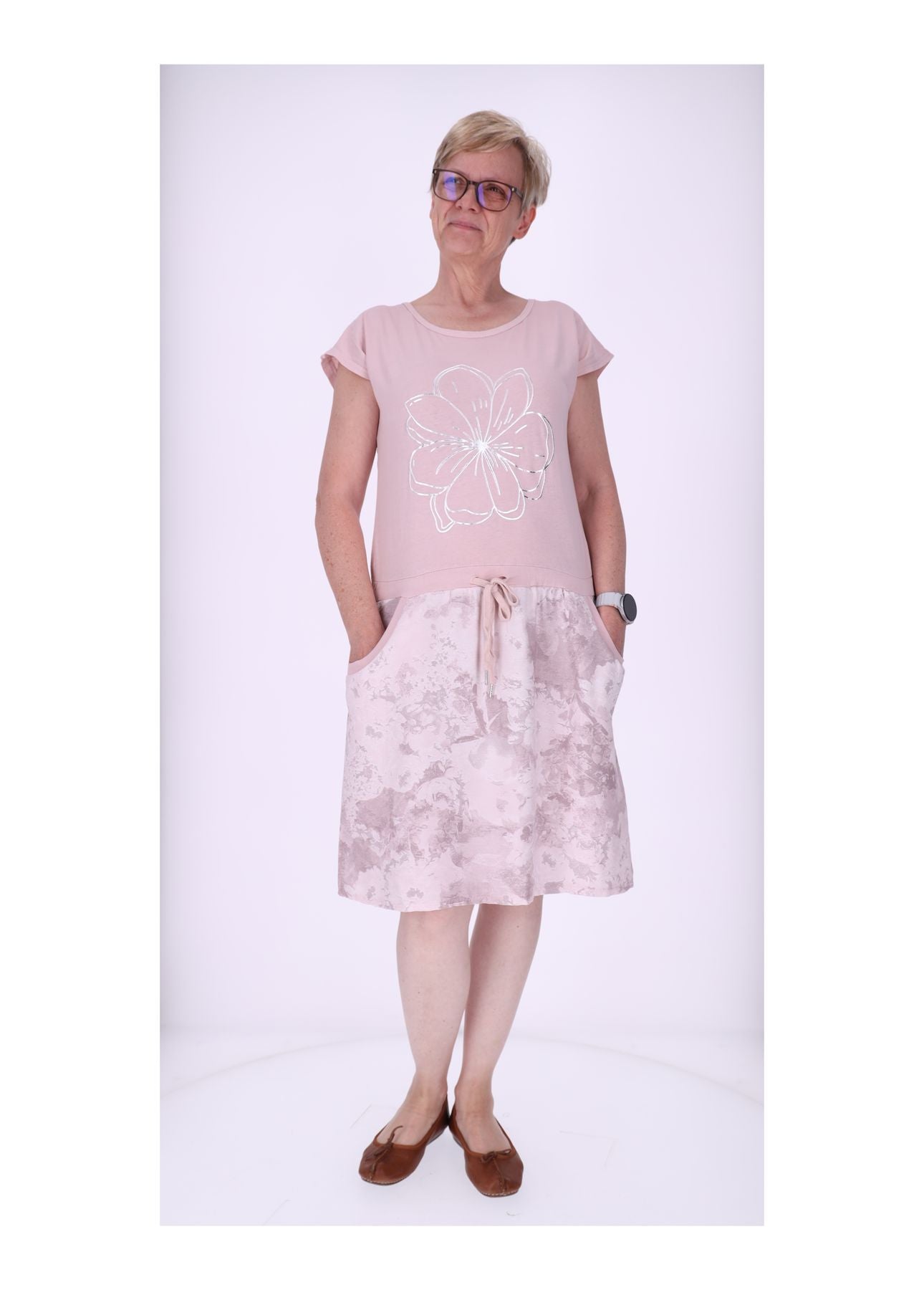 Design: Marmorierter Rockteil und floraler Brustprint für einen femininen Look