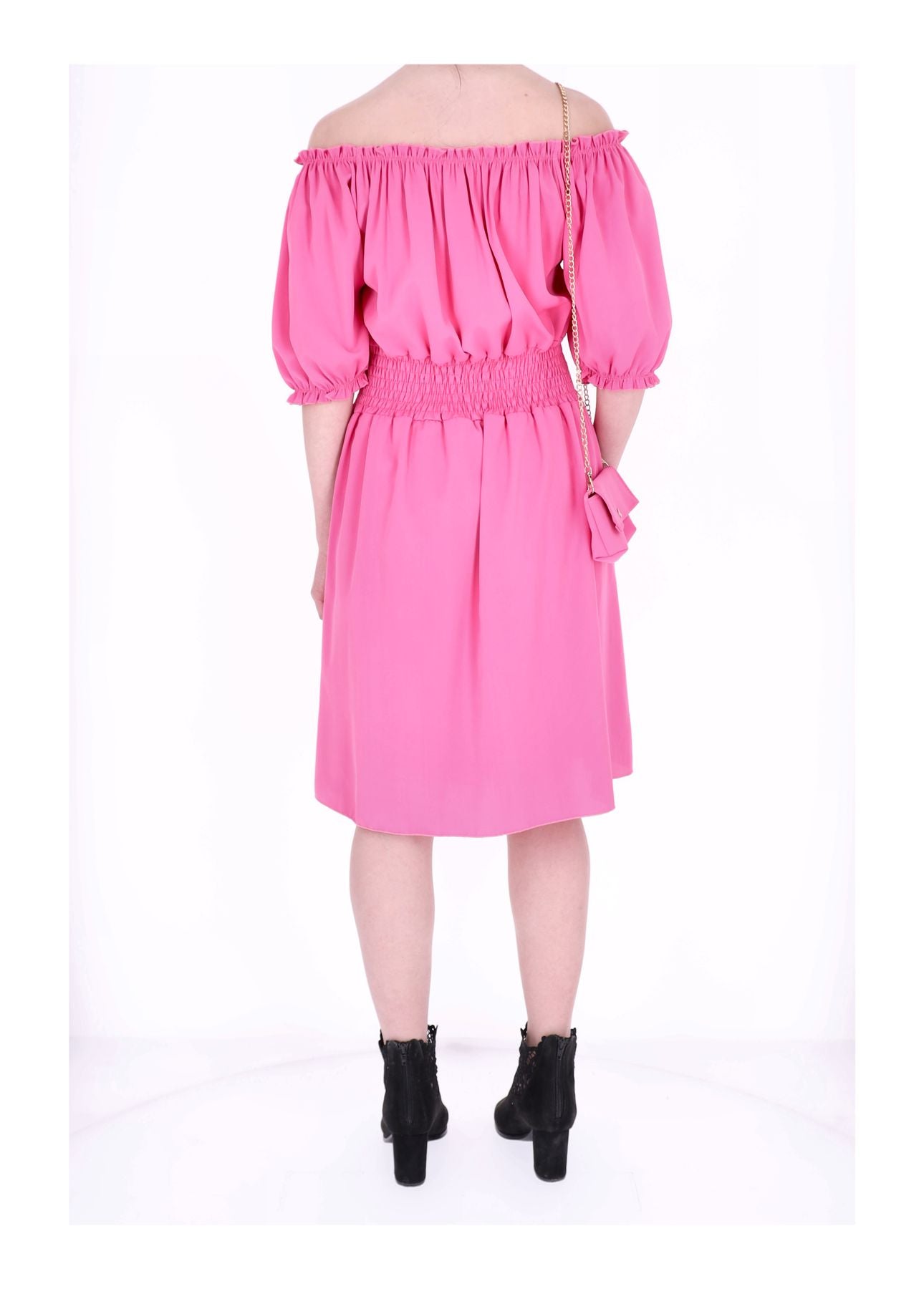 Dieses Carmen-Kleid im Off-Shoulder-Stil begeistert mit sommerlicher Leichtigkeit und femininer Ausstrahlung. Der elastische Ausschnitt mit feiner Rüschenkante setzt Schultern und Dekolleté charmant in Szene. Halblange Puffärmel mit elastischen Bündchen sorgen für eine verspielte Note, während der breite, gesmokte Taillenbereich eine flexible Passform und schönen Halt bietet. Als Extra ergänzt eine kleine Umhängetasche mit goldfarbener Kette den Look perfekt.
