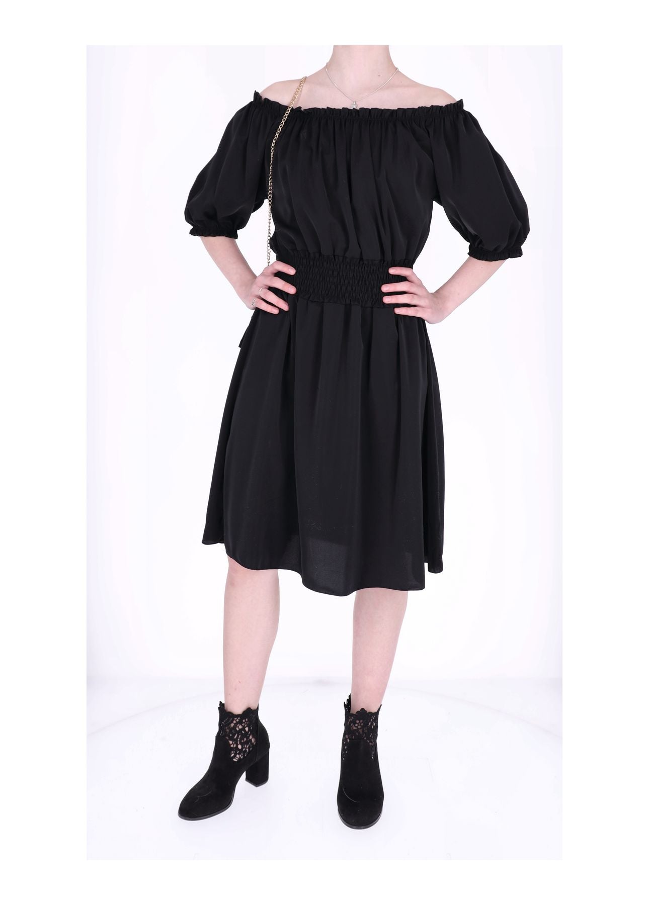 Dieses Carmen-Kleid im Off-Shoulder-Stil begeistert mit sommerlicher Leichtigkeit und femininer Ausstrahlung. Der elastische Ausschnitt mit feiner Rüschenkante setzt Schultern und Dekolleté charmant in Szene. Halblange Puffärmel mit elastischen Bündchen sorgen für eine verspielte Note, während der breite, gesmokte Taillenbereich eine flexible Passform und schönen Halt bietet. Als Extra ergänzt eine kleine Umhängetasche mit goldfarbener Kette den Look perfekt.