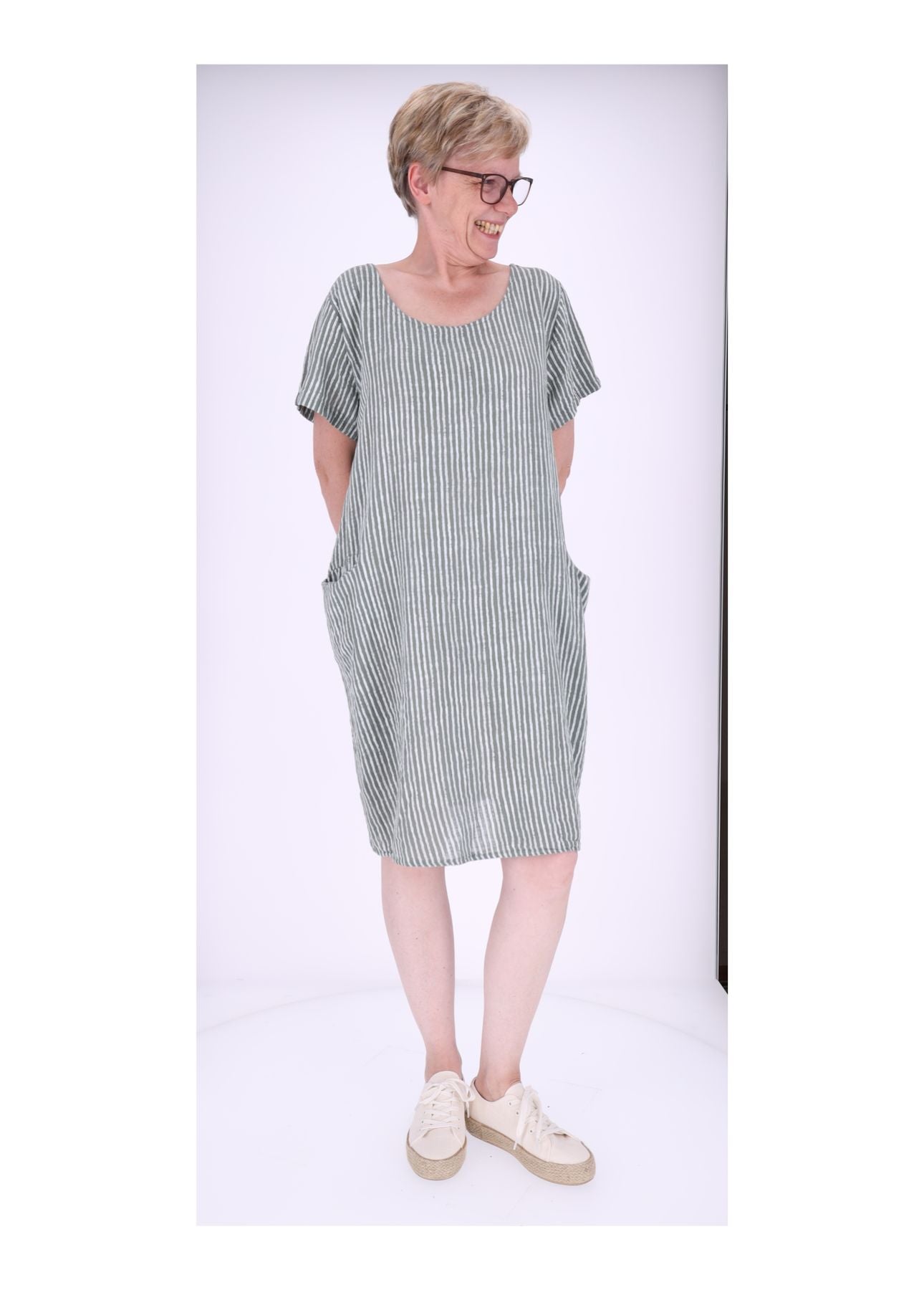 Gefertigt aus einer natürlichen Baumwoll-Leinen-Mischung, ist es nicht nur angenehm zu tragen, sondern auch wunderbar atmungsaktiv – ideal für heiße Tage, an denen du dich frei und unbeschwert fühlen möchtest. Zwei praktische Einschubtaschen runden das Design ab und geben dem Kleid einen lässigen, funktionalen Touch.