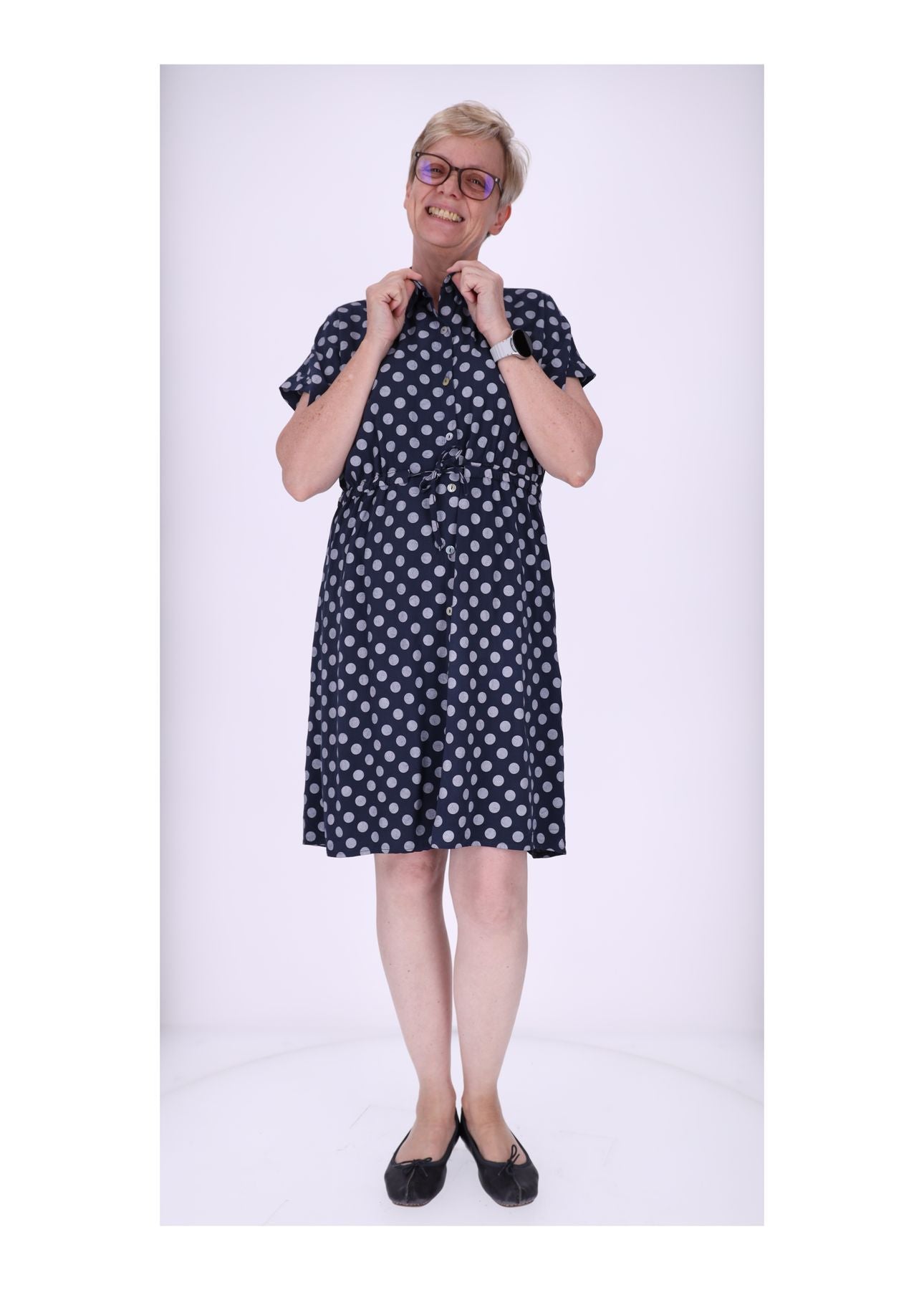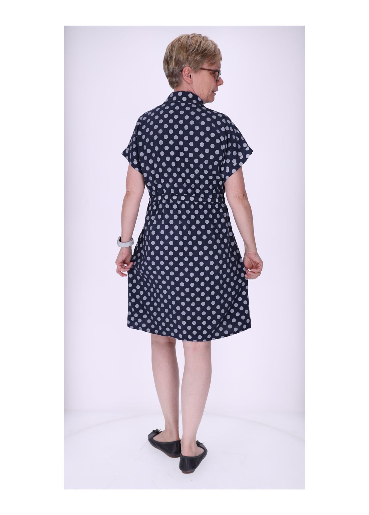 Sommerkleid Damen | gepunktetes Kleid | knielang | luftiges Kleid Onesize | mit Knopfleiste & Taillenband | Casual Chic