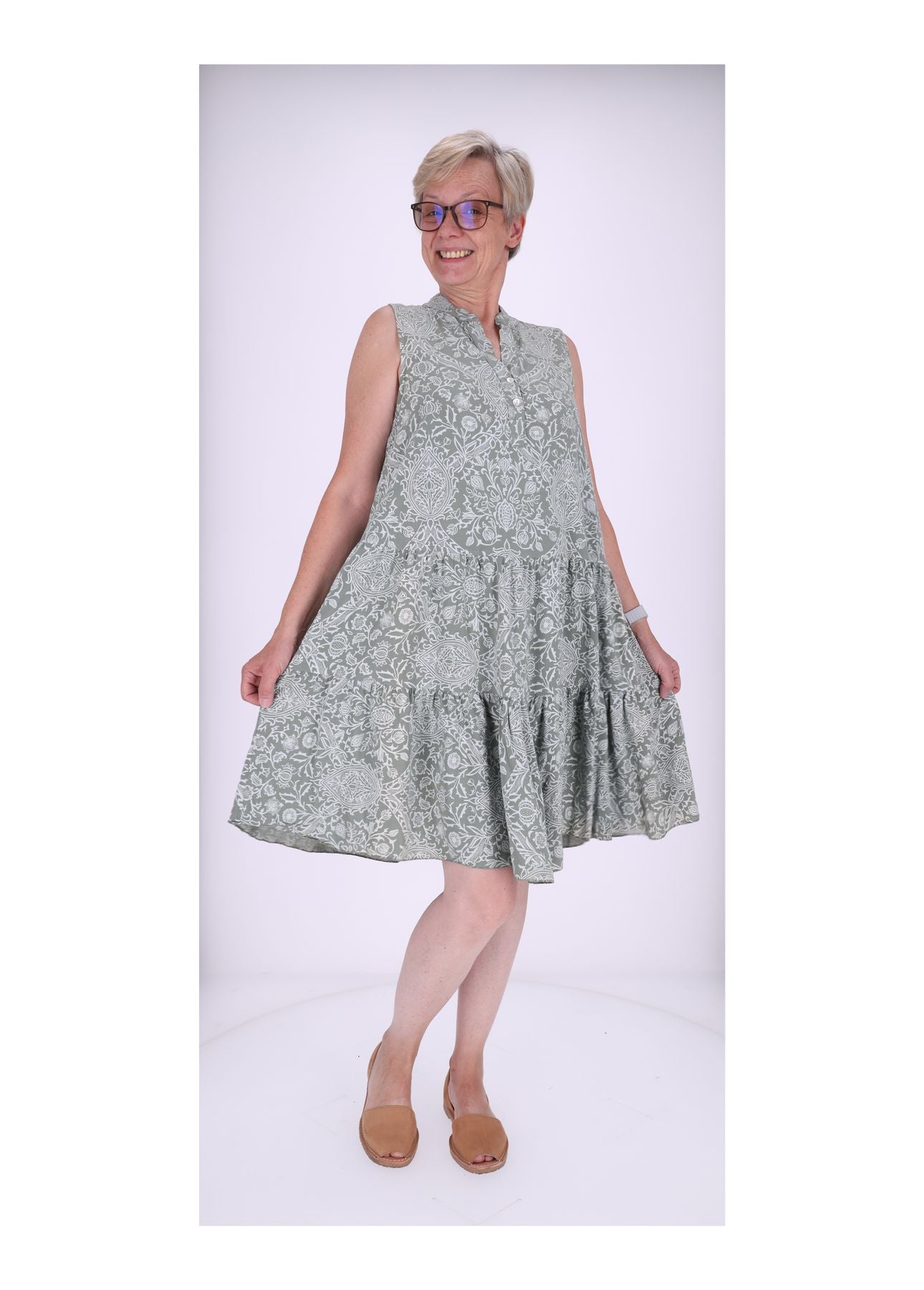 Mit seinen zwei großen, fließenden Stufen fällt dieses Kleid herrlich locker und bequem, sodass du dich den ganzen Tag frei und unbeschwert fühlst. Die Knopfleiste vom Hals bis zur Brust ist nicht nur ein charmantes Detail, sondern ermöglicht es dir auch, den Ausschnitt ganz nach Belieben anzupassen. Die knielange Passform ist super vielseitig und lädt zum Kombinieren ein.