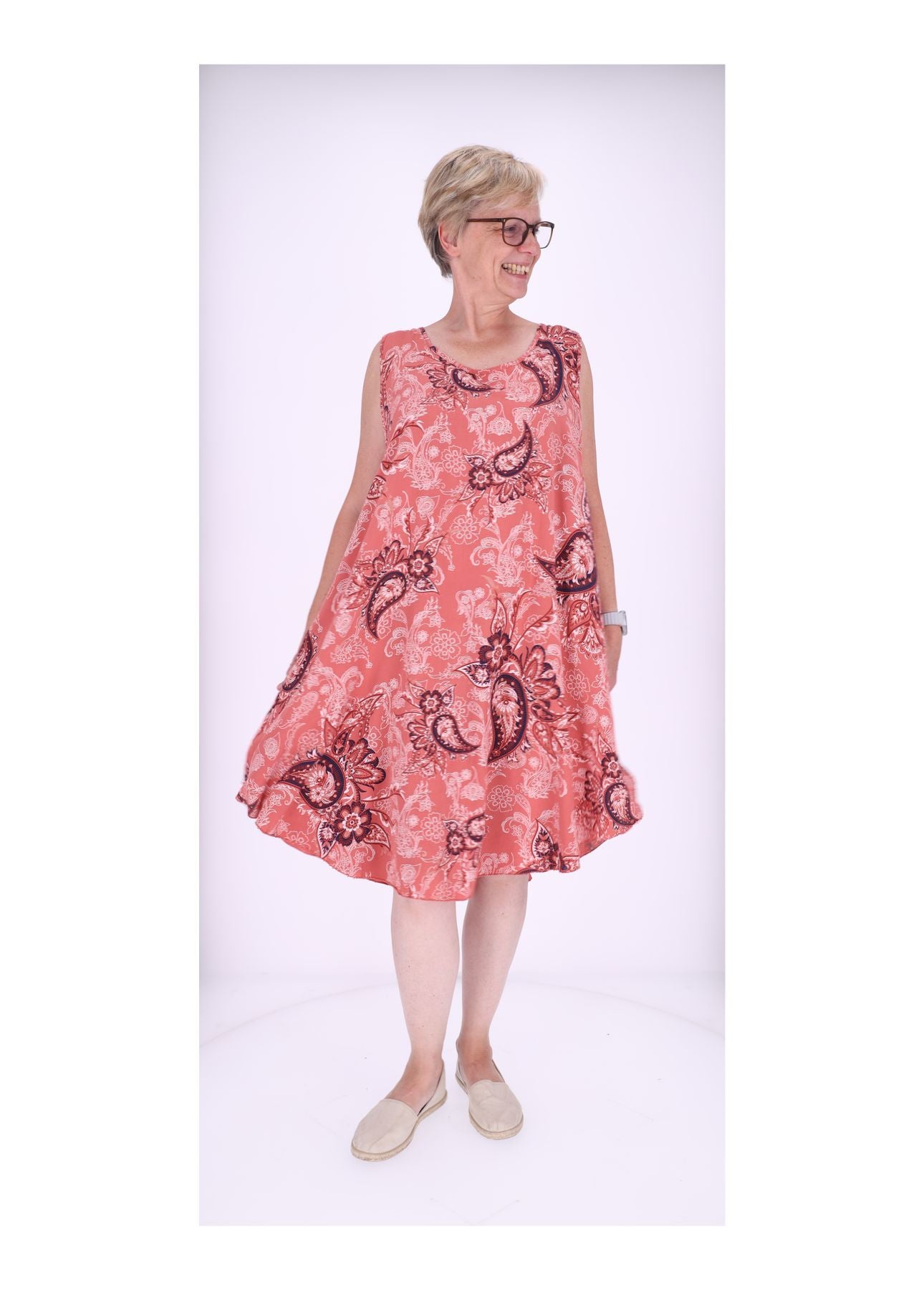 Dieses wunderschöne Trägerkleid ist der Inbegriff von entspannter Eleganz und purem Wohlgefühl. Gefertigt aus 95% Baumwolle und 5% Elasthan, umschmeichelt es deine Haut sanft und sorgt den ganzen Tag für ein angenehmes Tragegefühl, besonders an wärmeren Tagen. Das einzigartige Paisseley-Muster macht jedes Kleid zu einem echten Hingucker und bringt Farbe in deinen Alltag.