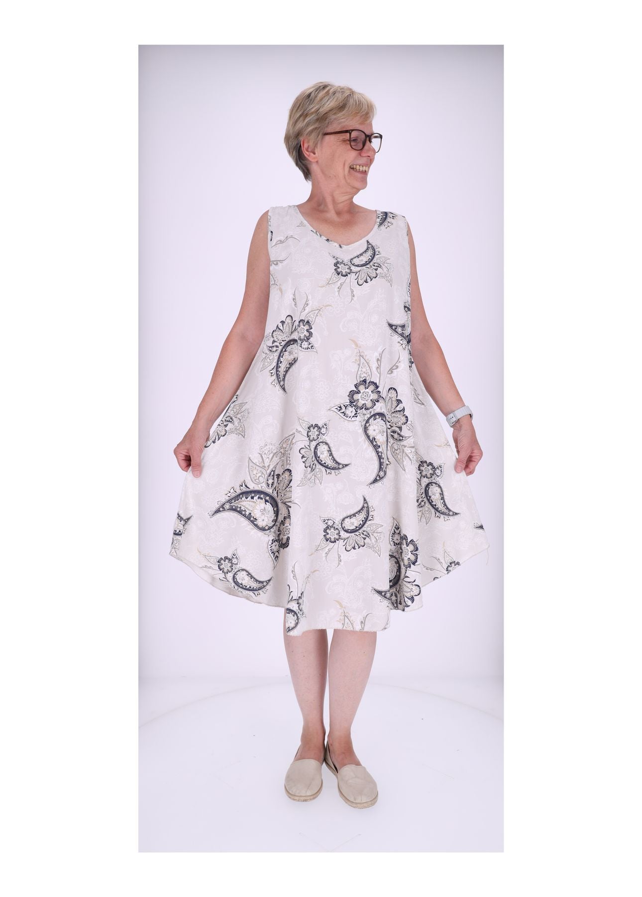 Dieses wunderschöne Trägerkleid ist der Inbegriff von entspannter Eleganz und purem Wohlgefühl. Gefertigt aus 95% Baumwolle und 5% Elasthan, umschmeichelt es deine Haut sanft und sorgt den ganzen Tag für ein angenehmes Tragegefühl, besonders an wärmeren Tagen. Das einzigartige Paisseley-Muster macht jedes Kleid zu einem echten Hingucker und bringt Farbe in deinen Alltag.
