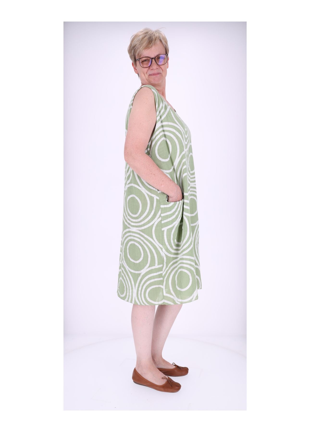 Dieses ärmellose Kleid ist der Inbegriff von Leichtigkeit und Stil! Gefertigt aus einem hochwertigen Baumwoll-Leinen-Mix bietet es ein wunderbar angenehmes Tragegefühl – perfekt für warme Tage. Der moderne Alloverprint mit großen Kreisen verleiht dem Kleid eine verspielte, kreative Note und macht es zu einem echten Hingucker, ob im Alltag, im Urlaub oder auf dem Stadtbummel.