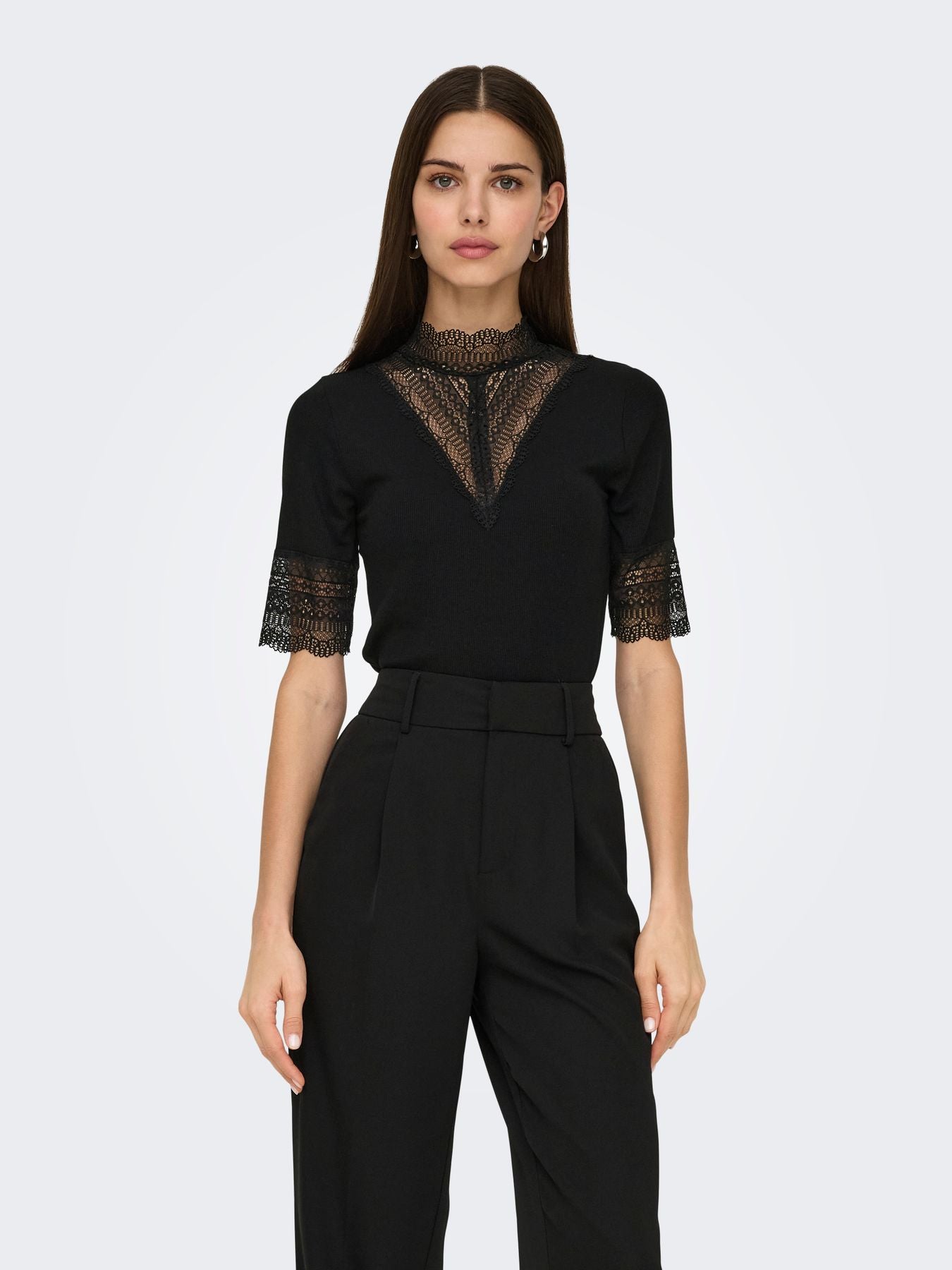 Keine Garderobe ist komplett ohne weiche und zeitlose Basics, die perfekt für jeden Anlass in jeder Jahreszeit sind. - Produkttyp : Top - Hals : Hoch geschlossen - Ärmel : Kurzarm - Verschluss : Knopfleiste - Details : Spitzen-Detail - Passform : Enger Schnitt