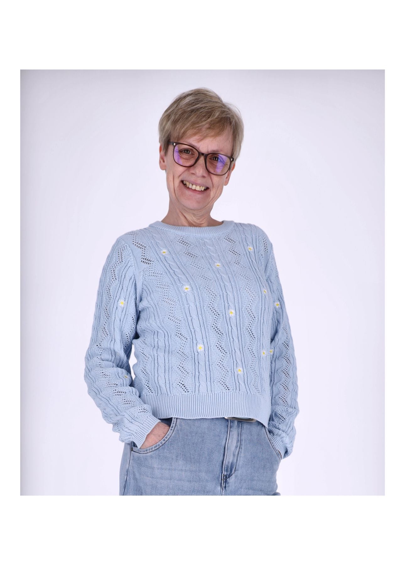 Dieser Damen Strickpullover verbindet zeitlosen Komfort mit liebevollen Details. Die 1x1 Rippstrick-Bündchen an Saum und Ärmeln sorgen für eine schöne Passform, während die dezente Stickerei dem Look eine feminine, hochwertige Note verleiht – ideal für Alltag und Büro.