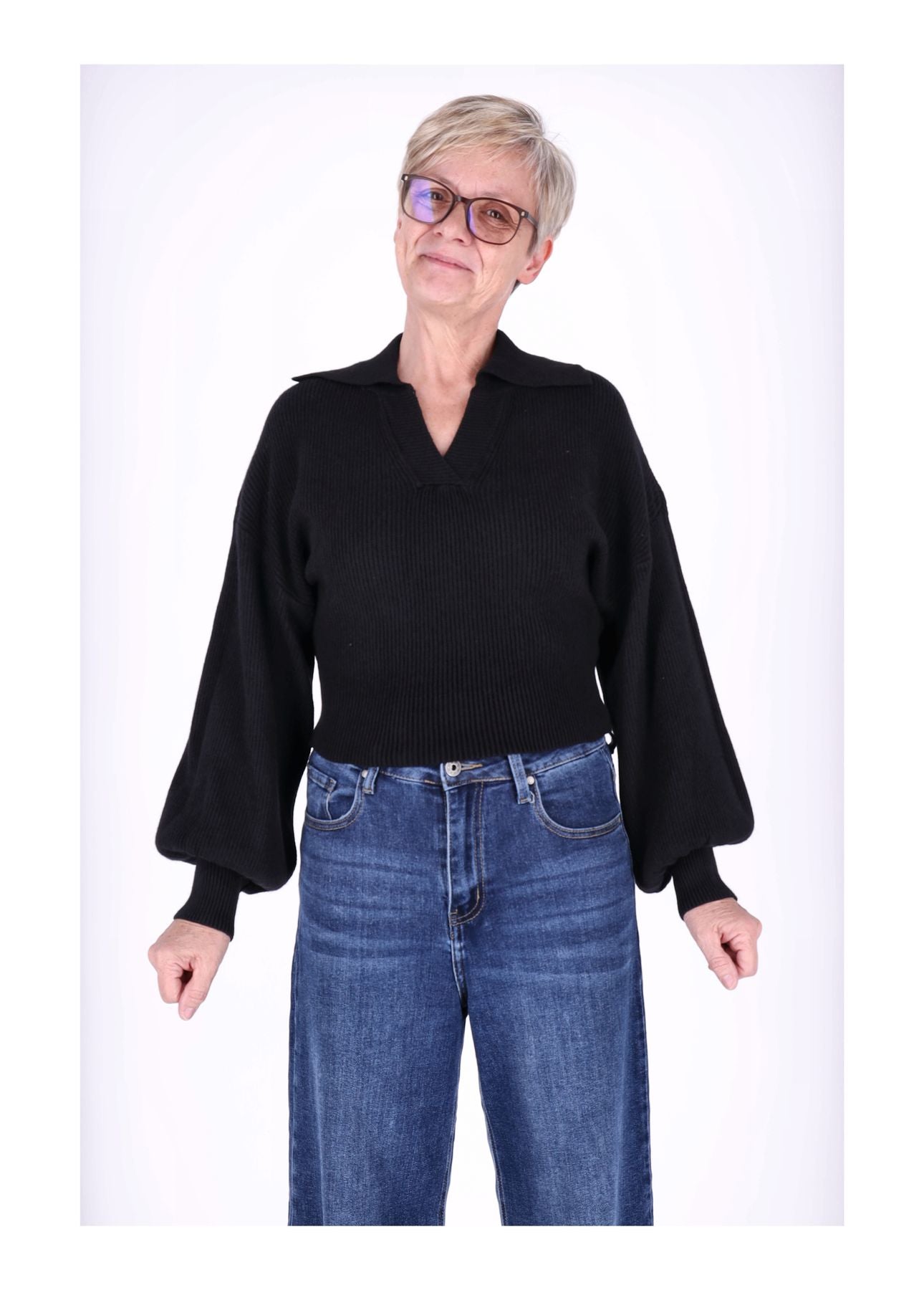 Das Highlight: ein klassischer Polokragen kombiniert mit einem V-Ausschnitt vorne, der deinem Outfit sofort einen eleganten, femininen Touch verleiht. Der Pullover lässt sich vielseitig kombinieren und passt perfekt zu Jeans, Röcken oder Stoffhosen.