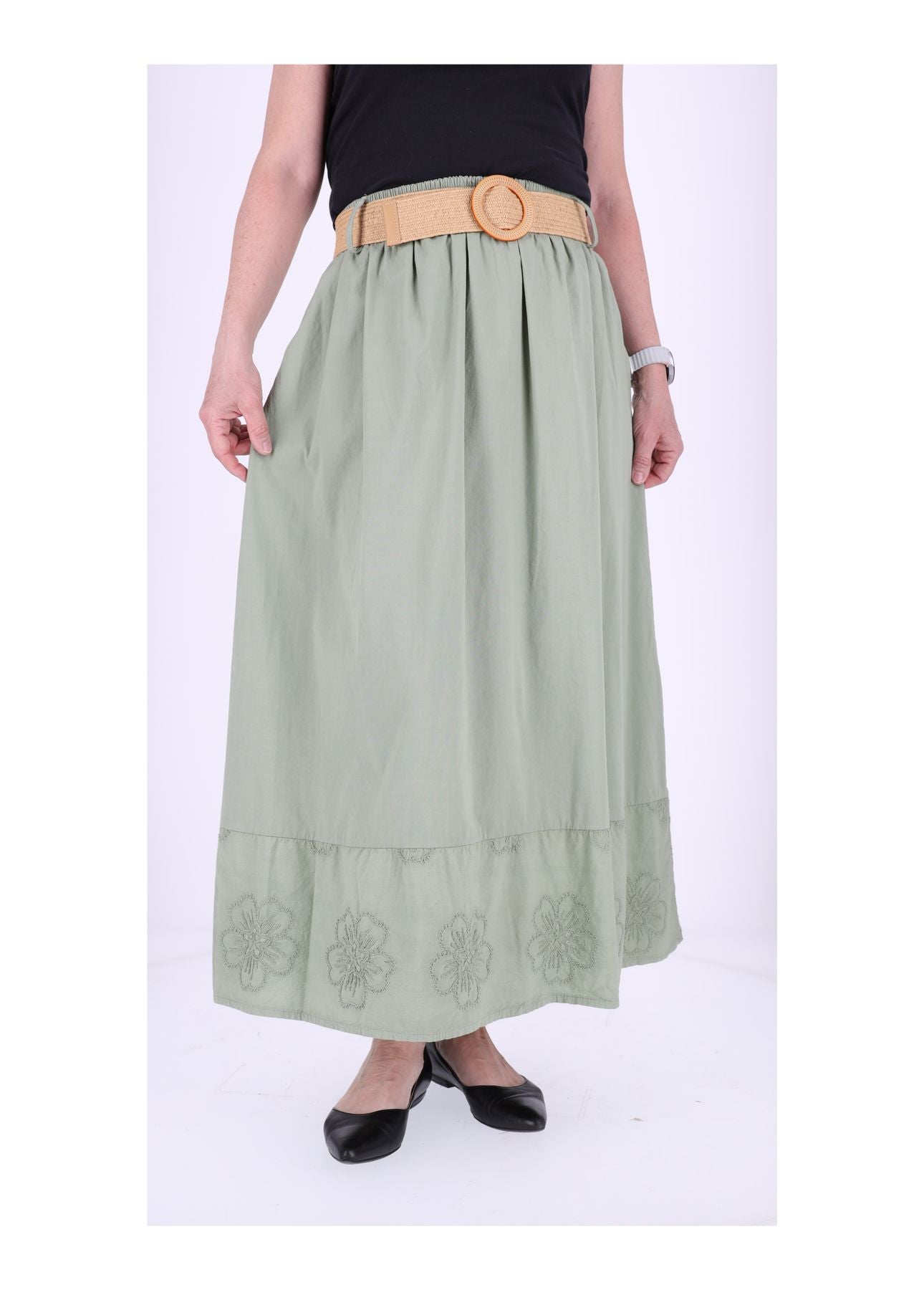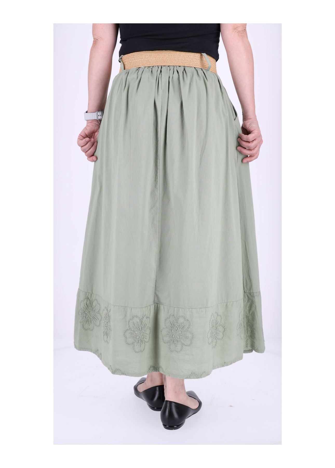 Damenrock aus Baumwolle mit Blütenstickerei, Einschubtaschen & Stretchgürtel – One Size für S-L
