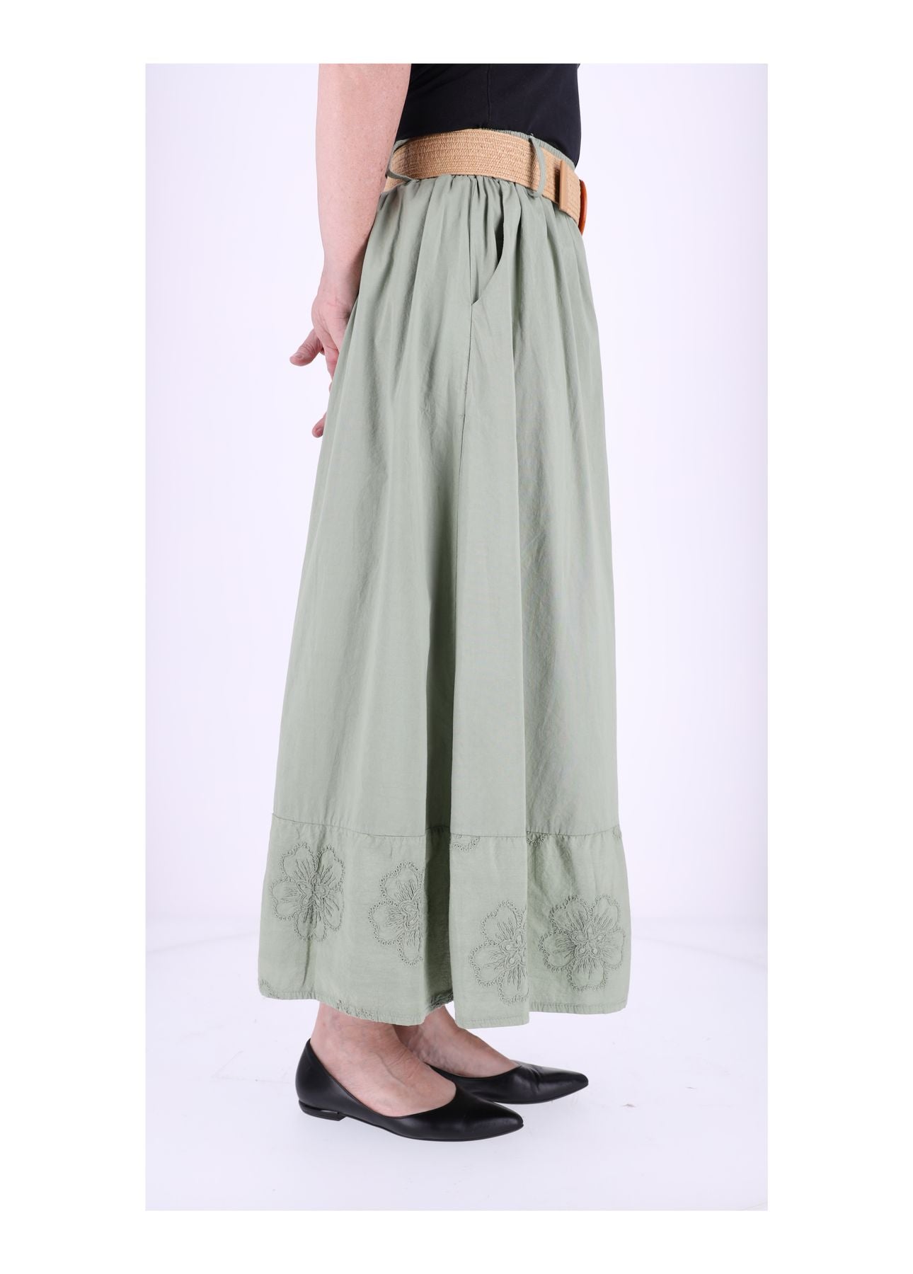 Im unteren Bereich sorgt ein weich fallender Volant mit ton-in-ton Blütenstickerei für eine dezente, romantische Note. Die Stickerei verleiht dem Rock seinen charmanten Boho-Charakter und macht ihn zu einem stilvollen Hingucker – ganz ohne aufdringlich zu wirken.
