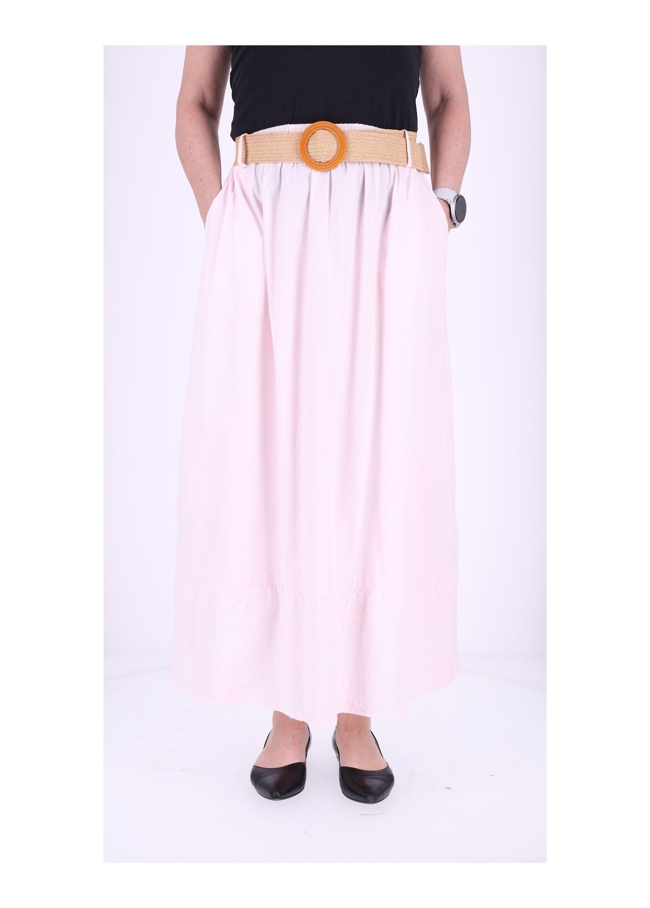 Damenrock aus Baumwolle mit Blütenstickerei, Einschubtaschen & Stretchgürtel – One Size für S-L