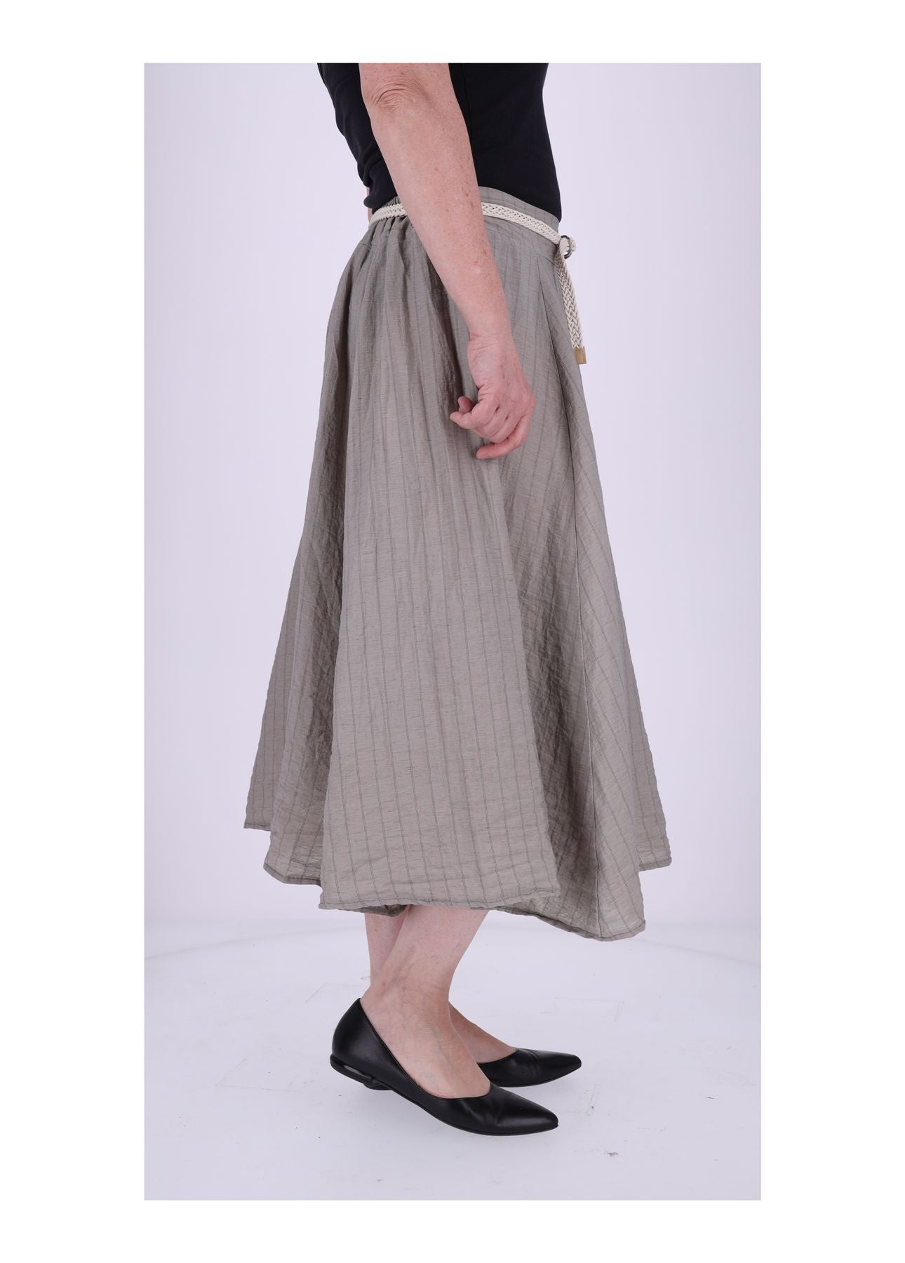 Das kleine Highlight ist der schmale, geflochtene Gürtel – ein süßes Detail, das dem Look noch das gewisse Etwas verleiht. Und das Beste: Der Rock kommt in praktischer One Size und passt ganz bequem den Größen S bis L – richtig unkompliziert!