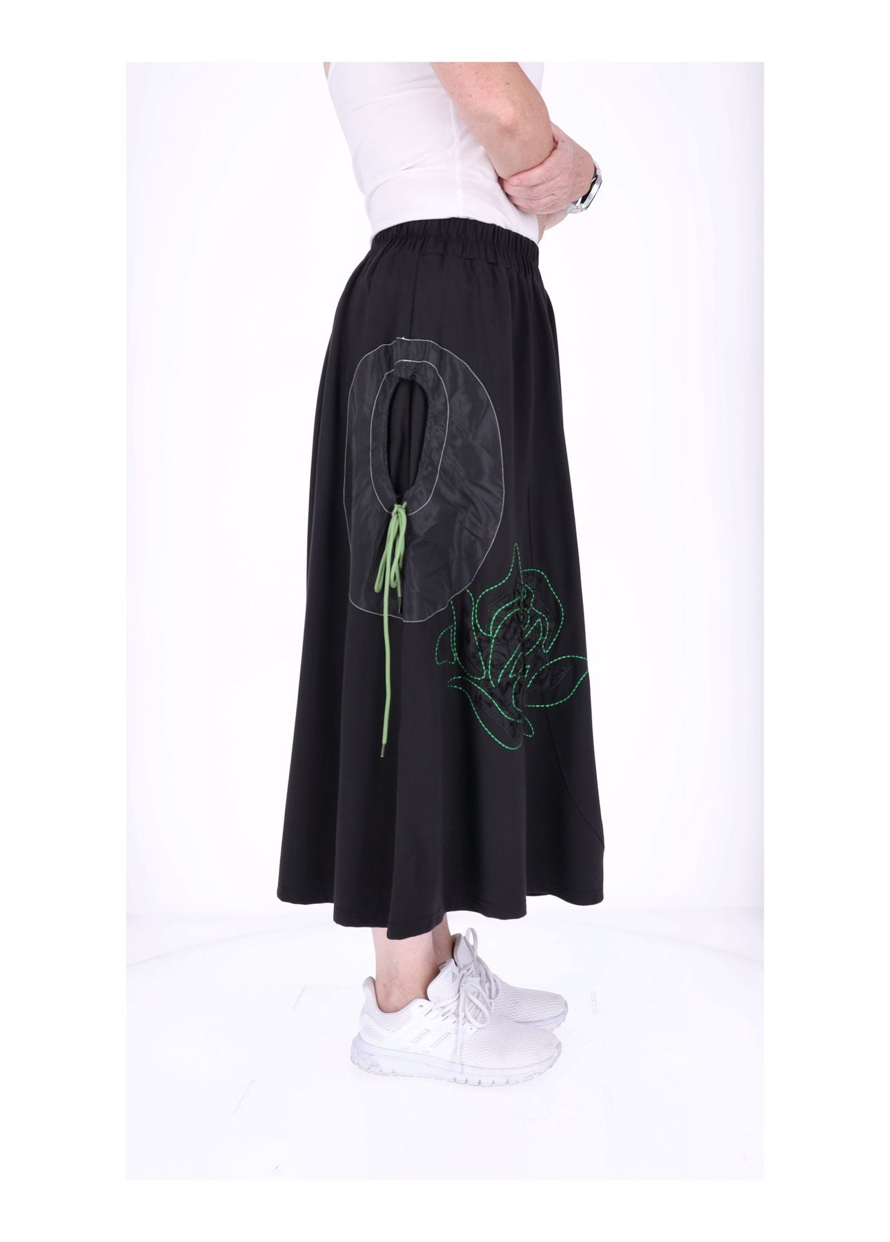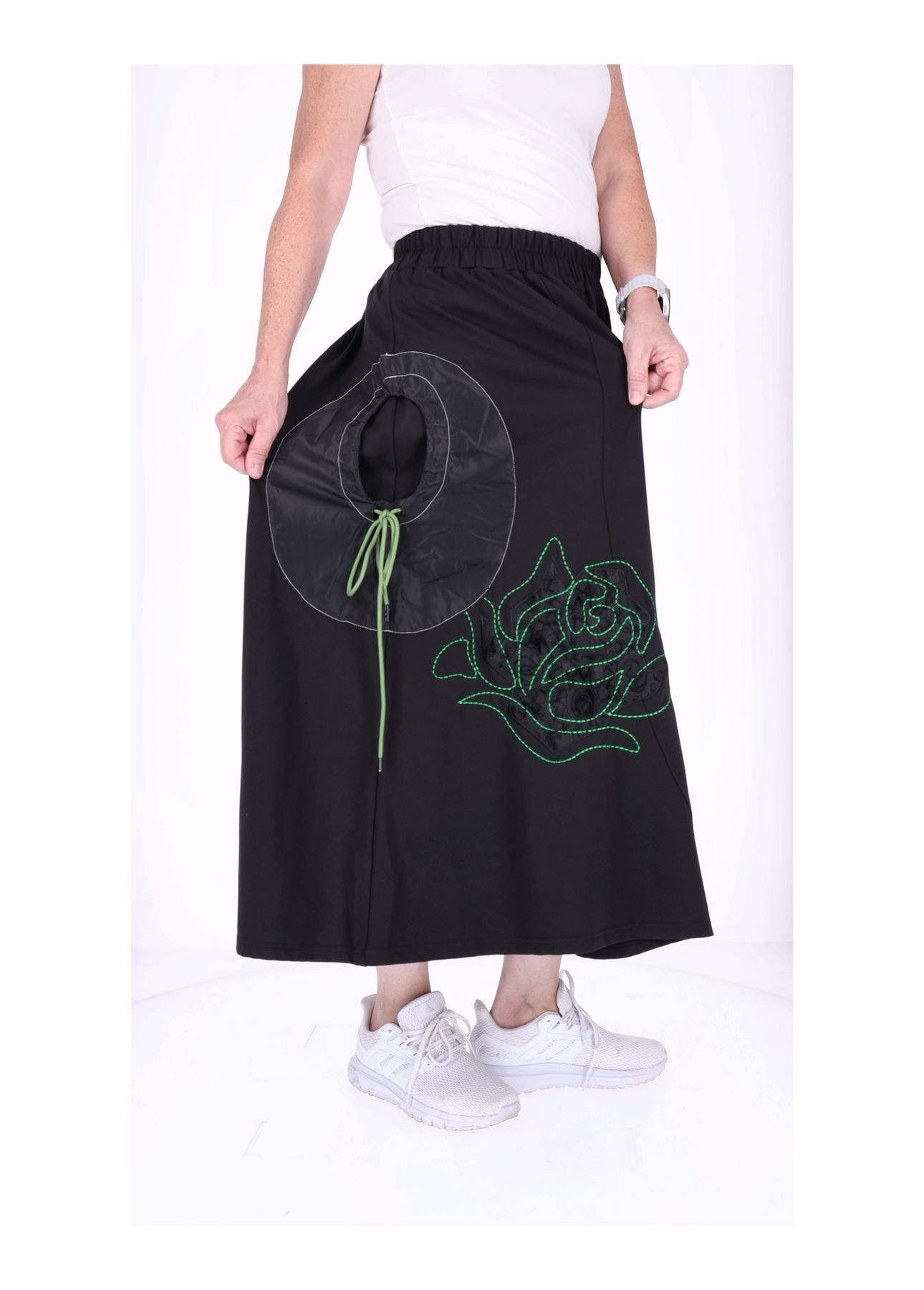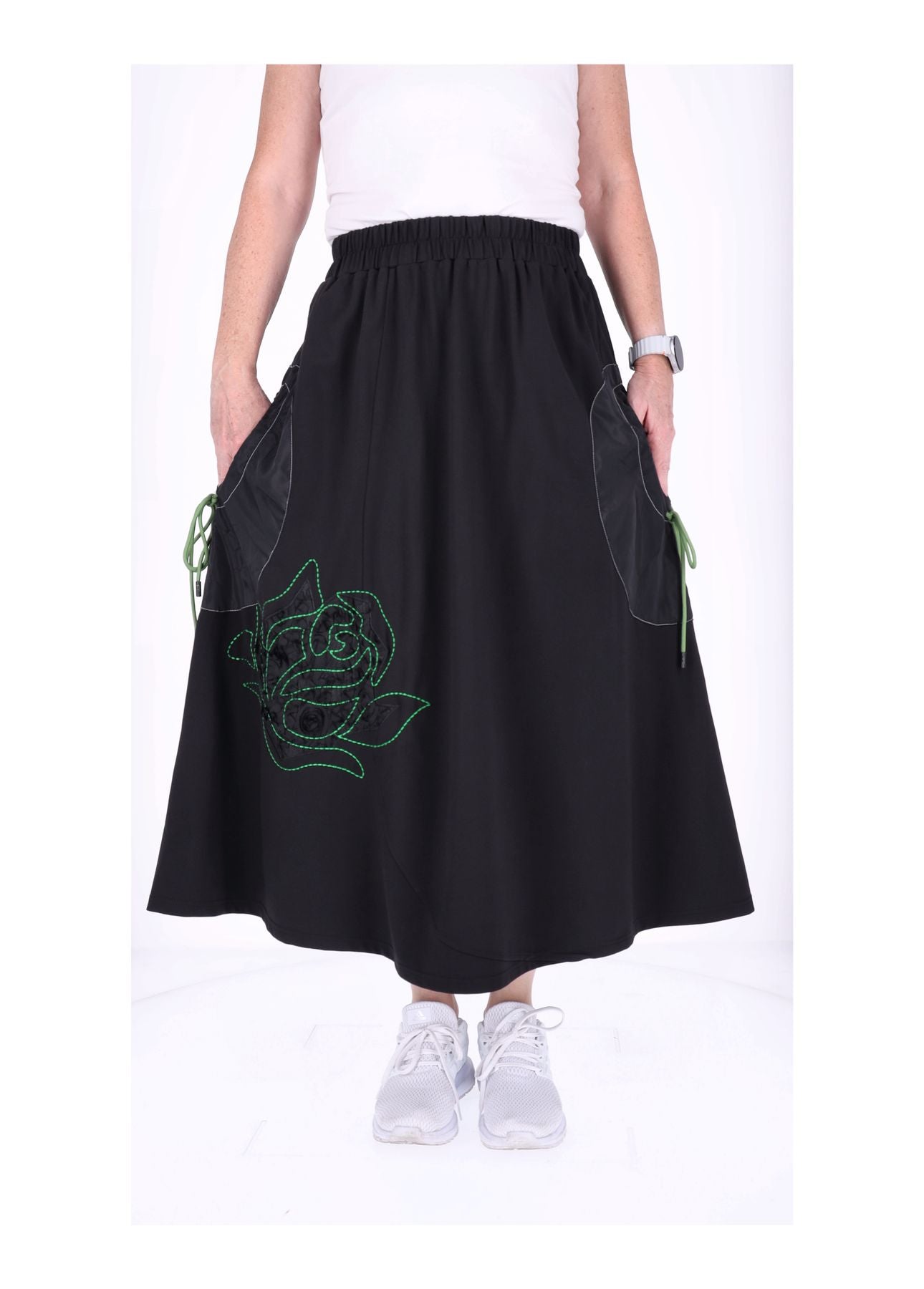 Das besondere Highlight: Eine zarte Blume ist vorne liebevoll gestickt und appliziert, die den Rock zu einem echten Hingucker macht. Die praktischen Taschen links und rechts lassen sich durch ein Zugband raffiniert enger ziehen – so entsteht eine charmante Raffung, die deine Silhouette betont und dem Rock ein individuelles, stylisches Finish verleiht.