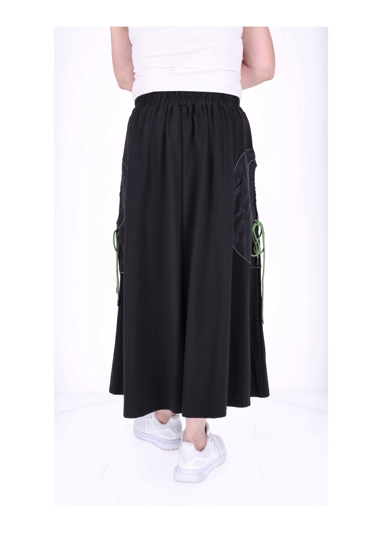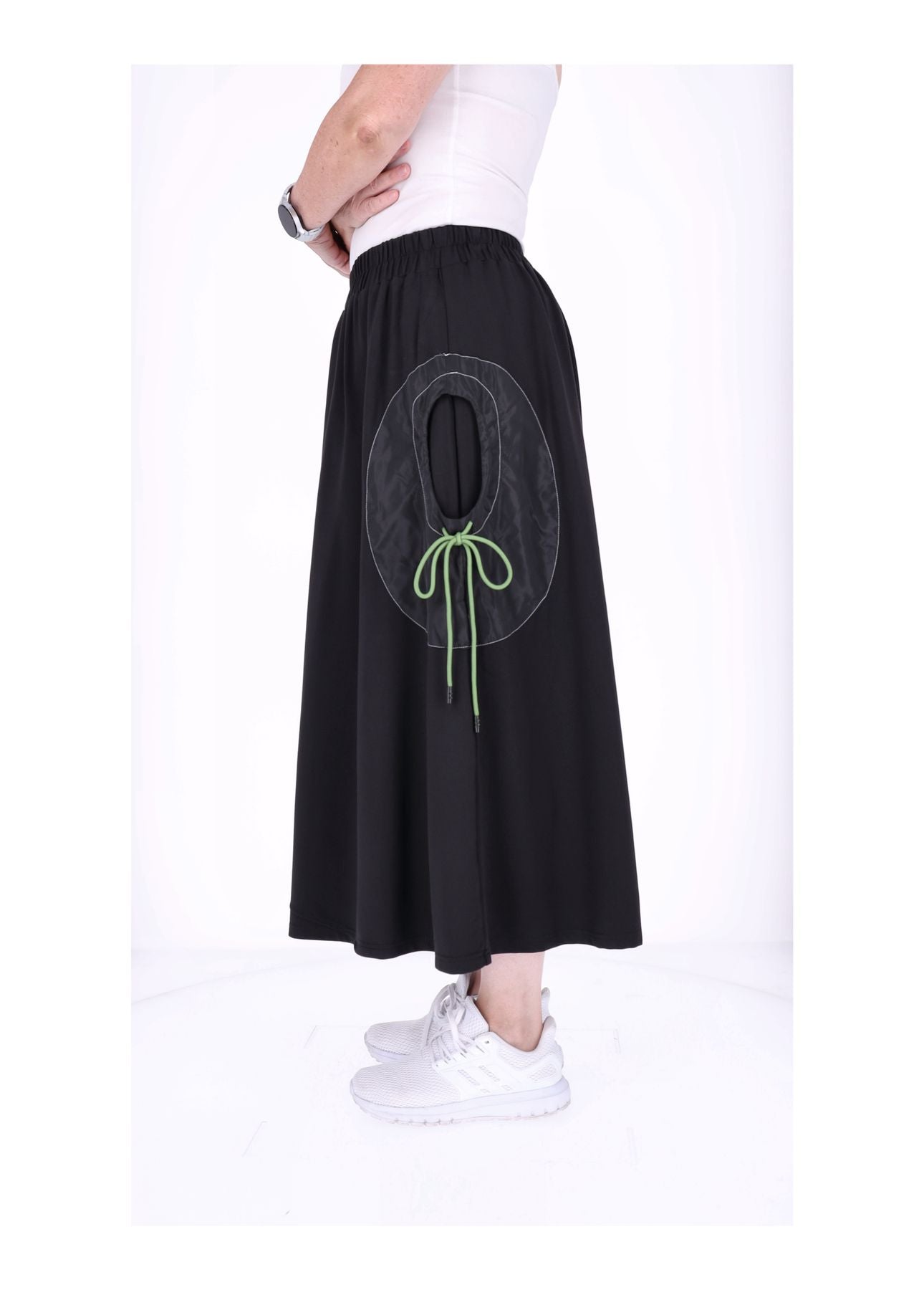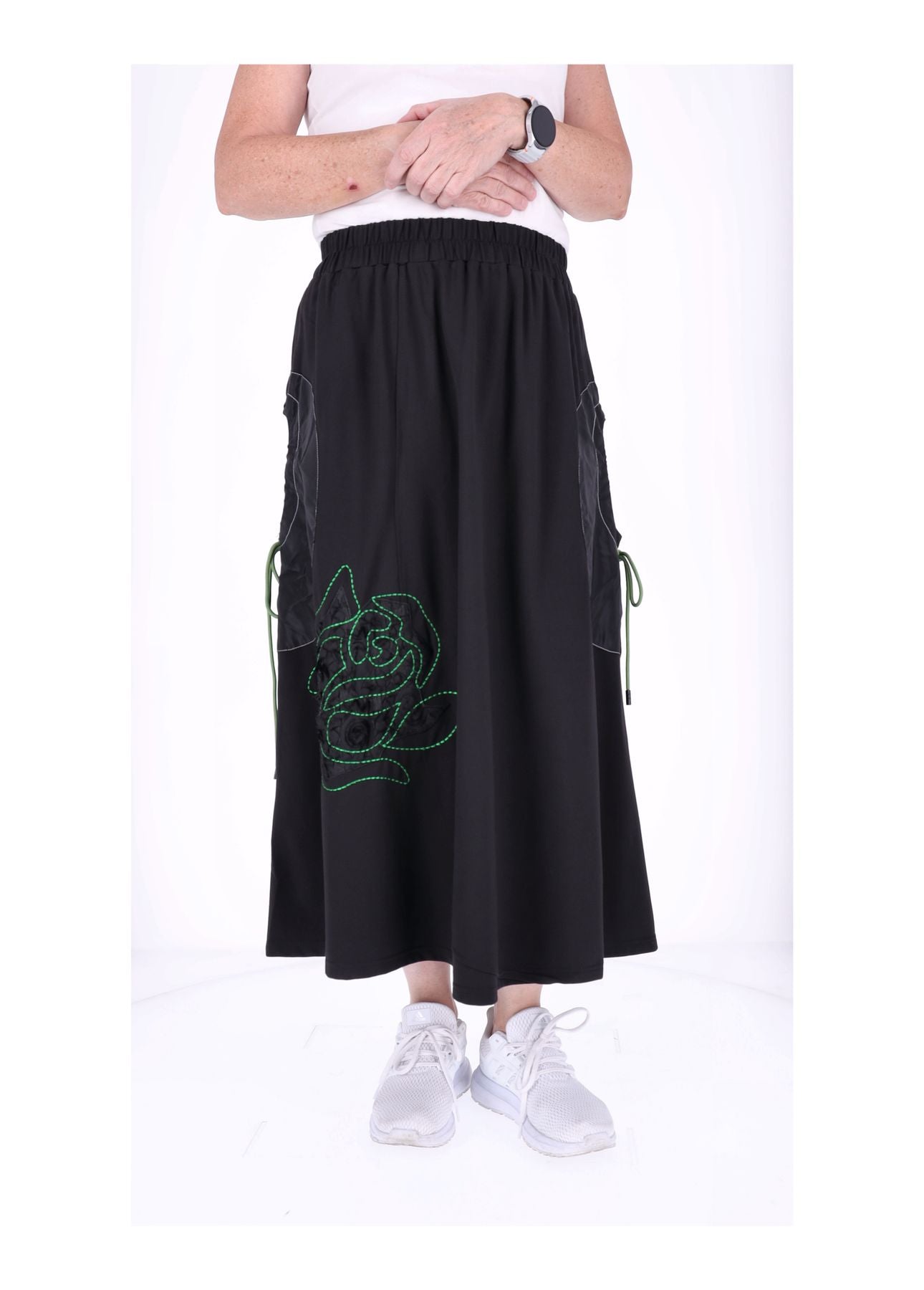 Das besondere Highlight: Eine zarte Blume ist vorne liebevoll gestickt und appliziert, die den Rock zu einem echten Hingucker macht. Die praktischen Taschen links und rechts lassen sich durch ein Zugband raffiniert enger ziehen – so entsteht eine charmante Raffung, die deine Silhouette betont und dem Rock ein individuelles, stylisches Finish verleiht.
