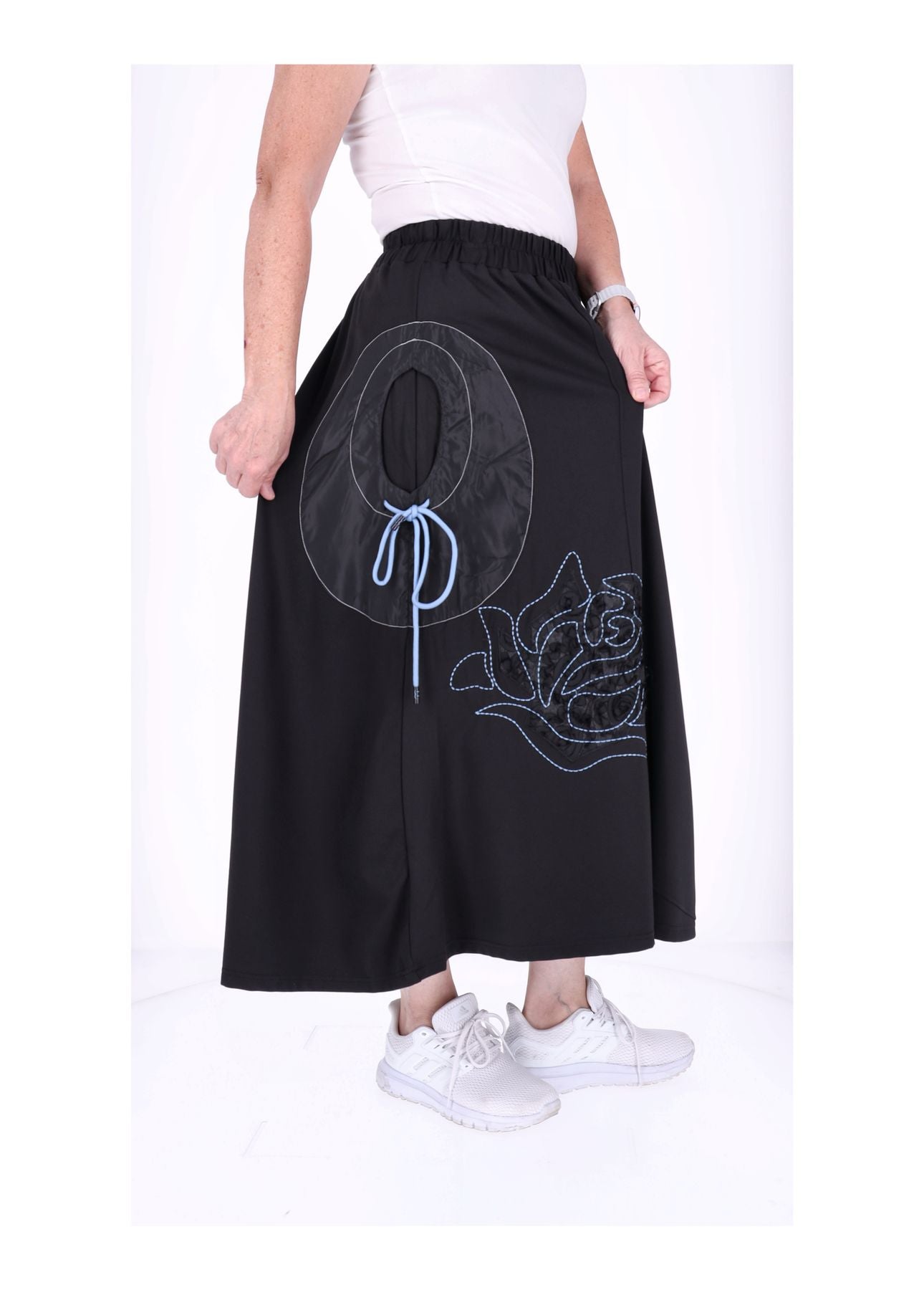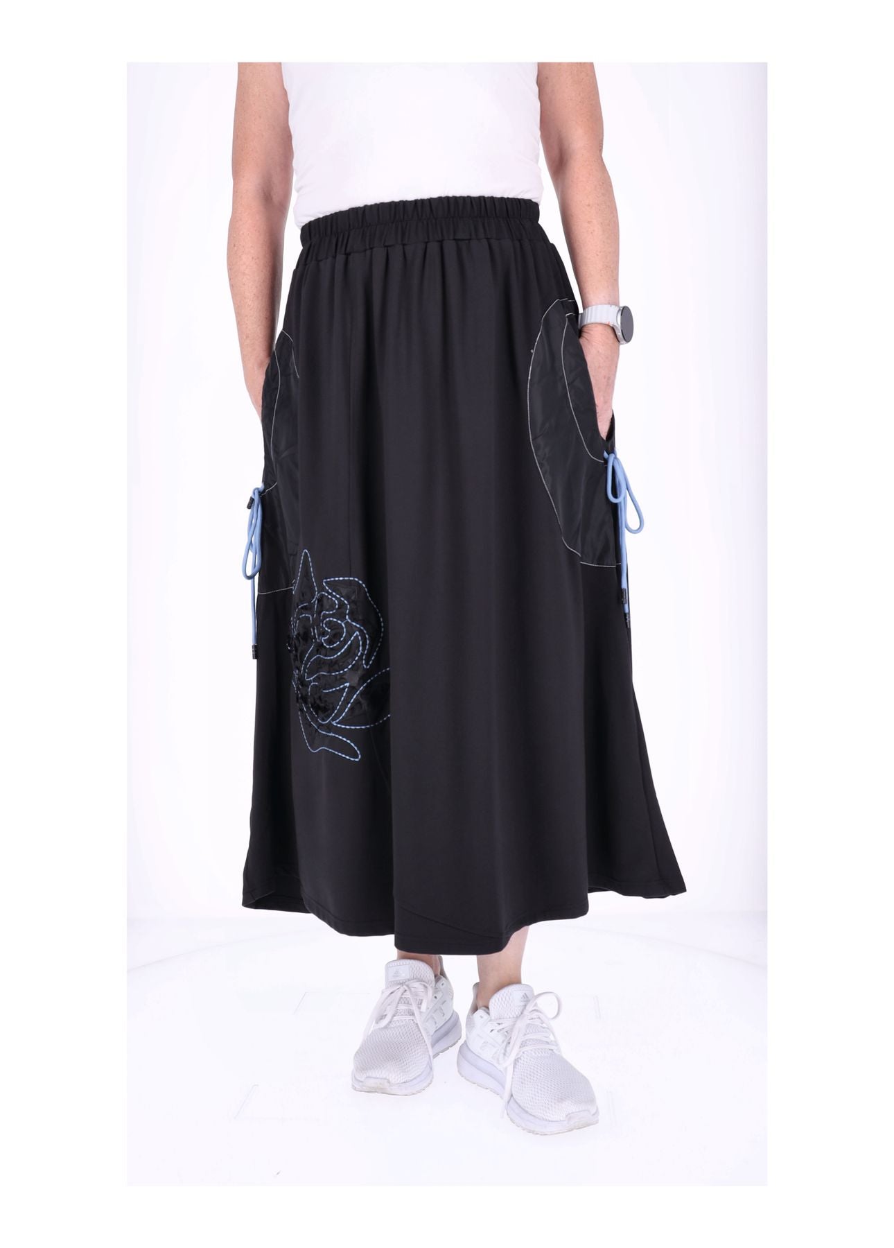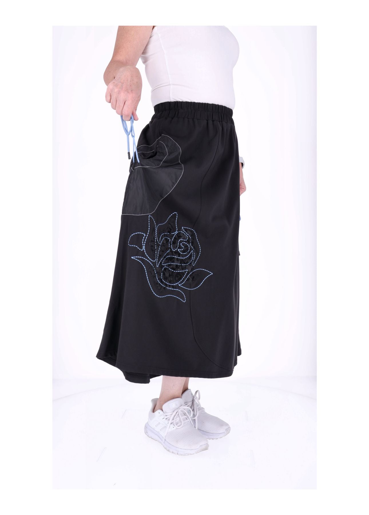 Das besondere Highlight: Eine zarte Blume ist vorne liebevoll gestickt und appliziert, die den Rock zu einem echten Hingucker macht. Die praktischen Taschen links und rechts lassen sich durch ein Zugband raffiniert enger ziehen – so entsteht eine charmante Raffung, die deine Silhouette betont und dem Rock ein individuelles, stylisches Finish verleiht.