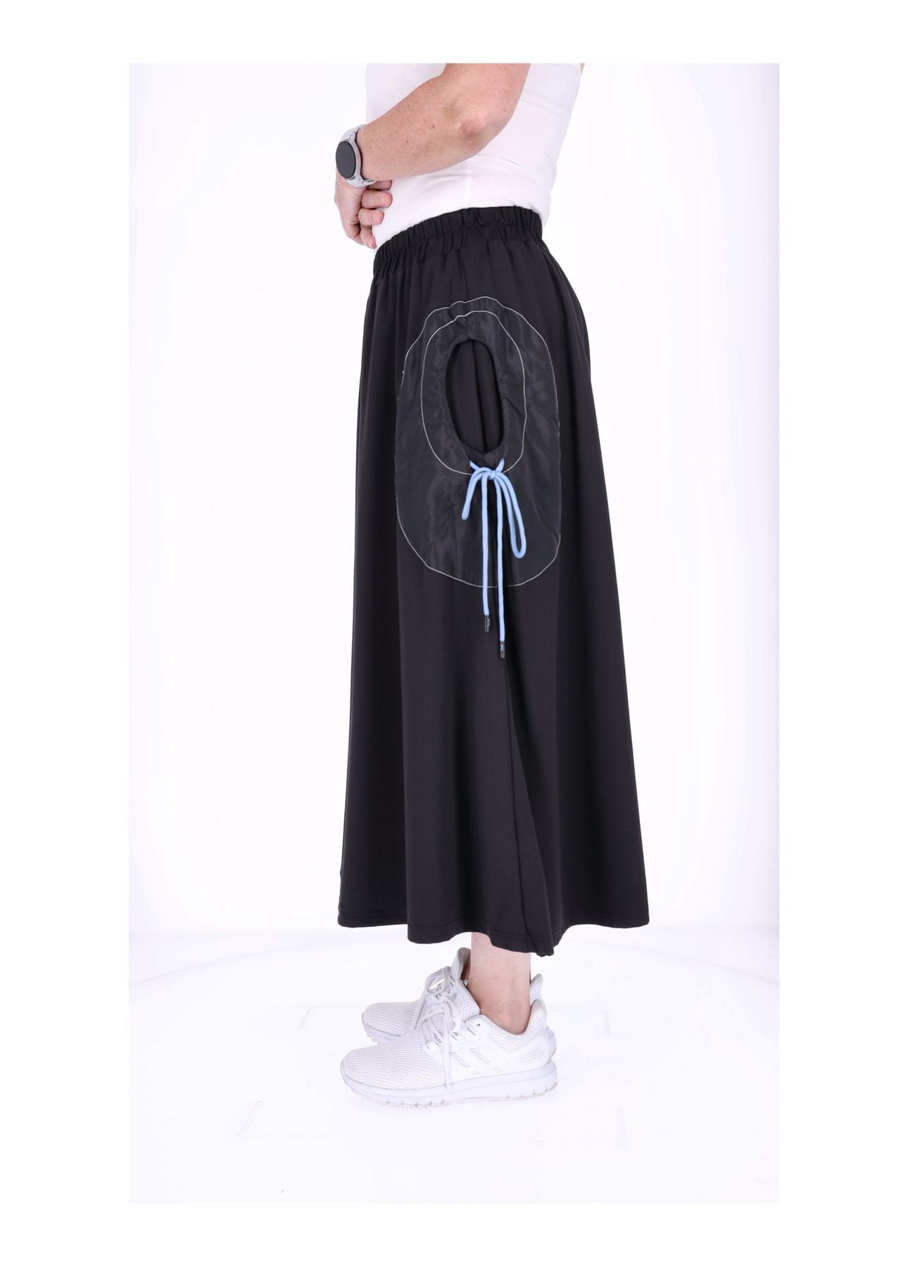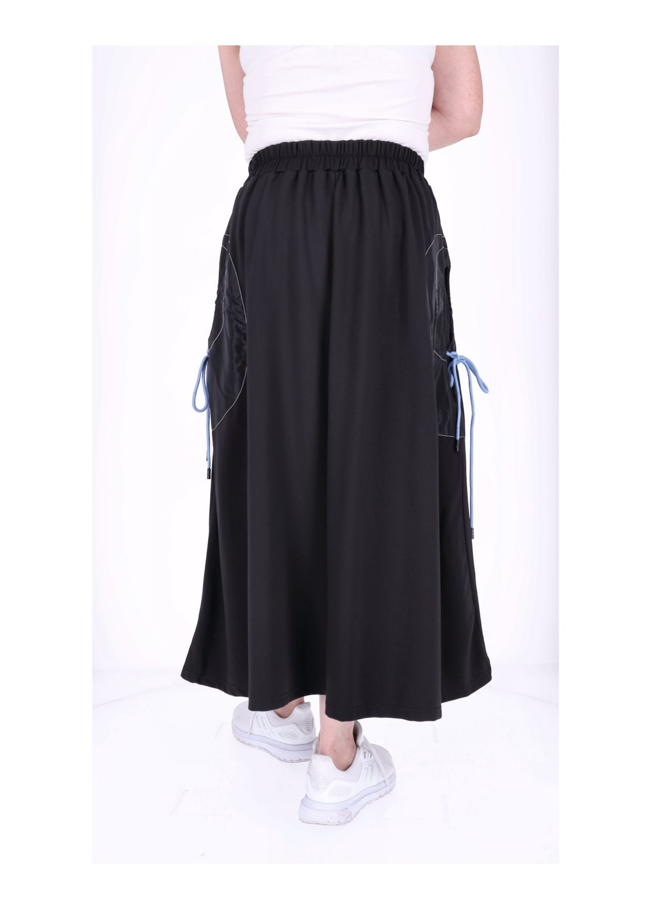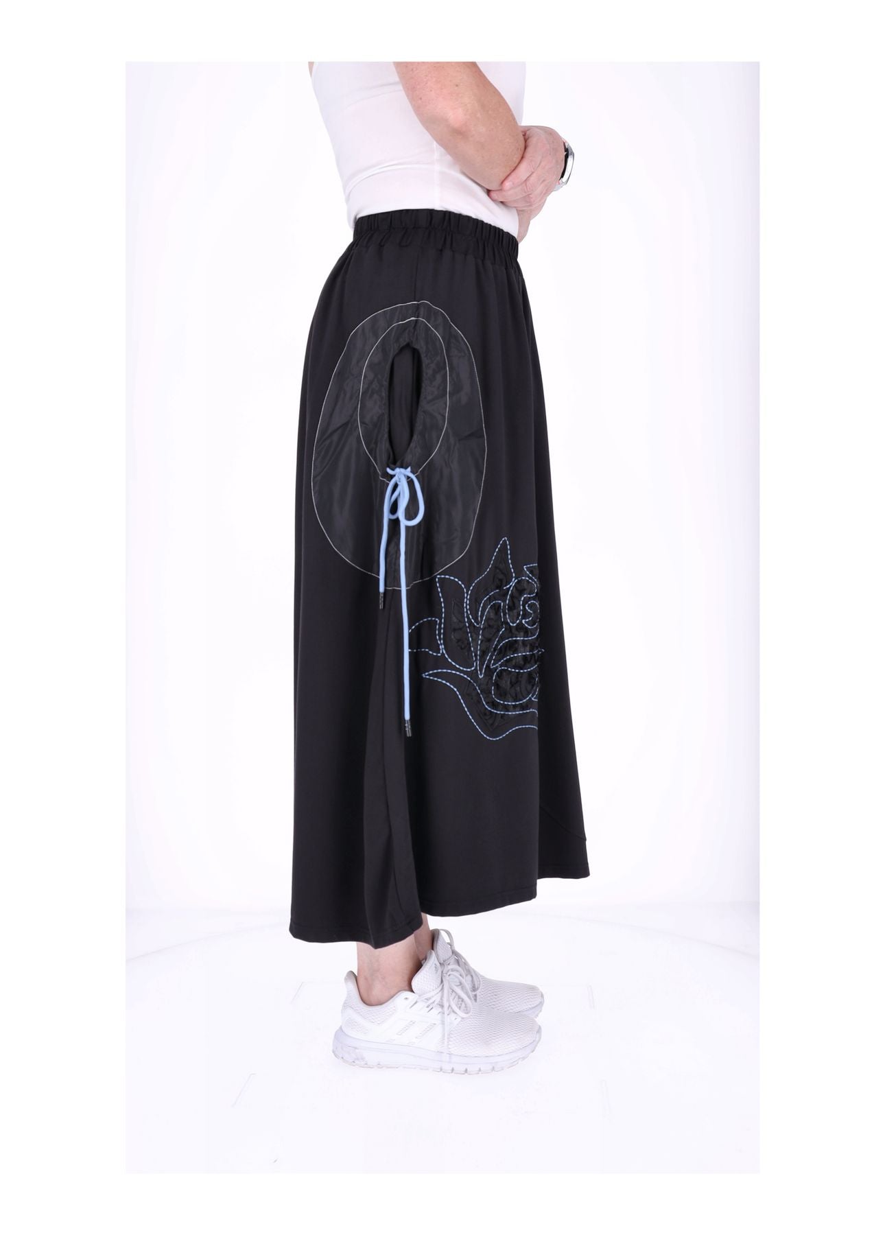 Das besondere Highlight: Eine zarte Blume ist vorne liebevoll gestickt und appliziert, die den Rock zu einem echten Hingucker macht. Die praktischen Taschen links und rechts lassen sich durch ein Zugband raffiniert enger ziehen – so entsteht eine charmante Raffung, die deine Silhouette betont und dem Rock ein individuelles, stylisches Finish verleiht.
