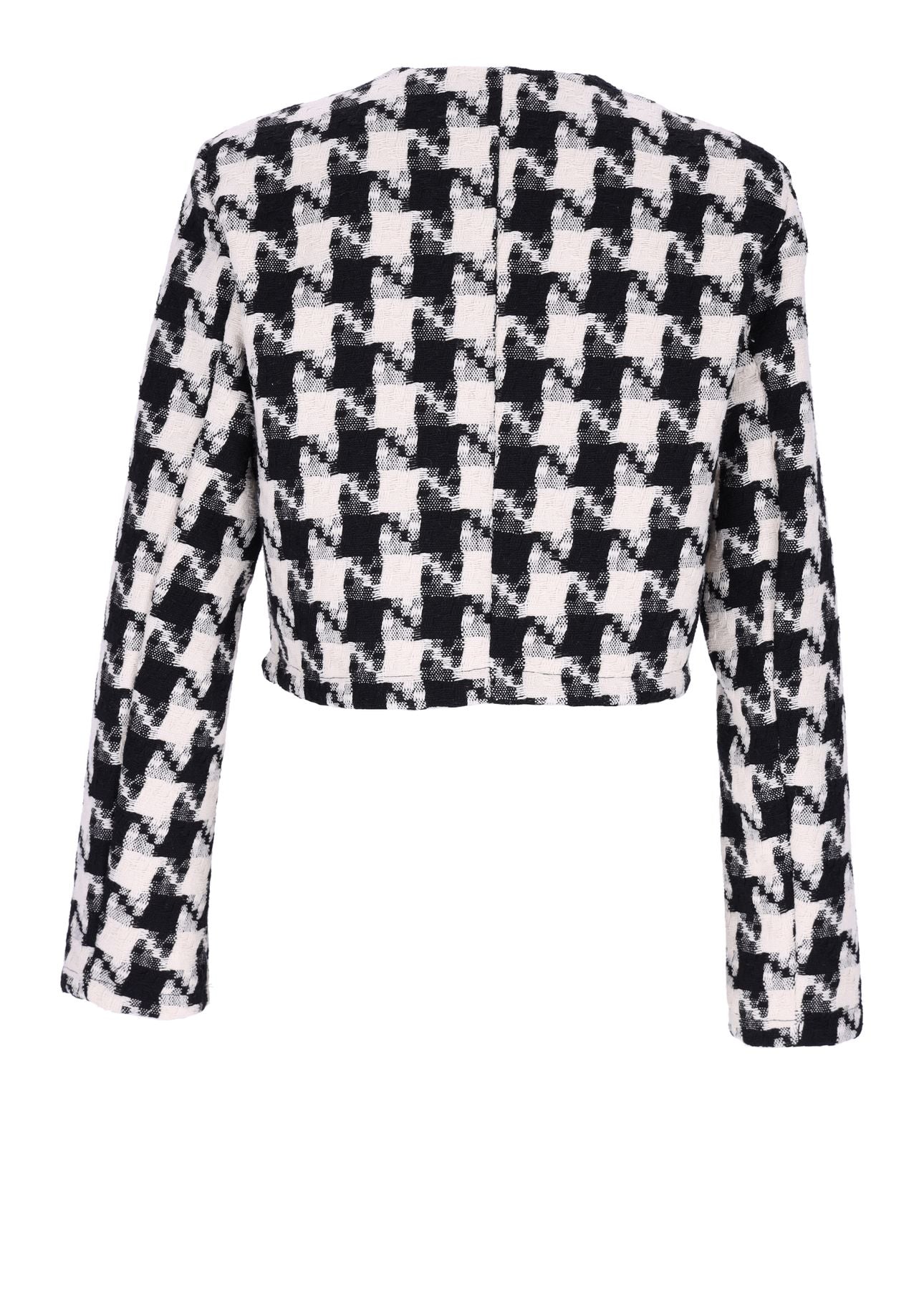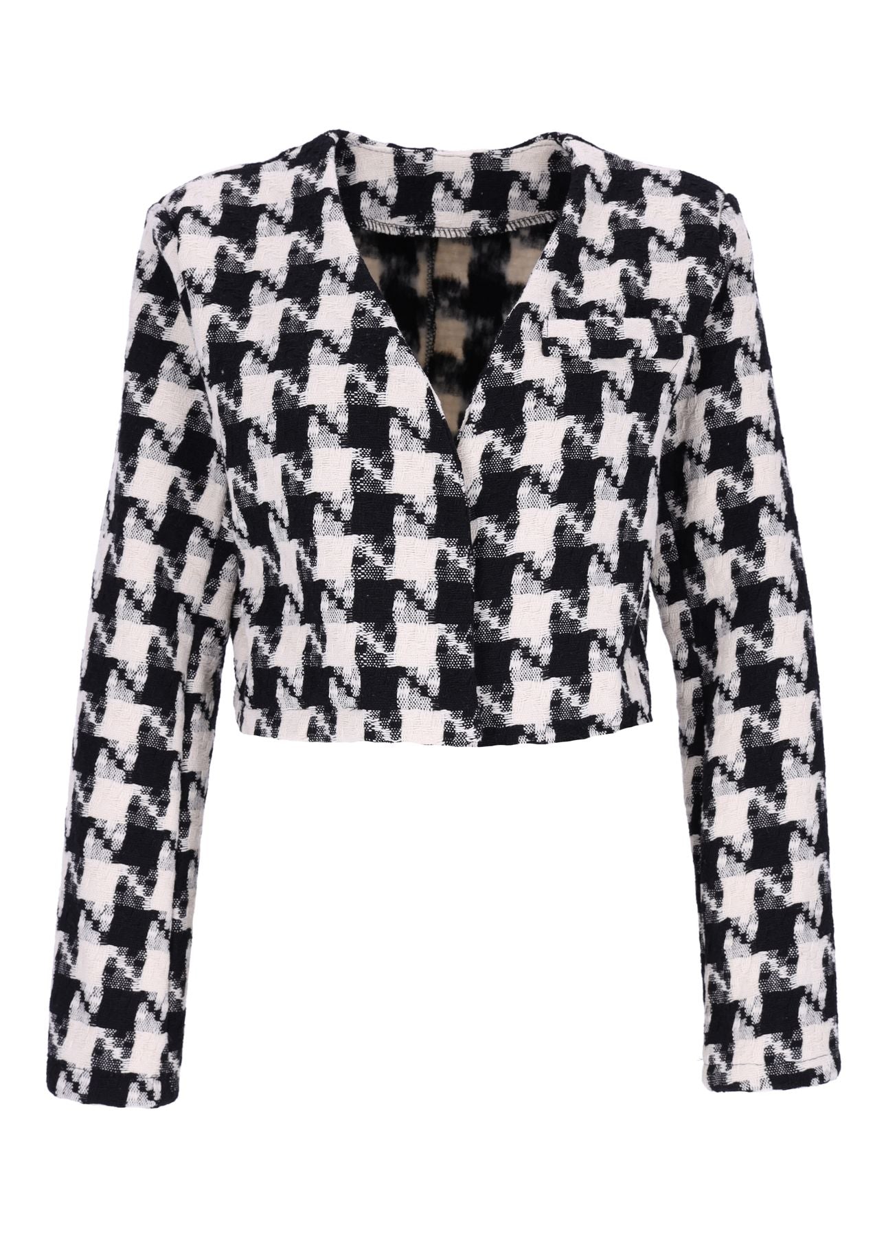 Dieser Damen-Kurzblazer mit klassischem Hahnentrittmuster verleiht jedem Outfit eine zeitlose Eleganz. Die offene Vorderseite betont eine lässige, moderne Silhouette, die sowohl für den Business-Alltag als auch für besondere Anlässe ideal ist. Der Blazer lässt sich vielseitig kombinieren – ob mit einer schlichten Bluse oder einem lockeren T-Shirt