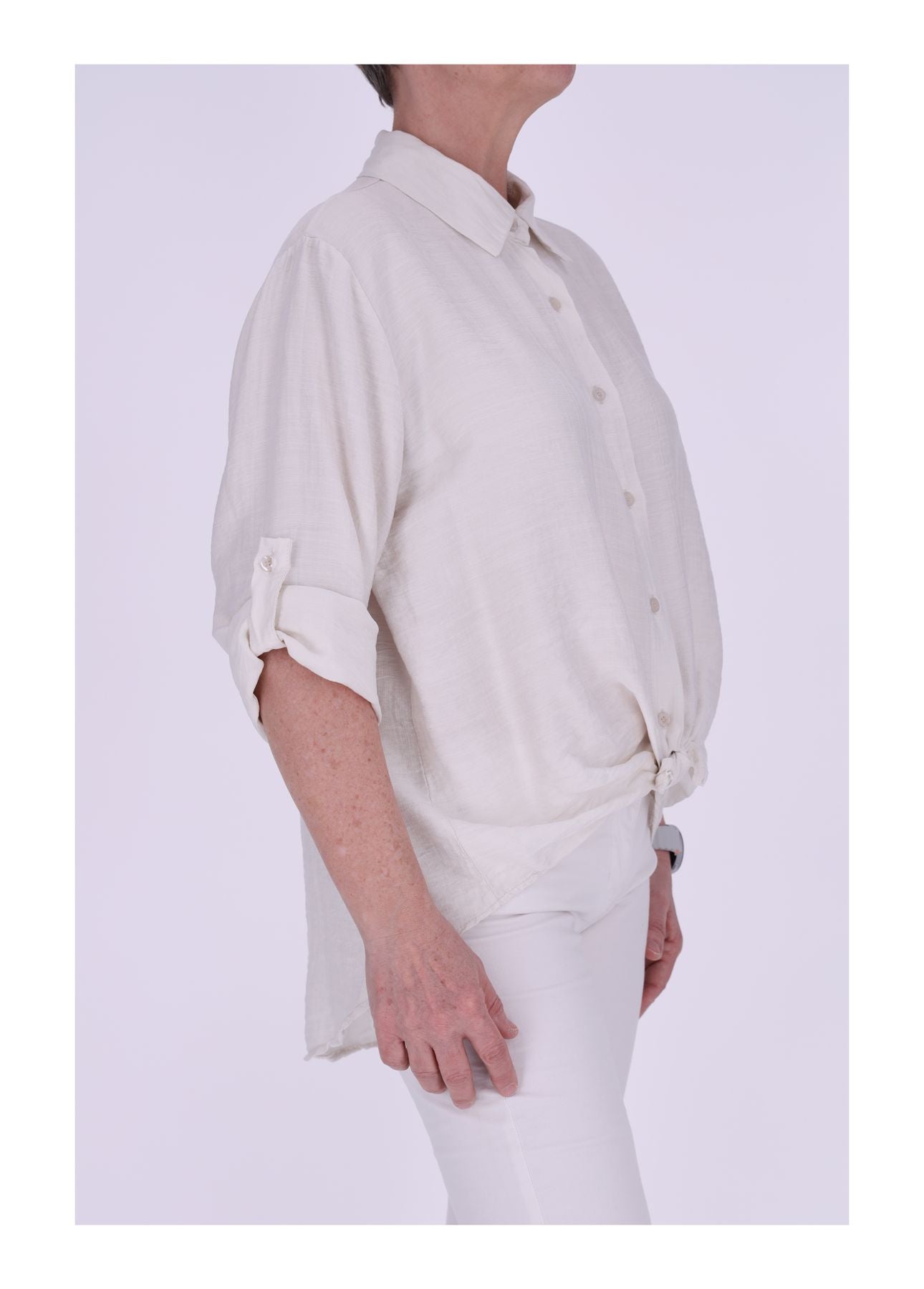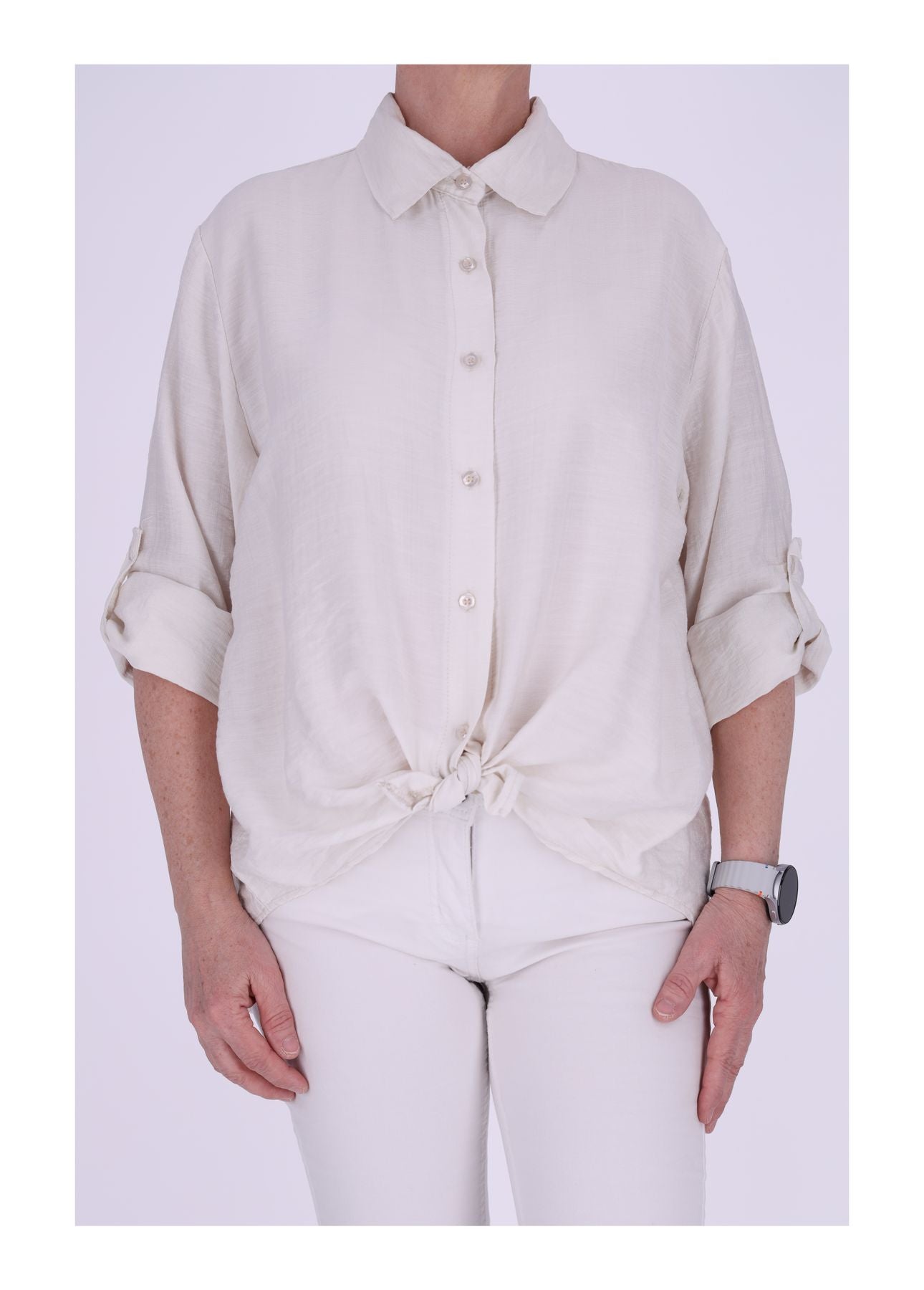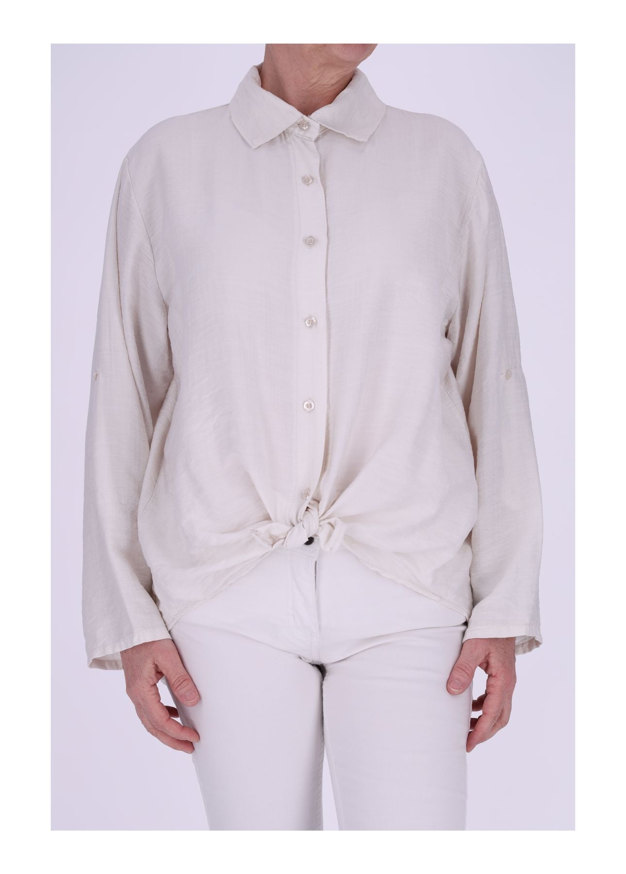 Diese stilvolle Damen Bluse überzeugt mit ihrer leicht strukturierten Stoffqualität und angenehmem Tragekomfort. Die langen Ärmel lassen sich ganz nach Belieben krempeln und fixieren – ideal für einen lässigen Look.