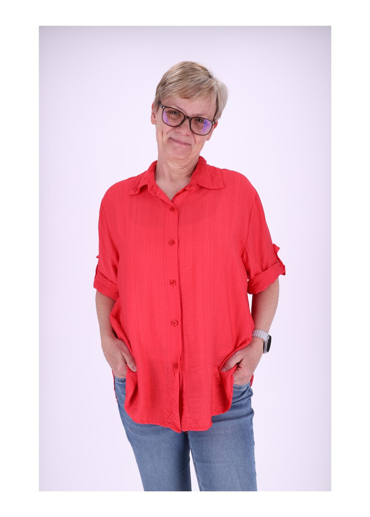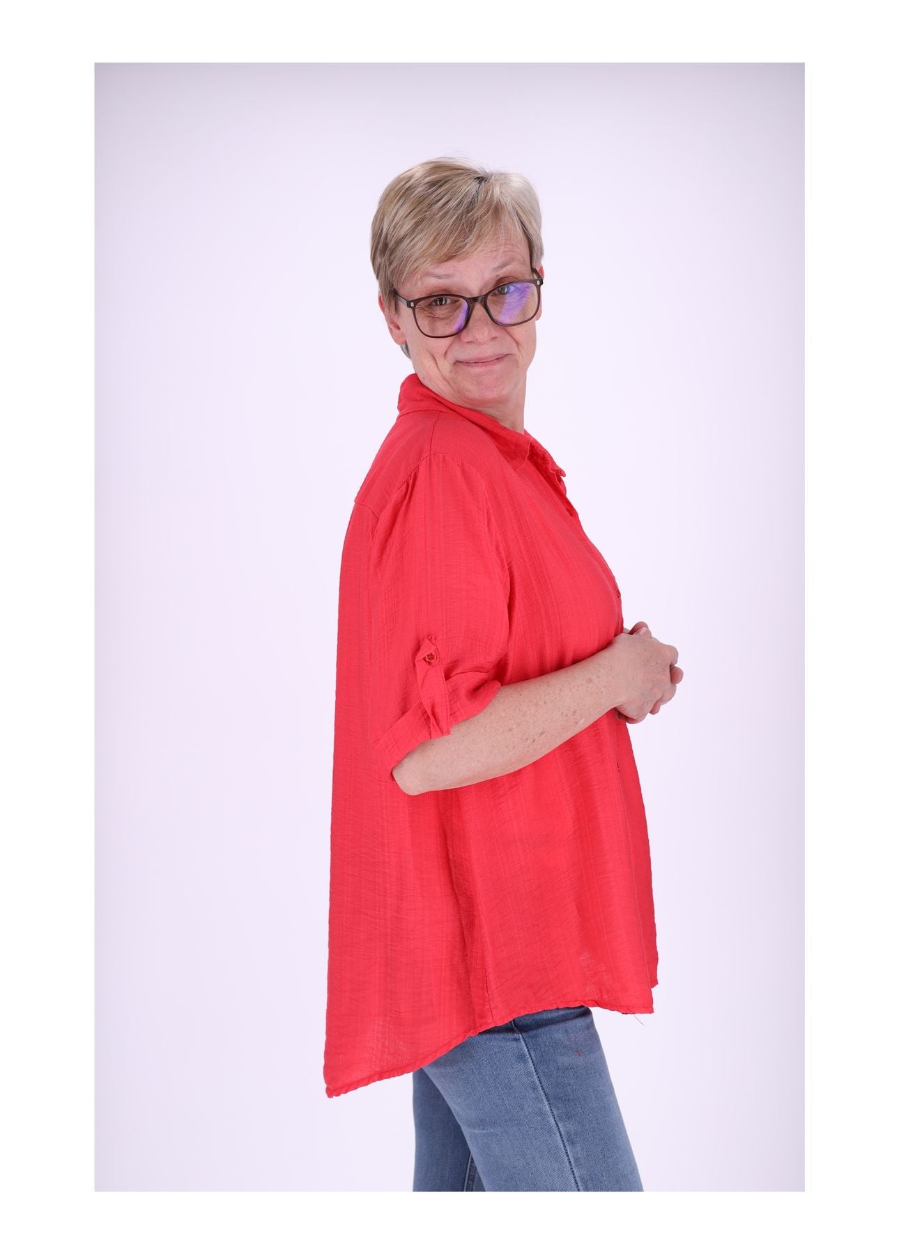 Das längere Rückenteil verleiht der Bluse eine moderne Silhouette und sorgt für zusätzlichen Komfort – ideal für entspannte Sommertage. Mit einer lockeren Passform, die durch den halben Brustumfang von ca. 59 cm und eine Länge von ca. 68 cm vorne sowie ca. 76 cm hinten perfekt zur Geltung kommt, sitzt dieses Modell angenehm und schmeichelhaft.