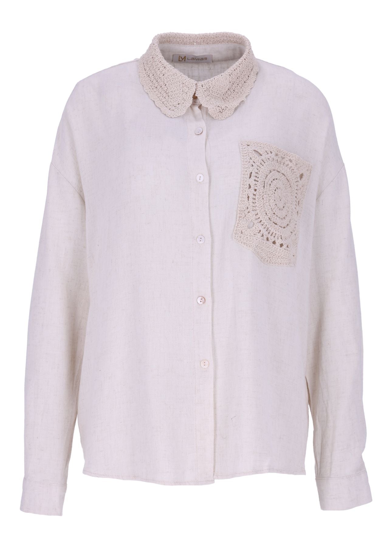 Setzen Sie stilvolle Akzente mit dieser charmanten Damenbluse in Leinenoptik. Das hochwertige Material verleiht der Bluse einen natürlichen, luftigen Look, der perfekt für jede Jahreszeit ist. Der gehäkelte Hemdkragen und die gehäkelte Brusttasche verleihen dem Design eine feminine und elegante Note.