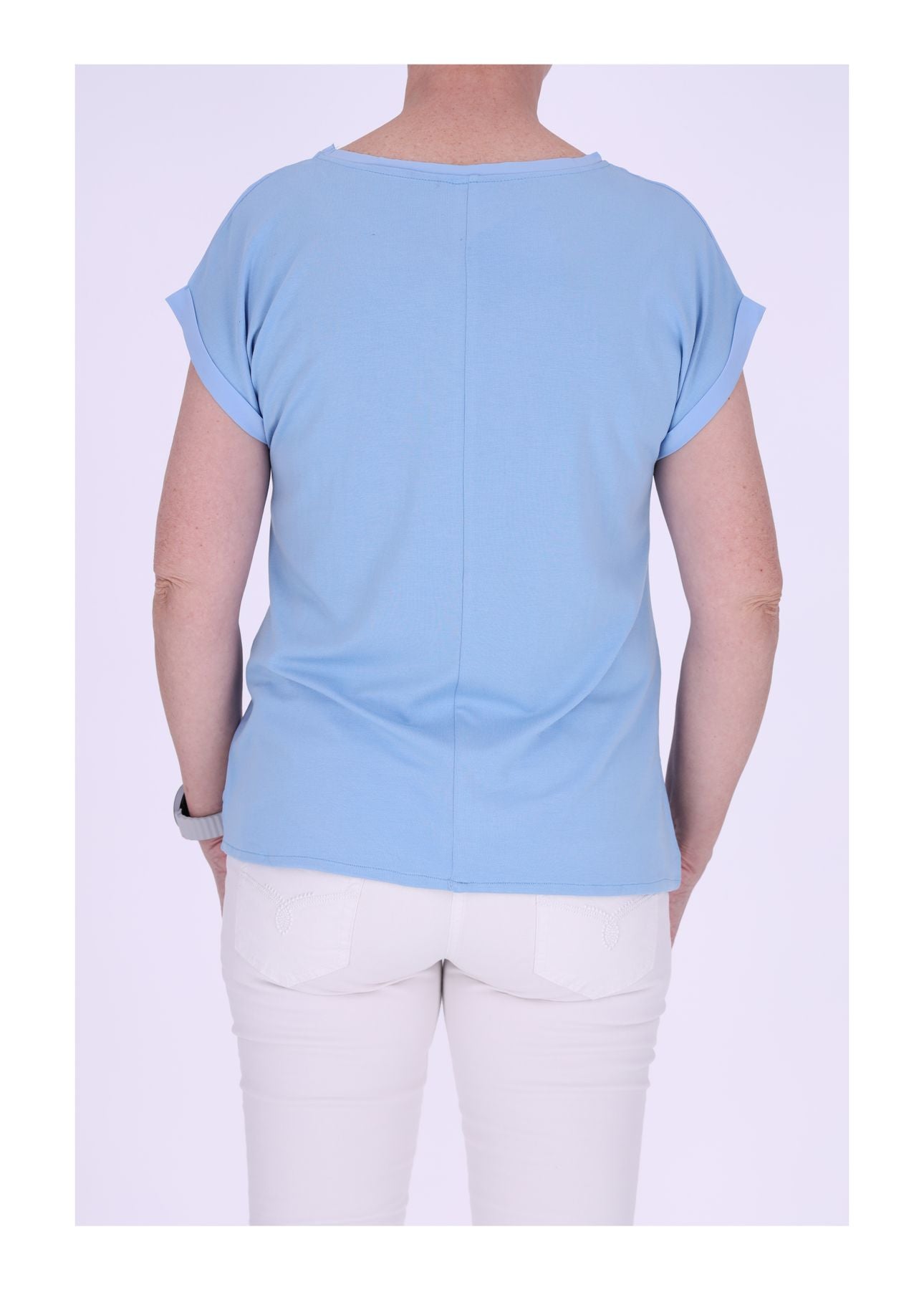 Das weich fallende Damen T-Shirt begeistert mit seinem fließenden Stoff, dem Materialmix und einer eleganten Silhouette. Die geteilte Rückennaht setzt einen dezenten, stilvollen Akzent und verleiht dem Shirt eine besondere Note.