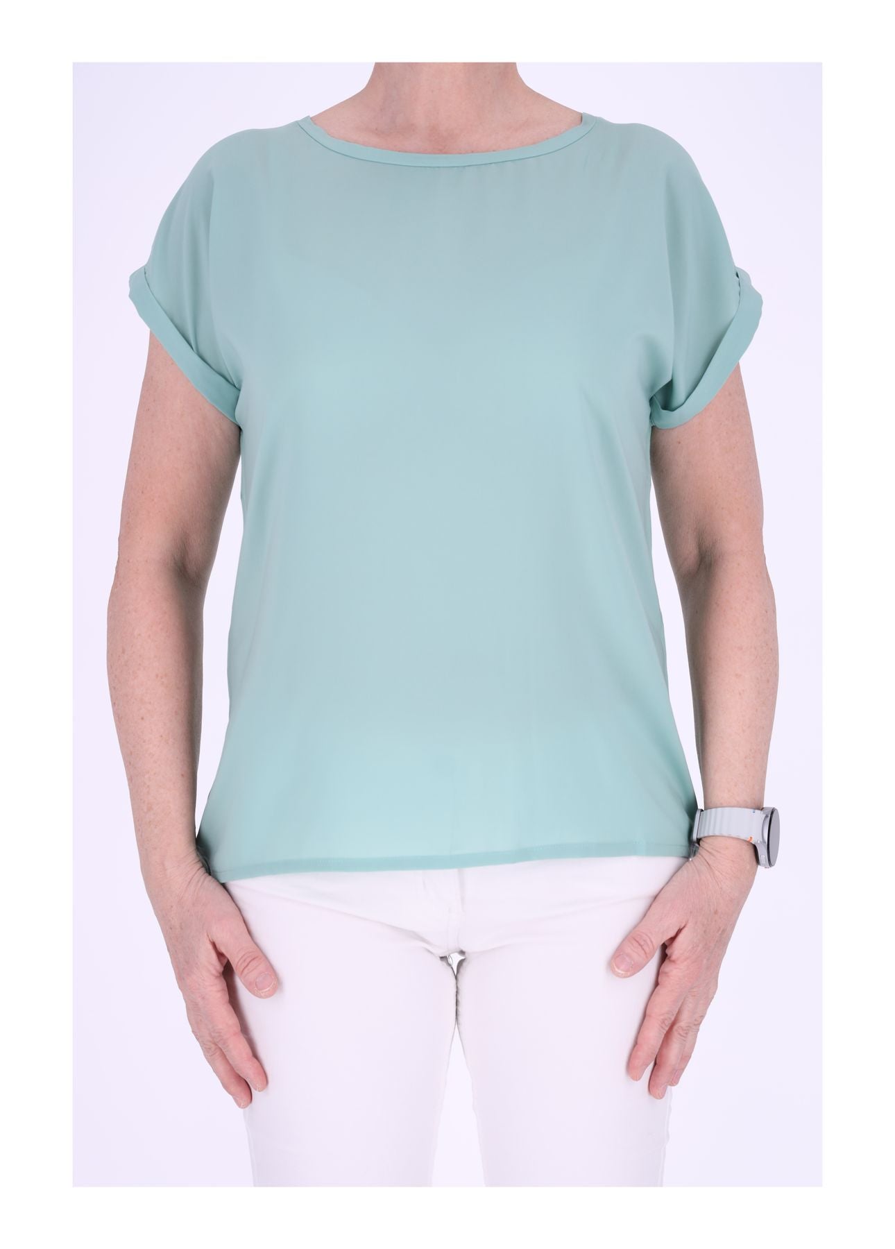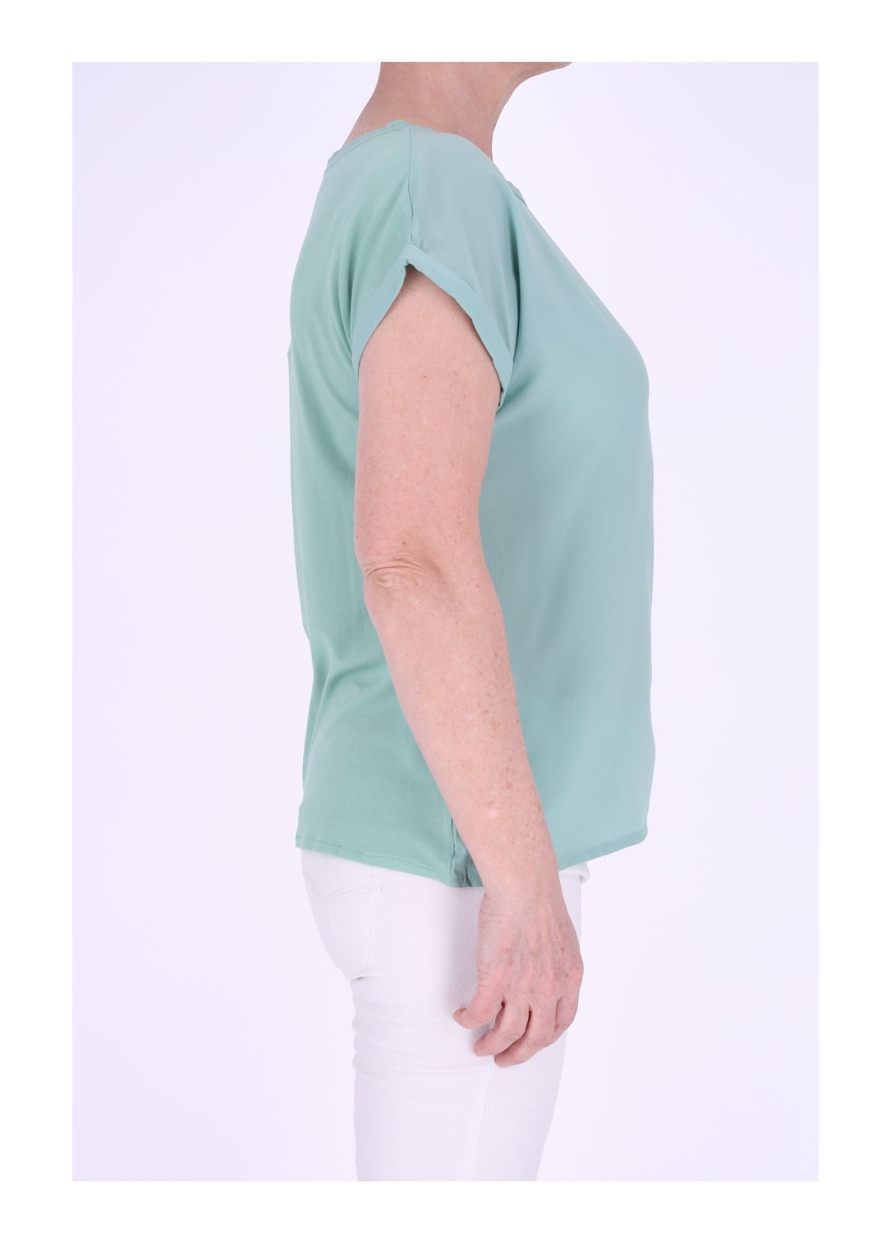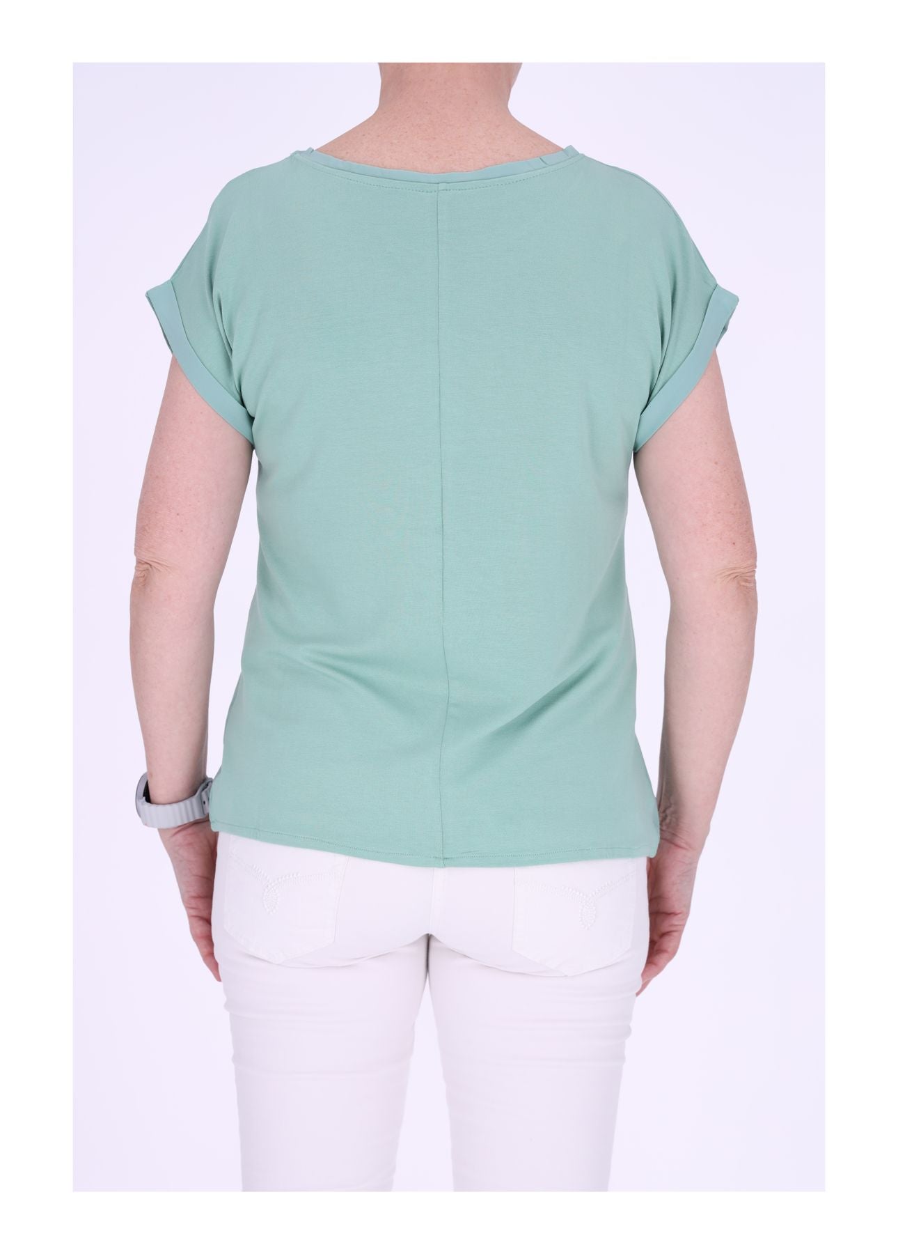 Das weich fallende Damen T-Shirt begeistert mit seinem fließenden Stoff, dem Materialmix und einer eleganten Silhouette. Die geteilte Rückennaht setzt einen dezenten, stilvollen Akzent und verleiht dem Shirt eine besondere Note.