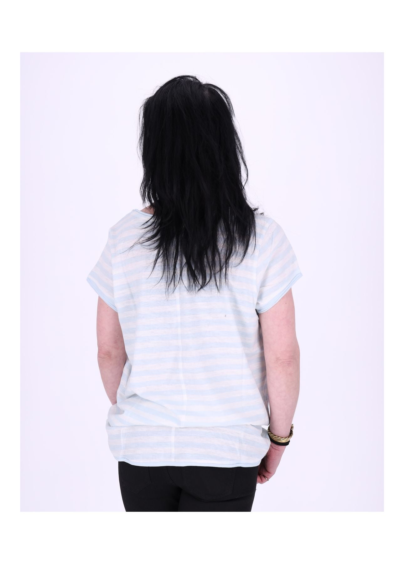 Dieses gestreifte Damen T-Shirt in zarten Pastelltönen vereint frische Farben mit einem modernen Schnitt. Die Teilungsnaht im Rücken und der verlängerte Saum hinten sorgen für eine schmeichelhafte Silhouette – ideal für sommerliche Casual-Looks.